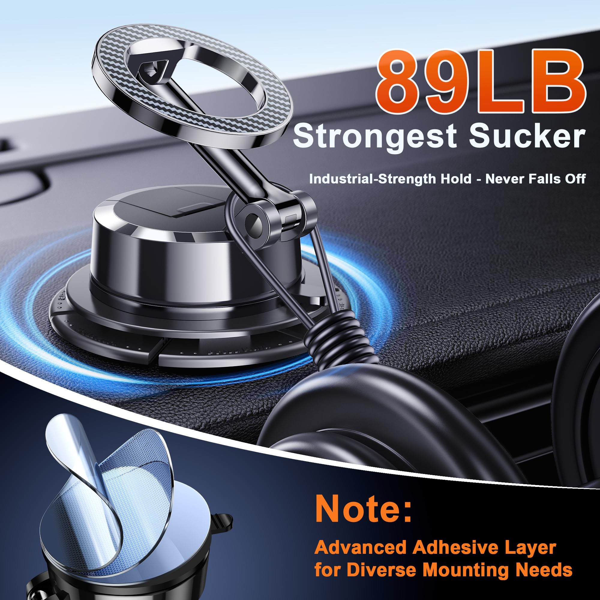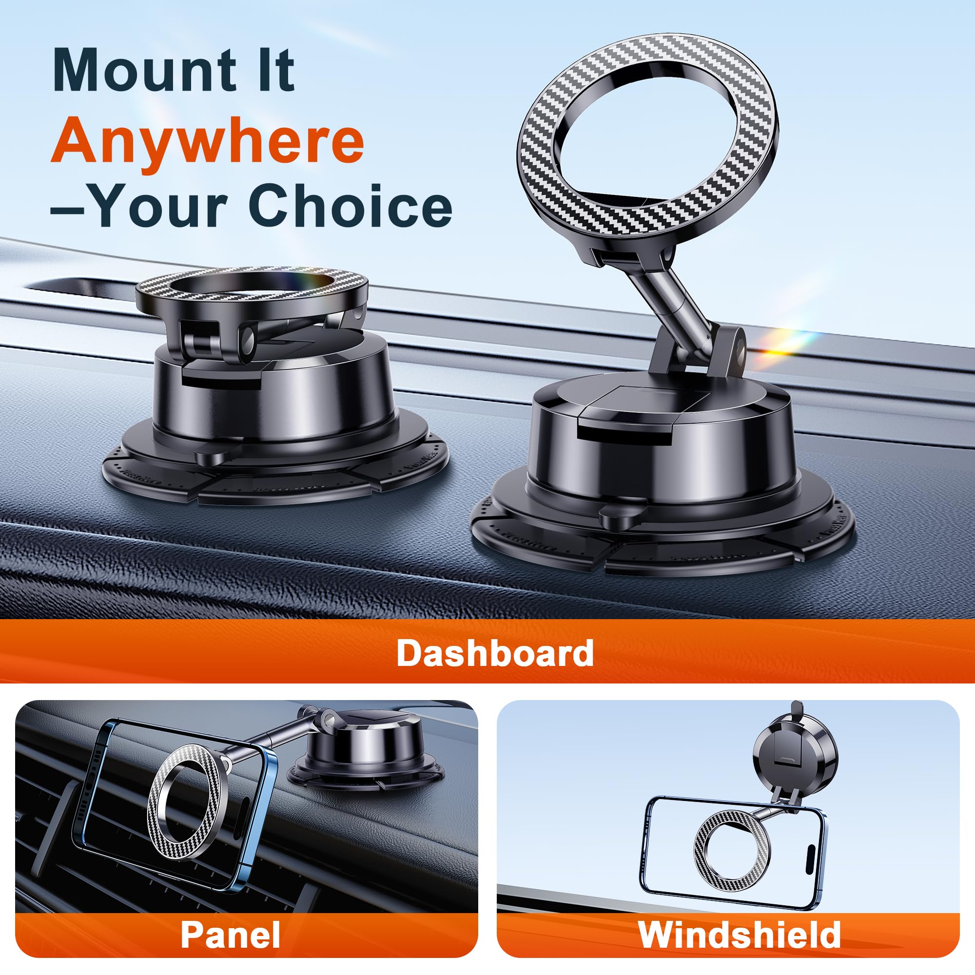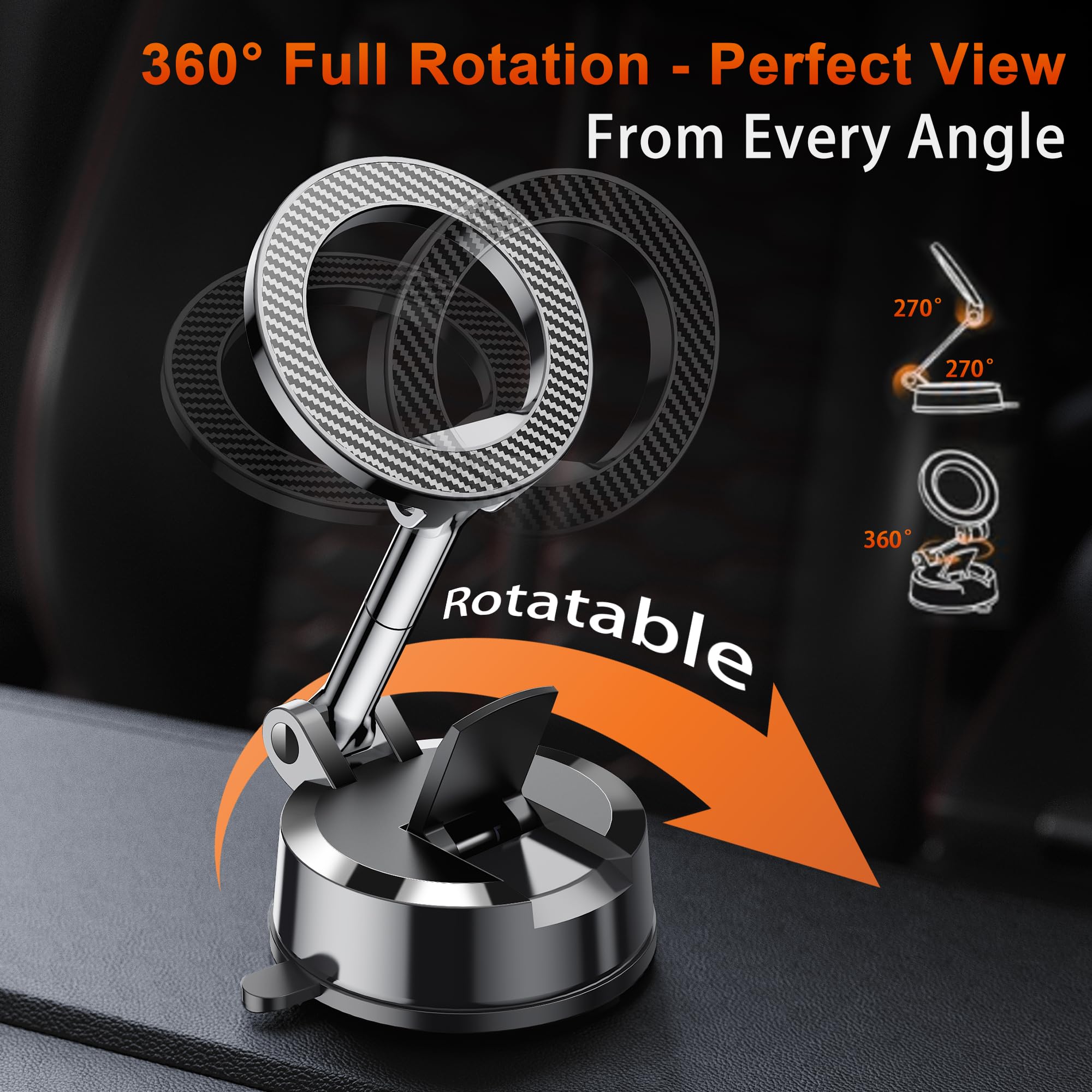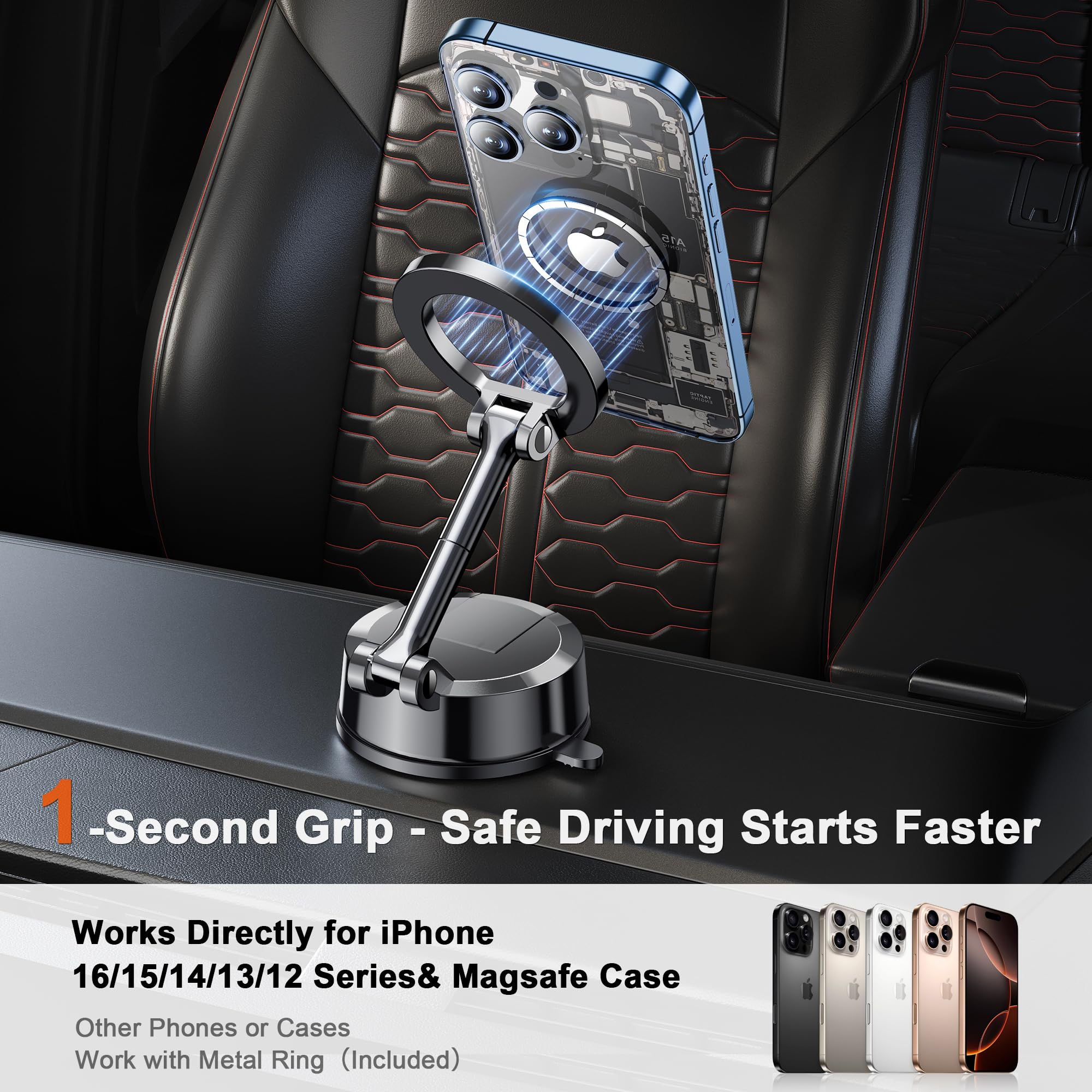 【2025 Ultimate for MagSafe Car Mount】Engineered for iPhone 16/15/14/13/12 Pro Max/Mini and all for MagSafe-certified cases, our mount delivers instant snap-on alignment with 30 upgraded N55 magnets. Even bulky Android phones stay secure with the included 3M-adhesive metal ring (attaches to any case). No wobbling, no drops—even during sharp turns or off-road driving Cell Phone Cradles.