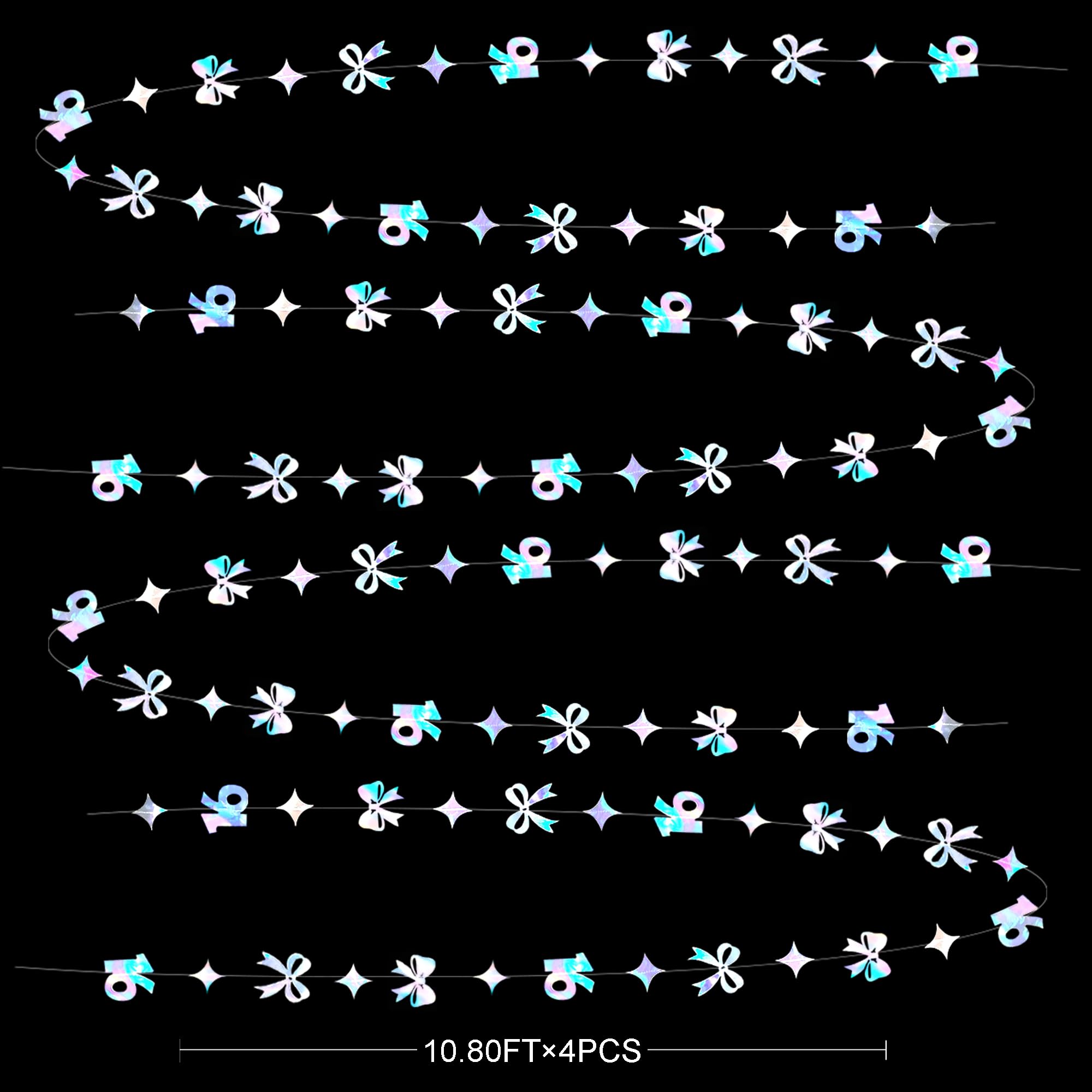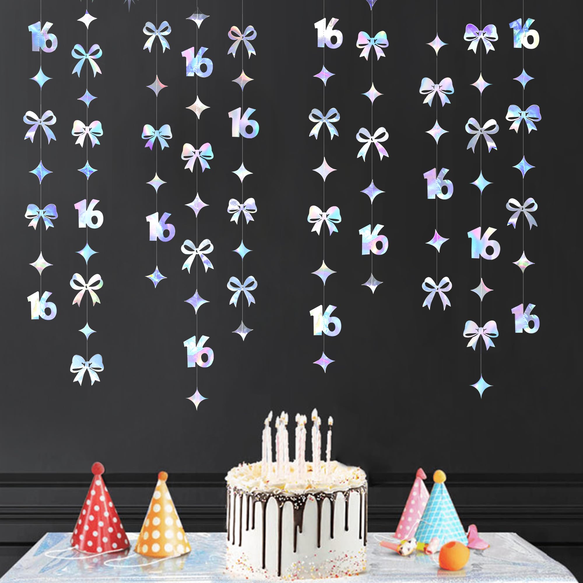 👍 Package includes - 4 strings of 10.8 feet/3.3 meters iridescent number 16 and conquette bow with sparkling twinkle star and circle dots garlands , totally is 43.2 feet/13.2 meters