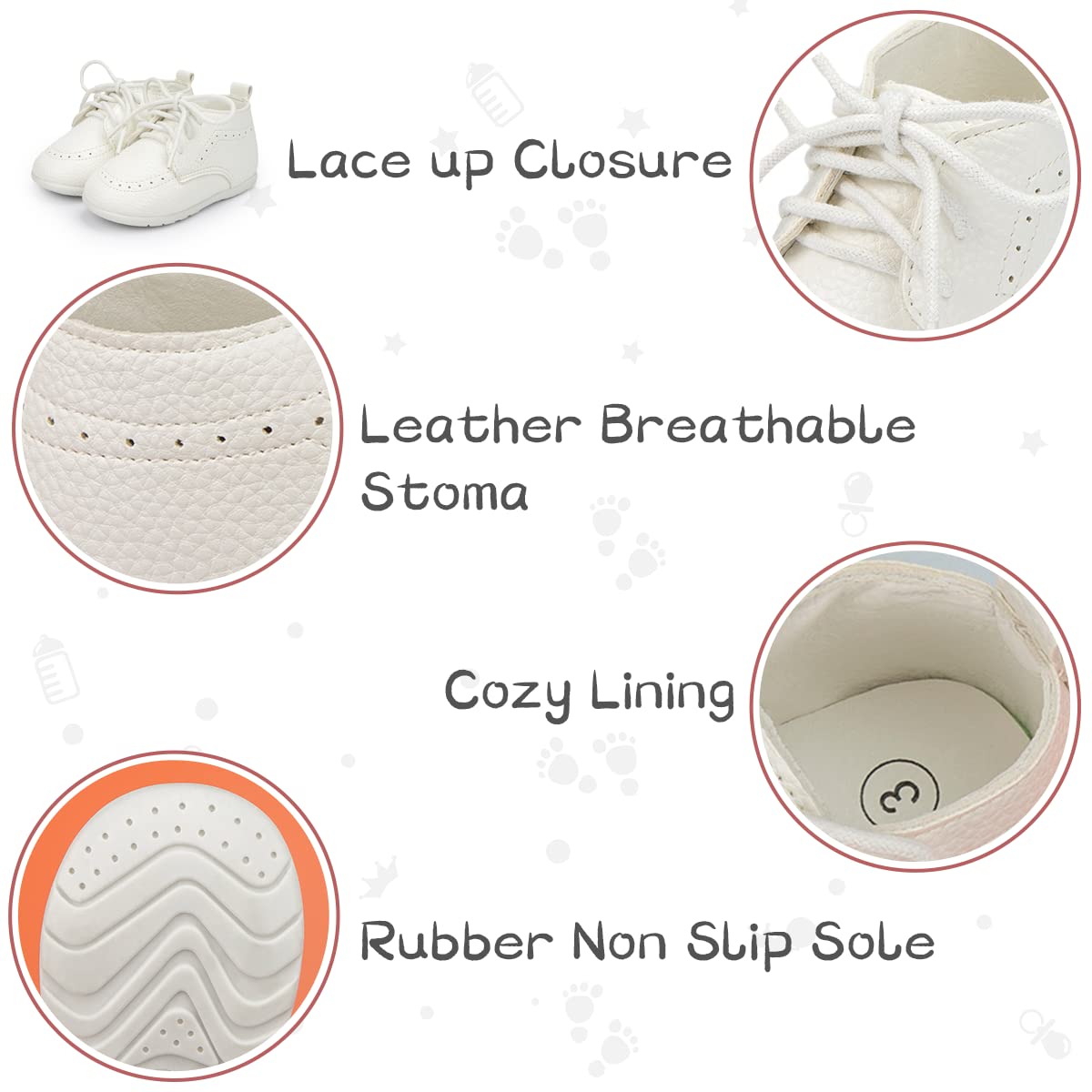 Easy Wear & Non-Slip: Soft and non-slip sole good for baby’s feet to learning walking, help him have some grip when standing or walking. Lace-up closure can adjust tightness to suit babies with different foot shapes. Easy on and off for your child