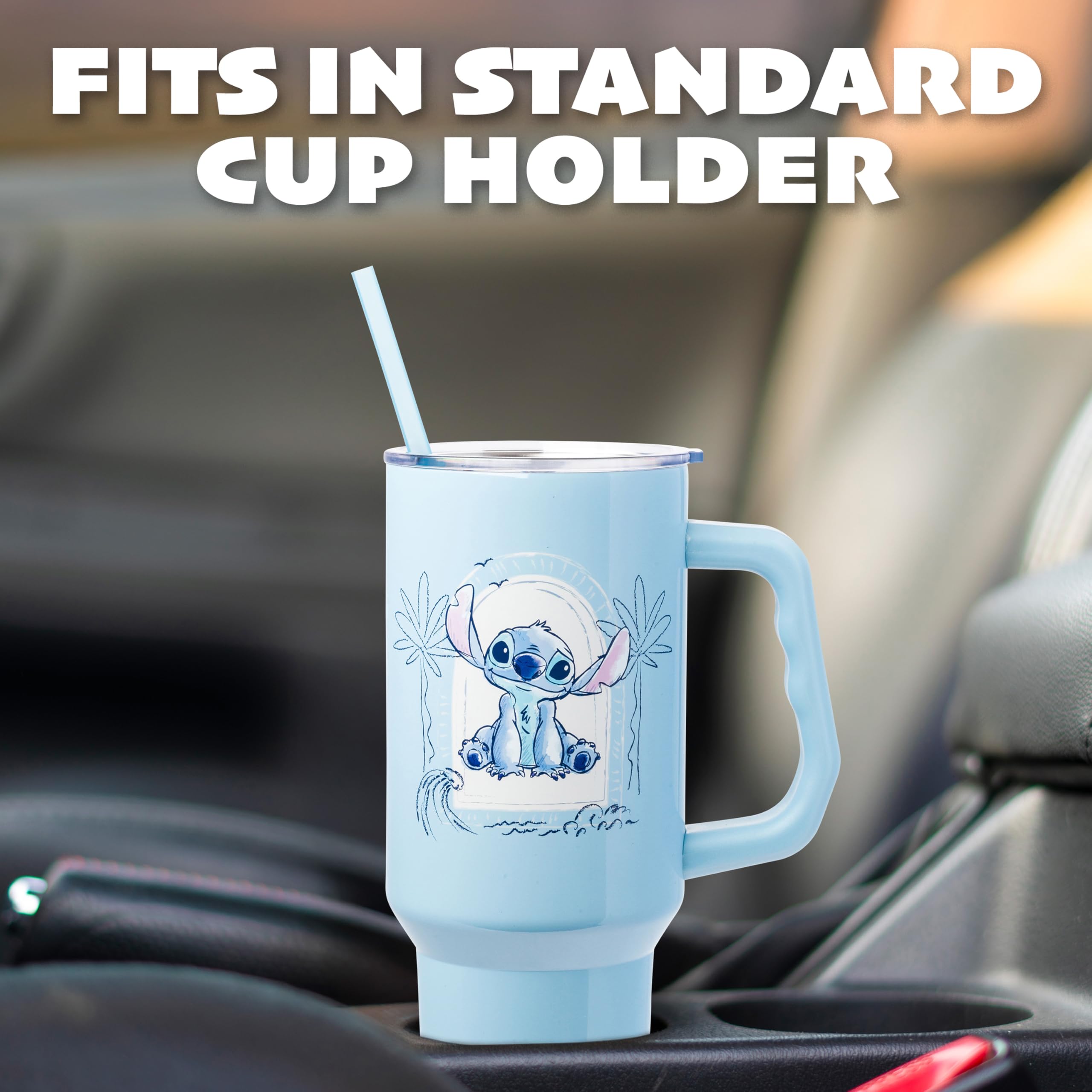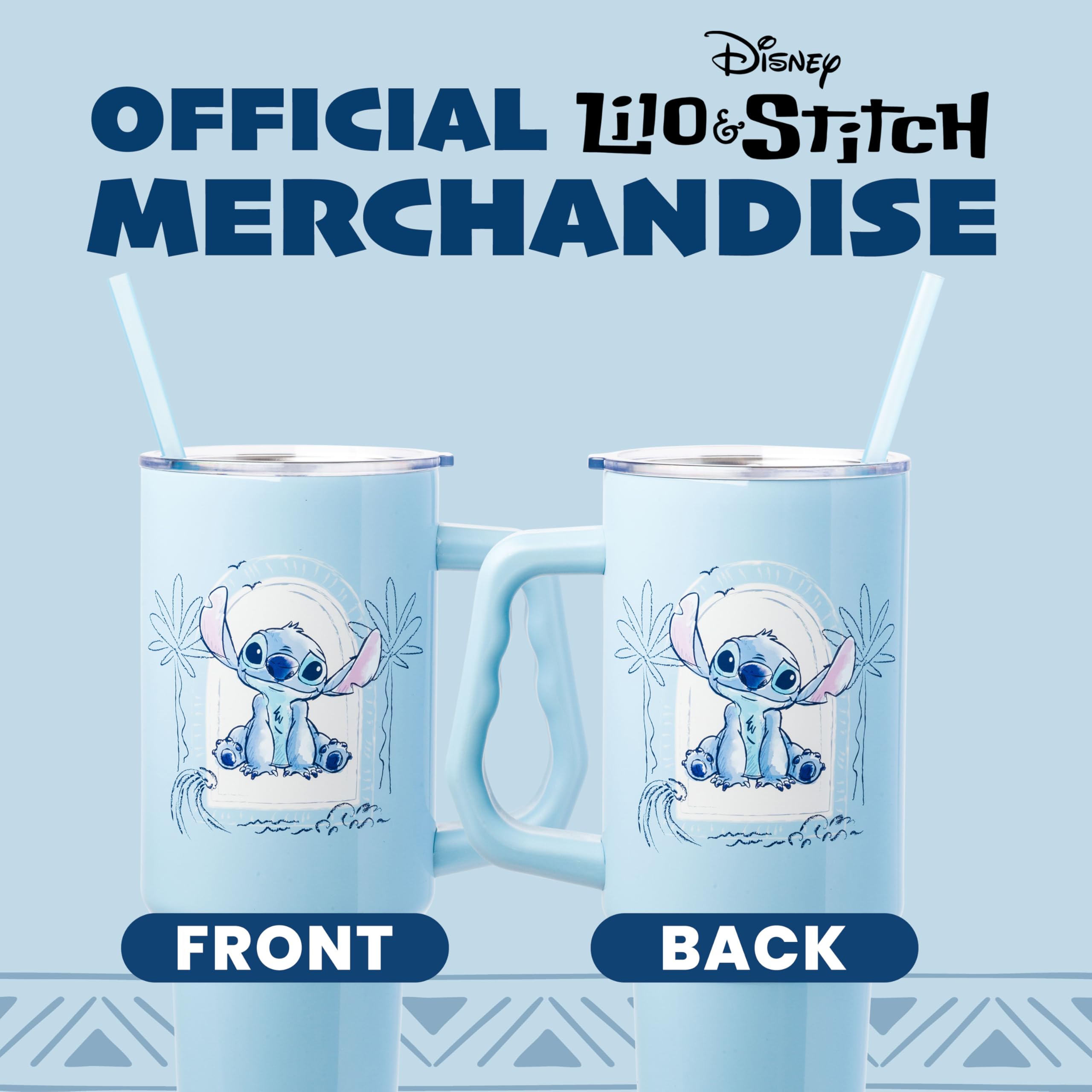 DISNEY TUMBLER: Stainless steel tumbler features Stitch in an adorable pose. Beloved character is surrounded by waves and palm trees. Design is placed on both sides. Tumbler and straw are blue.