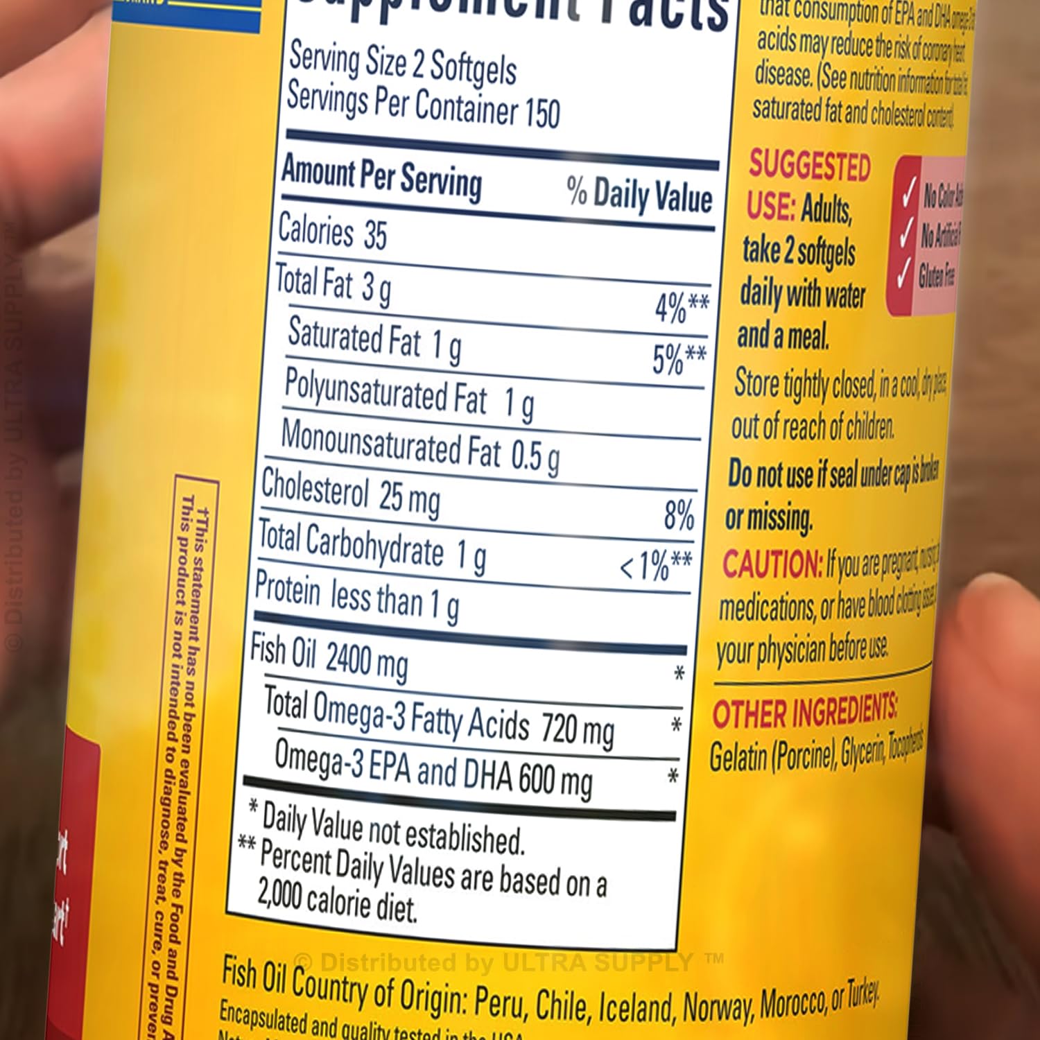 This fish oil supplement provides 1200 mg of fish oil per softgel, delivering 360 mg of Omega-3 fatty acids from EPA and DHA. Each serving supplies a total of 2400 mg of fish oil with 720 mg of combined Omega-3s, making it a straightforward option for daily nutritional supplementation. Sourced from wild-caught ocean fish, the oil is purified to reduce mercury and other unwanted impurities. The 300-count bottle offers a long-lasting supply designed for consistent daily use. Packaged and distributed in the USA by ULTRA SUPPLY.