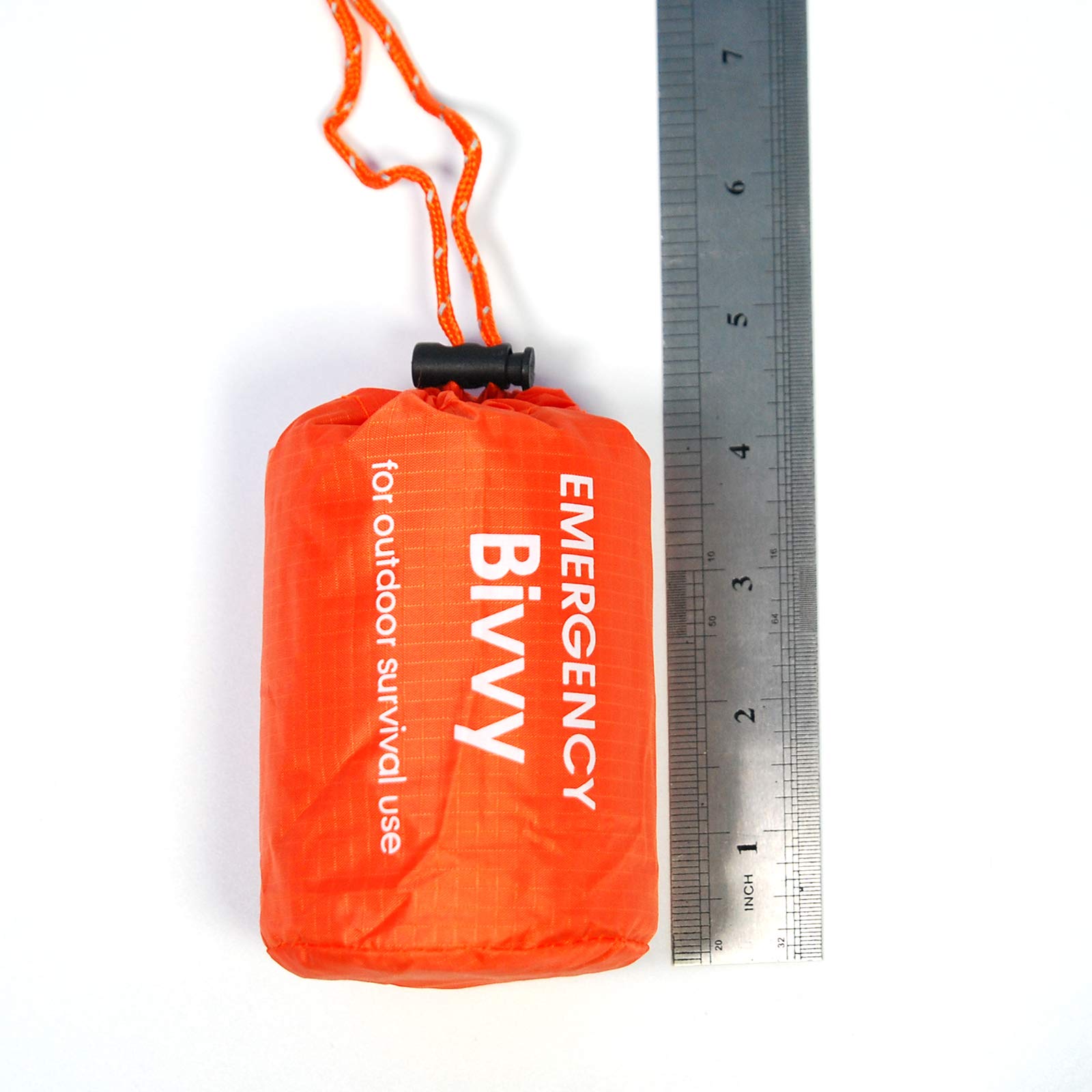 MULTIPURPOSE EMERGEMCY USES -The emergency bivvy bag serves as your emergency blanket, survival shelter, and emergency bivy sack all-in-one. Use as tent footprint, rain poncho, emergency signal, emergency shelter, ground cover, bivouac sack, wind blocker, water collector, snow melt container and so on. The bright orange color survial bivvy sacks can help rescuers to find your location and get quick rescue.