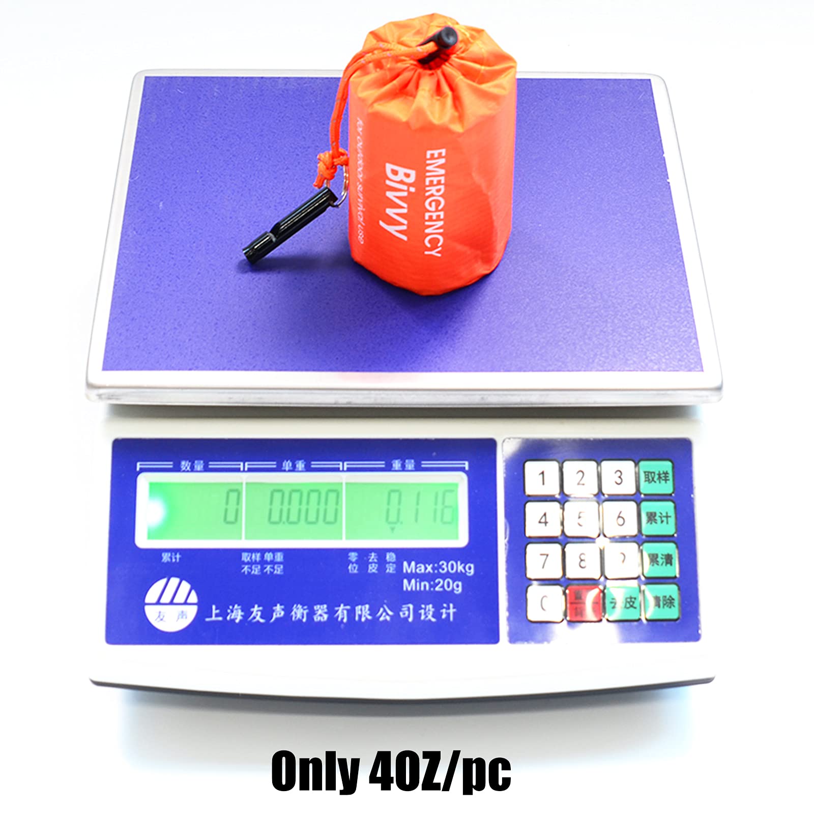 EMERGENCY SLEEPING BAG KIT 8 IN 1 4 Pack emergency sleeping bags survival Bivvy Sack size 36 * 84 inches. 4 Pcs of whistles MADE FOR EMERGENCY Thermal emergency sleeping bags are designed to reflect your body heat back to prevent body temperature losing even save your life in emergencies. Reflective silver with high-visibility orange insulation sleeping bag can also be used as effective shelters or signaling devices in an accident or extreme weather in order to be easier found and rescued. Multiple emergency uses as for tent footprint, rain poncho, emergency signal, emergency shelter, ground cover, bivouac sack, wind blocker, water collector, snow melt container and so on. Premium choice for camping, hiking, mountain climbing, hunting, trekking, backpacking, biking, boating, car rides, outdoor trips and wilderness adventures. LIGHTWEIGHT PORTABLE & EASY CARRY Each Pack emergency sleeping bag is individually packed in a drawstring bag weight 4 oz. Compact packing and portable to carry for outdoor activities and keep storage after every use. Easy to store in your car, backpack, emergency first-aid case, etc. Whistles are easy to carry but useful for emergency use. LITTLE INVESTMENT TO GET BIG INSURANCE NOW