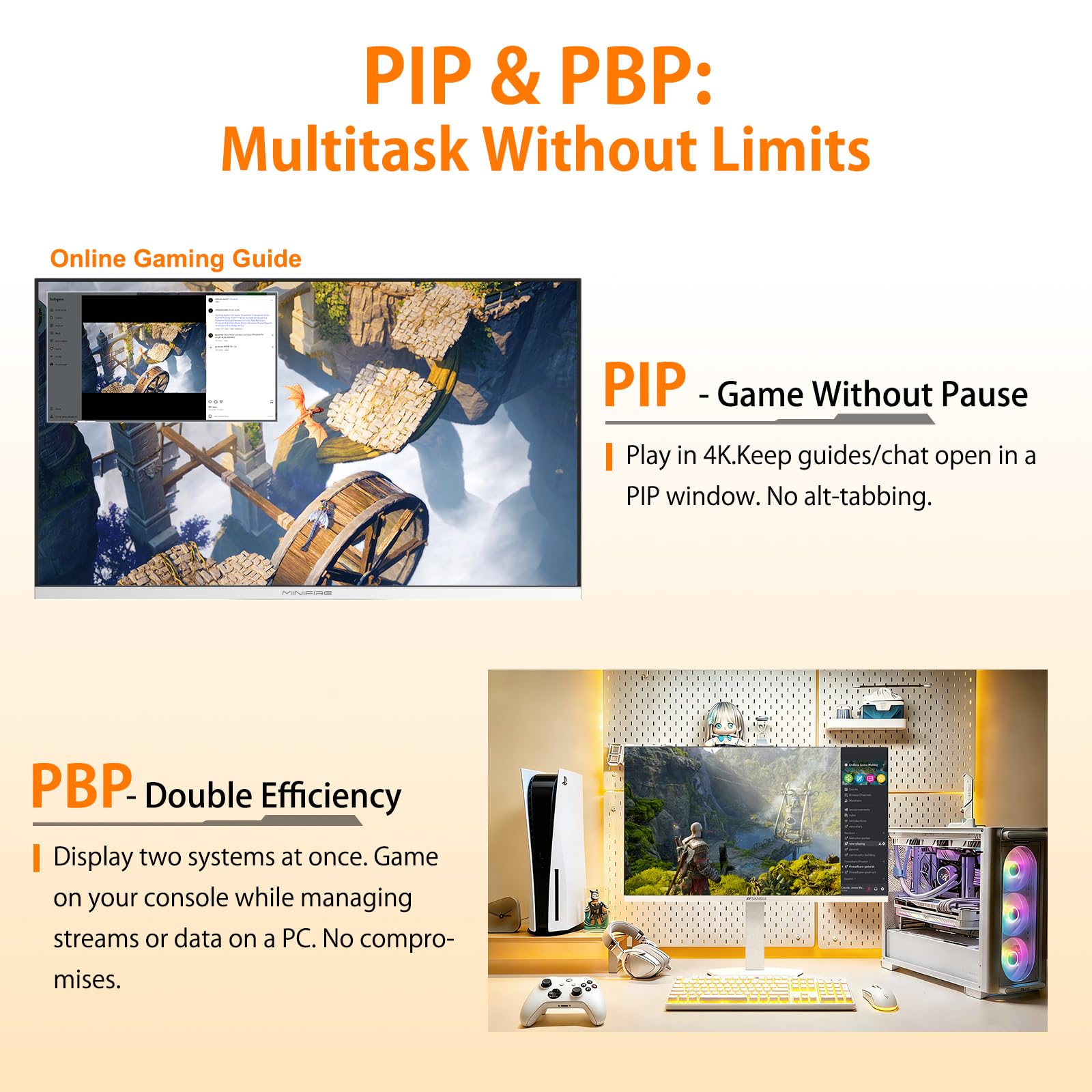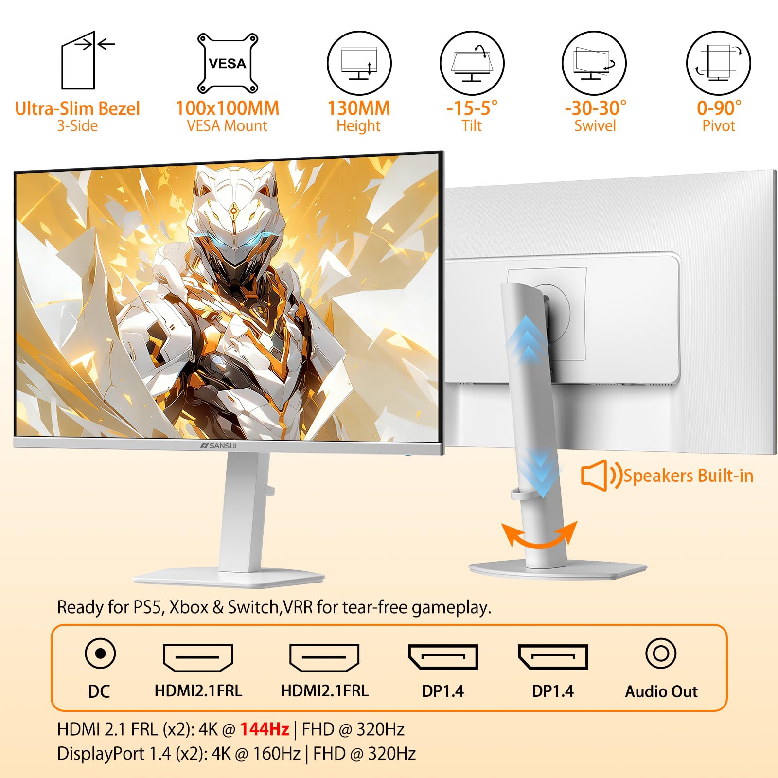 Output & Input: 2×HDMI 2.1 FRL 丨 2×DisplayPort 1.4丨3.5mm Audio Jack丨Speakers built-in 4K UHD Mode: 3840 x 2160 (4K) @ 160Hz via DP | 144Hz via HDMI. FHD Mode: 1920 x 1080 (FHD) @ 320Hz via both HDMI & DP. (Note: Actual performance is capped by the source device’s hardware (e.g., 4K@120Hz on PS5/Xbox, 1080P@60Hz on Switch)