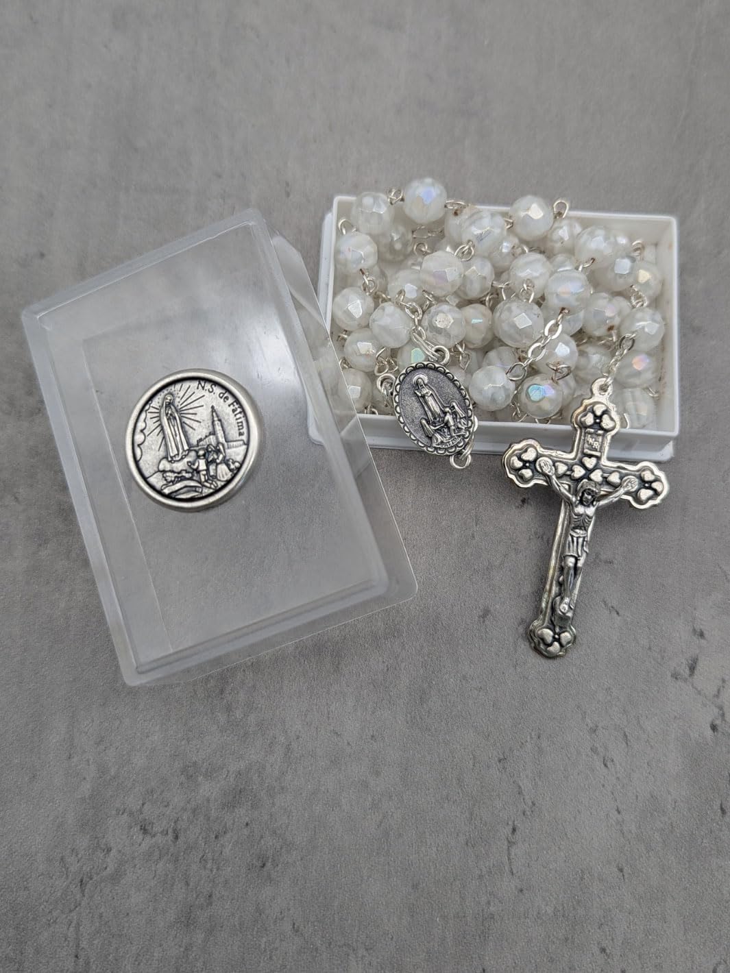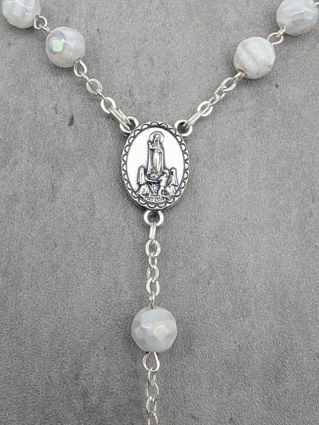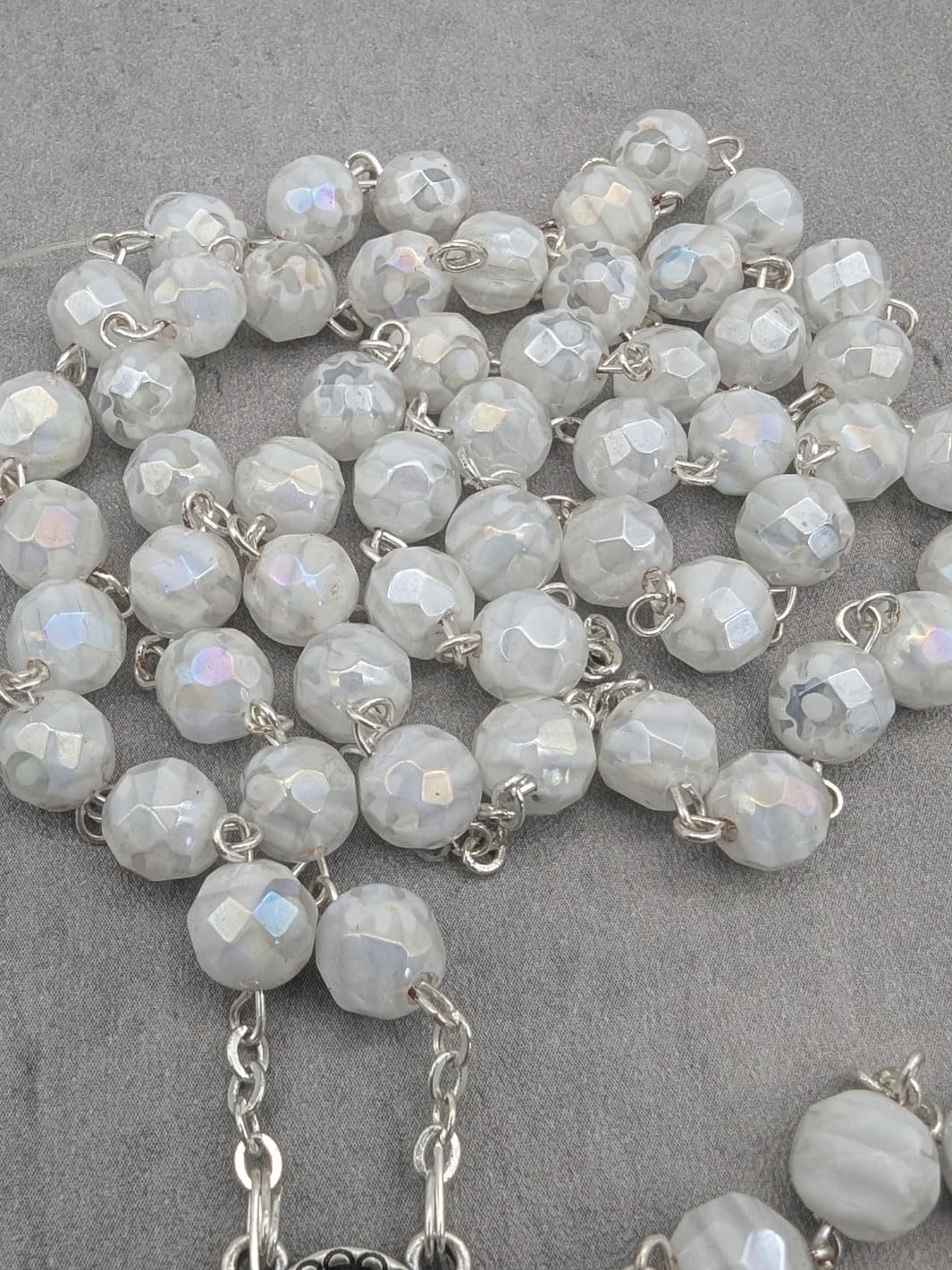 Description Celebrate your devotion and faith with the Handmade Our Lady of Fatima Rosary, a stunning piece crafted with reverence and unparalleled artistry. Handmade in Fatima, Portugal, by the same skilled artisans who create the official rosaries for the Shrine of Fatima, this exquisite rosary necklace embodies the sacred tradition of prayer and connection. Featuring 7mm faceted white Murano crystal beads, each uniquely adorned with a hand-painted white rose inside, this rosary is a masterpiece of beauty and craftsmanship. The delicate beads symbolize purity and faith, offering a strikingly elegant design that reflects the spiritual depth of its origin. At the heart of the rosary, the centerpiece medal displays an intricate image of the Apparitions of Our Lady to the three shepherd children on one side and a reliquary containing Fatima dirt on the otherβoffering a tangible connection to this sacred site. Completing the rosary is a unique silver crucifix, meticulously detailed to depict Jesus on the cross, surrounded by hearts symbolizing the Sacred Heart of Jesus. This rosary is not only a meaningful prayer tool but also a treasured keepsake, perfect for personal devotion or as a thoughtful gift. It comes beautifully packaged in a custom rosary box, adorned with an image of the Apparitions, making it an ideal memento of faith and a cherished reminder of Our Ladyβs message at Fatima. Whether for a pilgrimage souvenir, a gift for baptisms, confirmations, or weddings, or simply to share the message of Fatima, this rosary is a meaningful and timeless reminder of devotion, prayer, and peace. Carry the grace of Fatima with you wherever you go with the Handmade Our Lady of Fatima Rosary with White Murano Crystal Beads. Add this extraordinary piece of religious artistry to your collection today!
