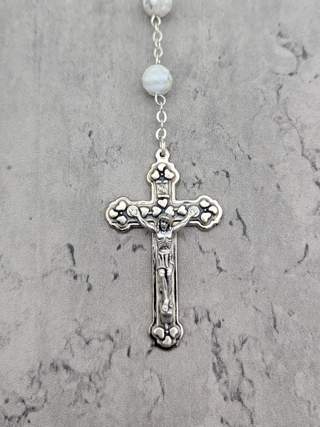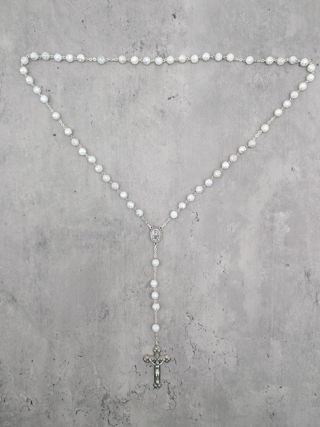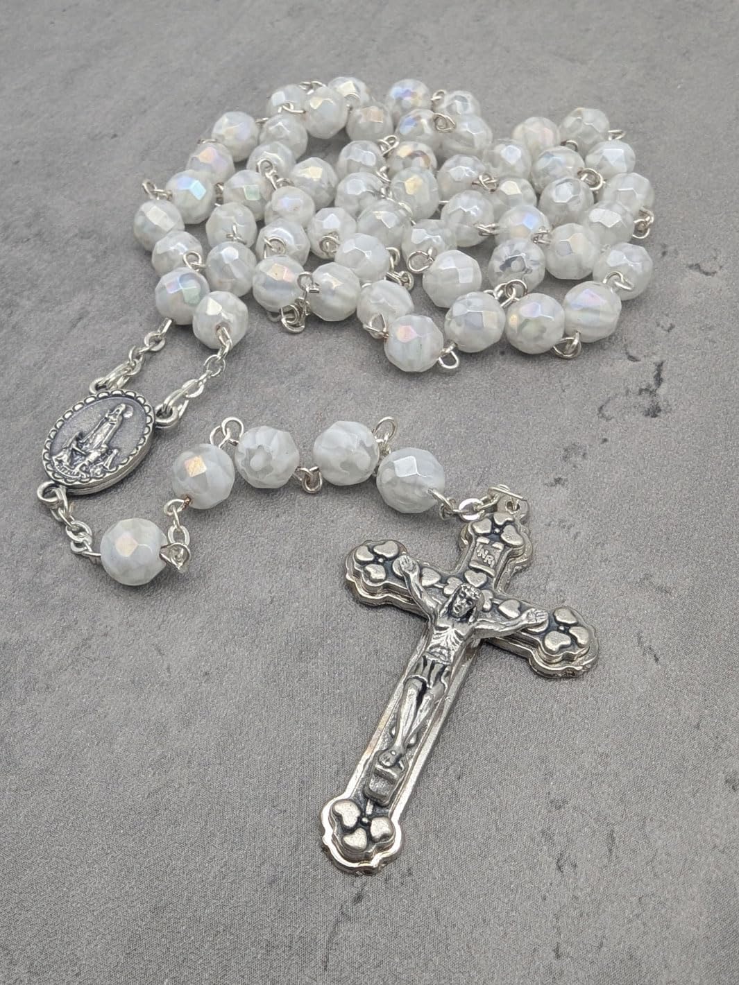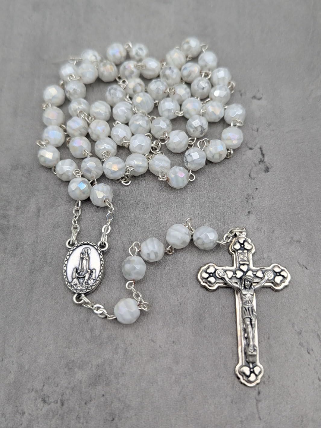 Description Celebrate your devotion and faith with the Handmade Our Lady of Fatima Rosary, a stunning piece crafted with reverence and unparalleled artistry. Handmade in Fatima, Portugal, by the same skilled artisans who create the official rosaries for the Shrine of Fatima, this exquisite rosary necklace embodies the sacred tradition of prayer and connection. Featuring 7mm faceted white Murano crystal beads, each uniquely adorned with a hand-painted white rose inside, this rosary is a masterpiece of beauty and craftsmanship. The delicate beads symbolize purity and faith, offering a strikingly elegant design that reflects the spiritual depth of its origin. At the heart of the rosary, the centerpiece medal displays an intricate image of the Apparitions of Our Lady to the three shepherd children on one side and a reliquary containing Fatima dirt on the otherβoffering a tangible connection to this sacred site. Completing the rosary is a unique silver crucifix, meticulously detailed to depict Jesus on the cross, surrounded by hearts symbolizing the Sacred Heart of Jesus. This rosary is not only a meaningful prayer tool but also a treasured keepsake, perfect for personal devotion or as a thoughtful gift. It comes beautifully packaged in a custom rosary box, adorned with an image of the Apparitions, making it an ideal memento of faith and a cherished reminder of Our Ladyβs message at Fatima. Whether for a pilgrimage souvenir, a gift for baptisms, confirmations, or weddings, or simply to share the message of Fatima, this rosary is a meaningful and timeless reminder of devotion, prayer, and peace. Carry the grace of Fatima with you wherever you go with the Handmade Our Lady of Fatima Rosary with White Murano Crystal Beads. Add this extraordinary piece of religious artistry to your collection today!