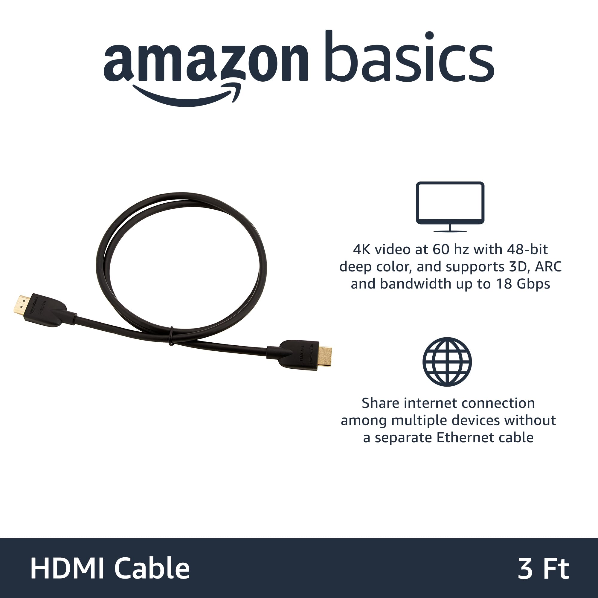 Product Description Amazon Basics High-Speed HDMI Cable (18Gbps, 4K/60Hz) - 3 Feet, Pack of 3, Black From the Manufacturer Amazon Basics