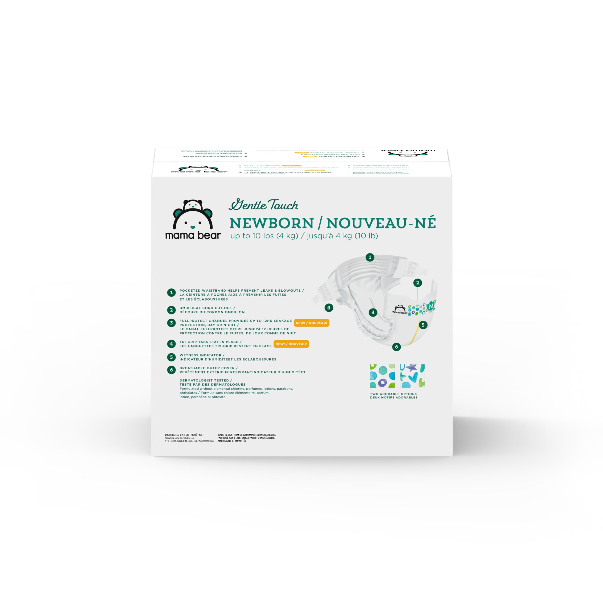 IN THE BOX: Mama Bear Gentle Touch diapers for babies; size NB; (4 packs of 30 diapers each, 120 total)