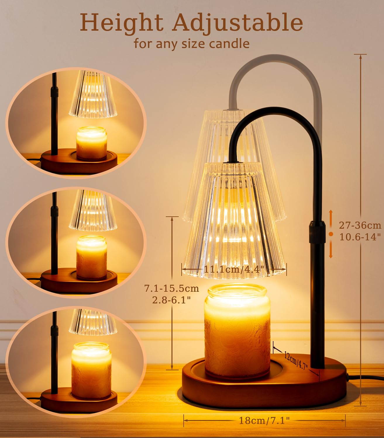 💡【Adjustable Height and Fits All Candle Sizes】 Our upgraded candle warming lamp holder height can able adjustable range 2.8-6.1 inch, designed with grooves wooden base for storing candles of widest 4.7 * highest 6.1 inch small & large Jar candles Allowing you to easily adjust the candle's height based on different spaces and needs, ensuring the optimal visual effect and user experience.