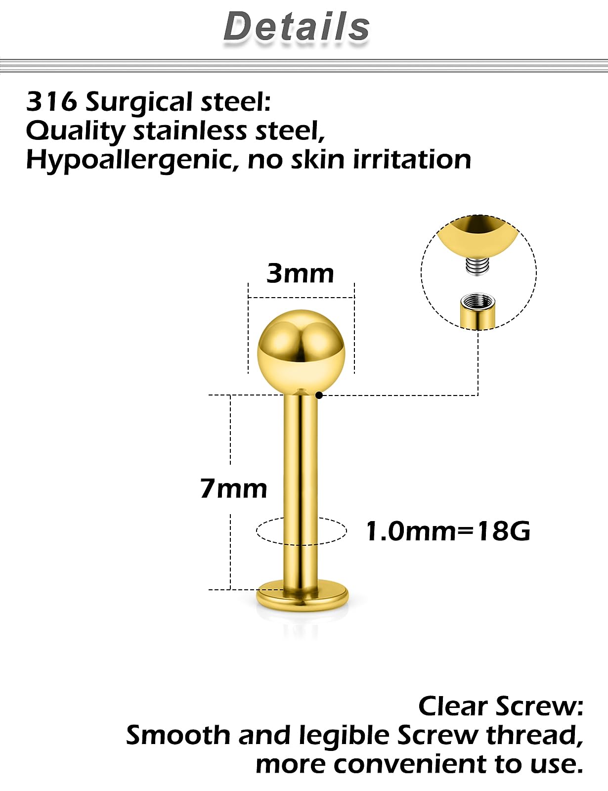 MEASUREMENTS--Lip Rings Studs Gauge Size: 18G (1.0mm); Straight Bar Length: 7mm(1/4 Inch),Top Size:3mm, The Different Sizes Made It Easy to Find the Right One for You. Color: Gold-tone.