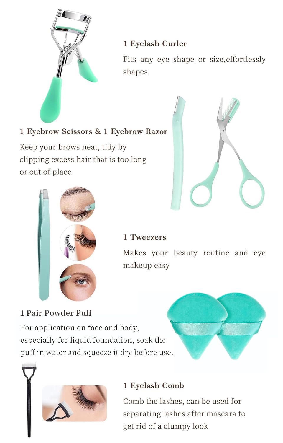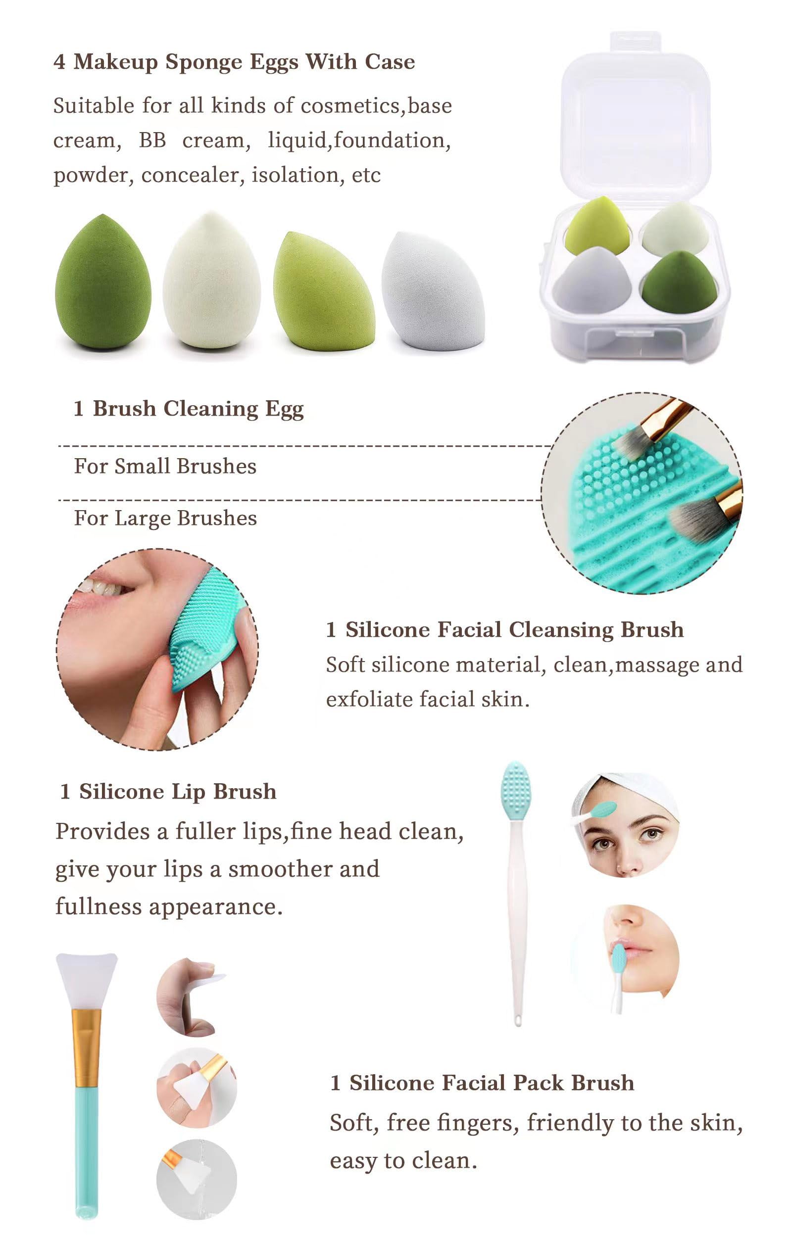 Comprehensive Makeup Brush Set : This set includes 16 makeup brushes and a storage bag . In addition, we also prepare a silicone facial-pack brush,a sponge egg set, silicone lip brush,brush cleaning egg,silicone facial cleansing brush,Powder Puff,Eyelash Curler and Eyebrow Scissors. This set is a good choice for beauty lovers.