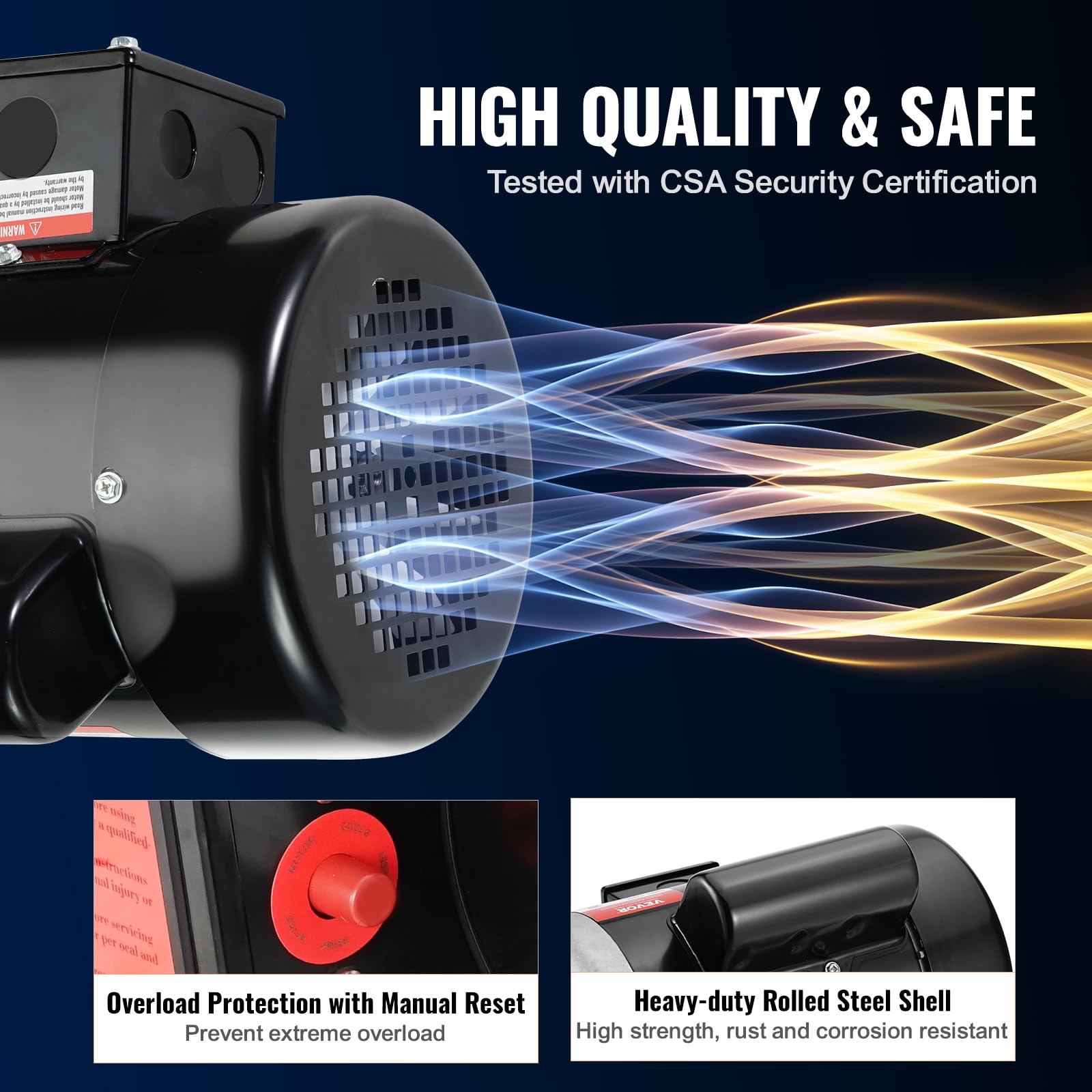 Durable and Safe: Tested to CSA standards, this air compressor motor boasts a heavy-duty rolled steel shell for enhanced durability. It also includes overload protection with manual reset, ensuring longer service life and dependable performance.