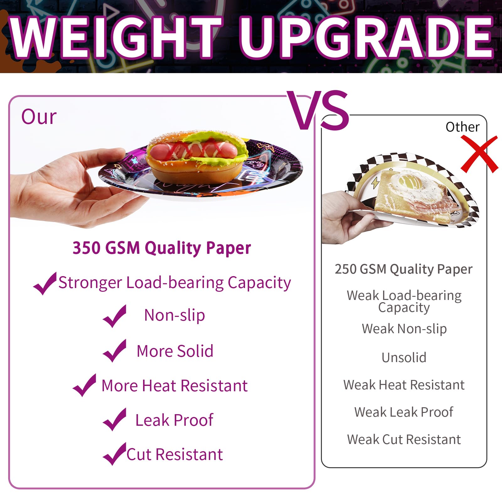 Upgraded Material: Our neon plates are made of premium paper, thickened to 350g to withstand more, can easily carry more food, solid and durable cut-resistant. The napkin is 3 ply thicker, soft and absorbent, not easy to tear. Fork is not easy to break. The pattern is beautifully printed and will not fade. Say goodbye to fragile party supplies, the sturdy construction can handle the most intense game competition! (Tip: Please do not microwave the plates)