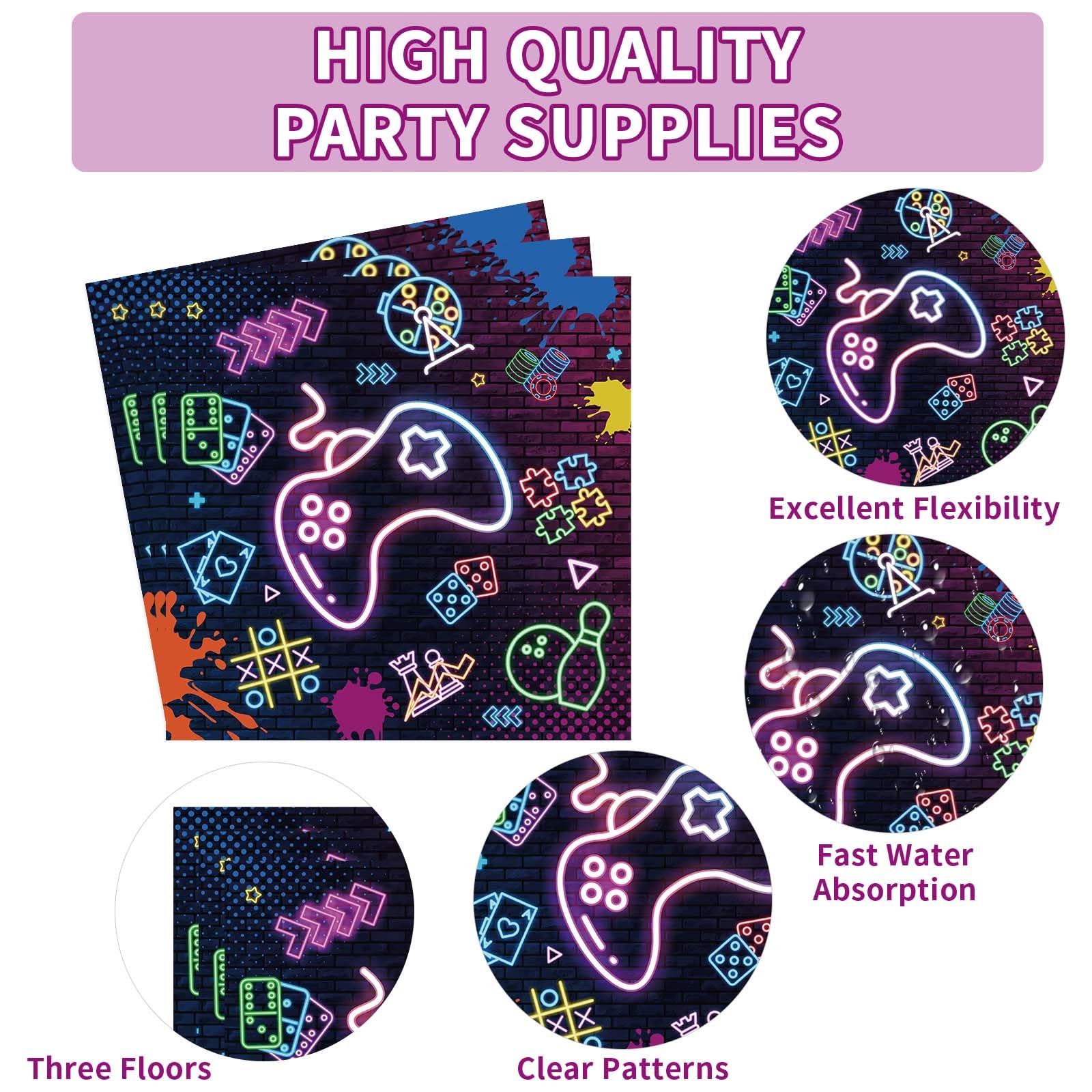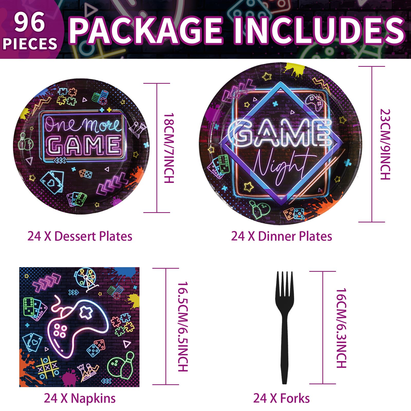 Glow Neon Theme Design: The game night theme decorations tableware features cool gamepad, stars, "Game Night" and "One More Game" words, dynamic glow neon design to add a fun atmosphere to your party. Let gamers to immerse themselves in a world of fun and excitement surrounded by game inspired decorations