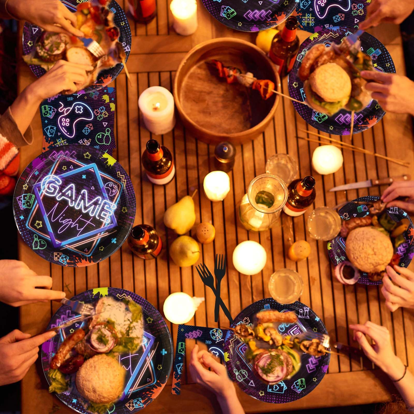 Game Night Party Supplies: Hey gamers! Get ready to level up your birthday party with our 96 pcs video game night tableware set! Package includes 24 9" game plates, 24 7" game plates, 24 game napkins and 24 forks for 24 gamers, definitely a win