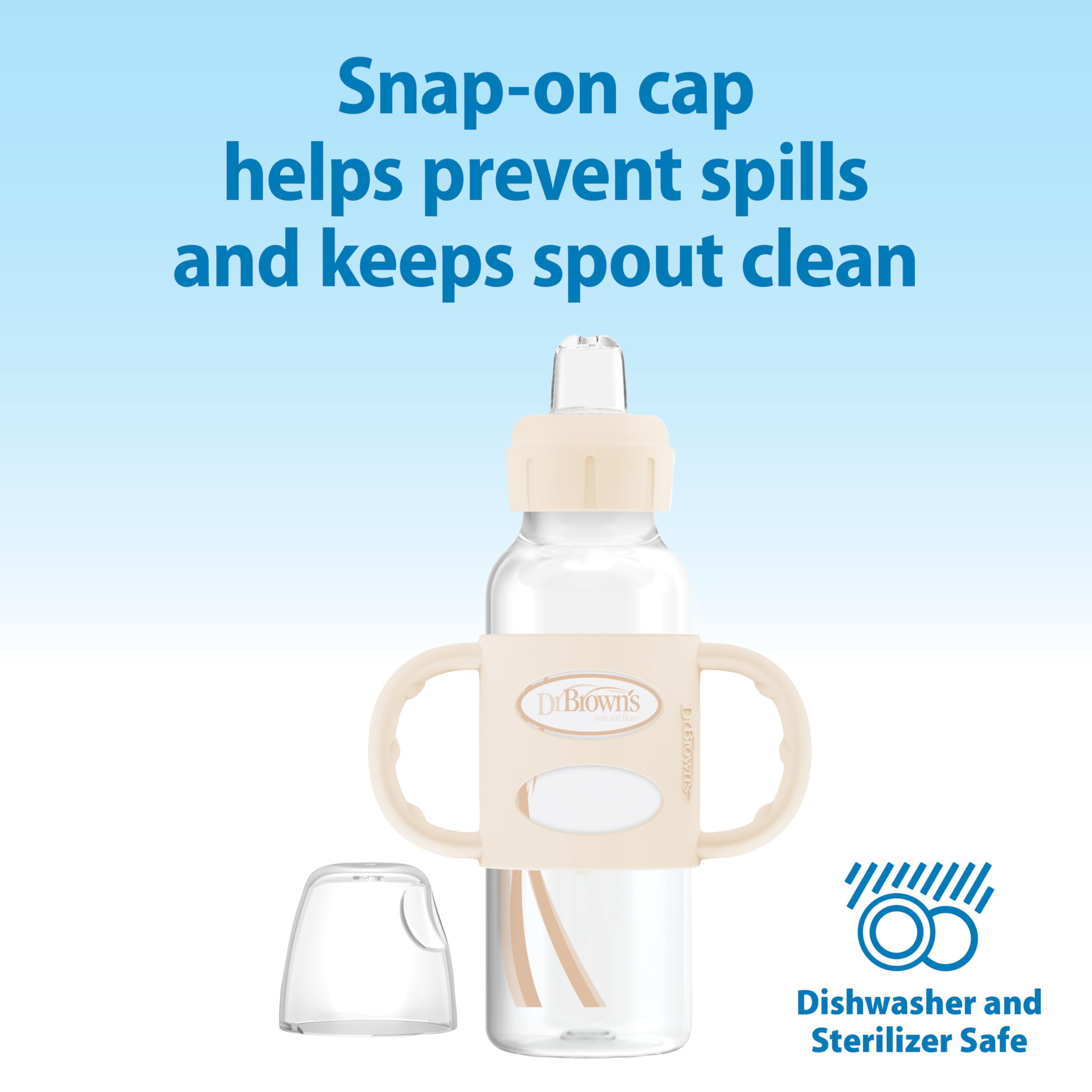 Dr. Brown's Milestones Narrow Sippy Spout Bottle is the easy way to help baby develop new drinking skills! Introducing a sippy spout has never been simpler. The soft silicone sippy spout is used in place of the nipple on the Dr. Brown’s Narrow Bottle that’s already familiar to baby. Easy grip 100% silicone handles are removable and fit most narrow bottles and sippy cups, while the snap-on cap keeps the spout clean when on-the-go. The soft sippy spout fits any Dr. Brown’s Options+ Narrow Bottle after the internal vent is removed. All parts are dishwasher (top rack only) and sterilizer safe. BPA-free. 6m+.