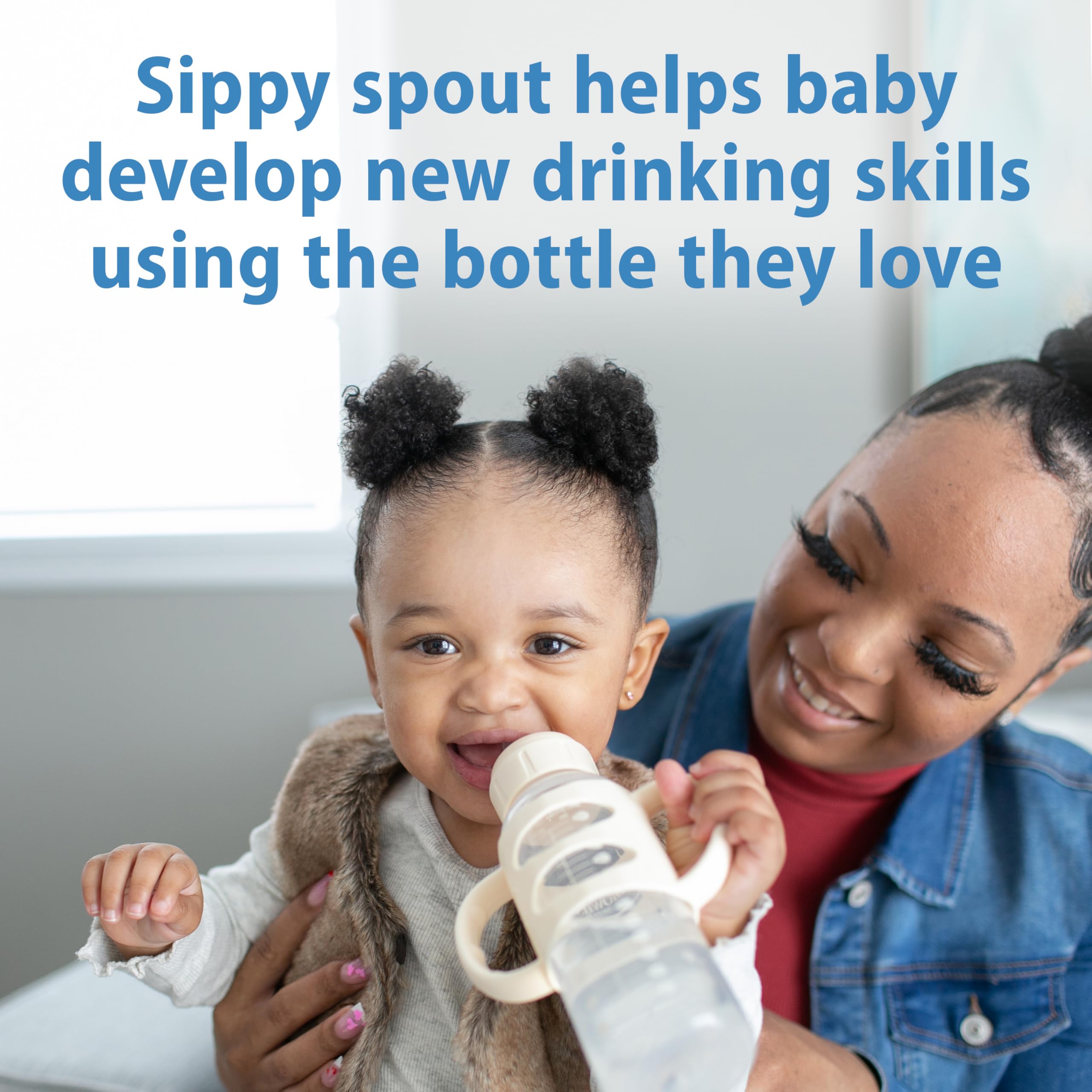 BOTTLE TO SIPPY TRANSITION. Transition from bottle nipple to soft silicone sippy spout to teach baby new drinking skills.