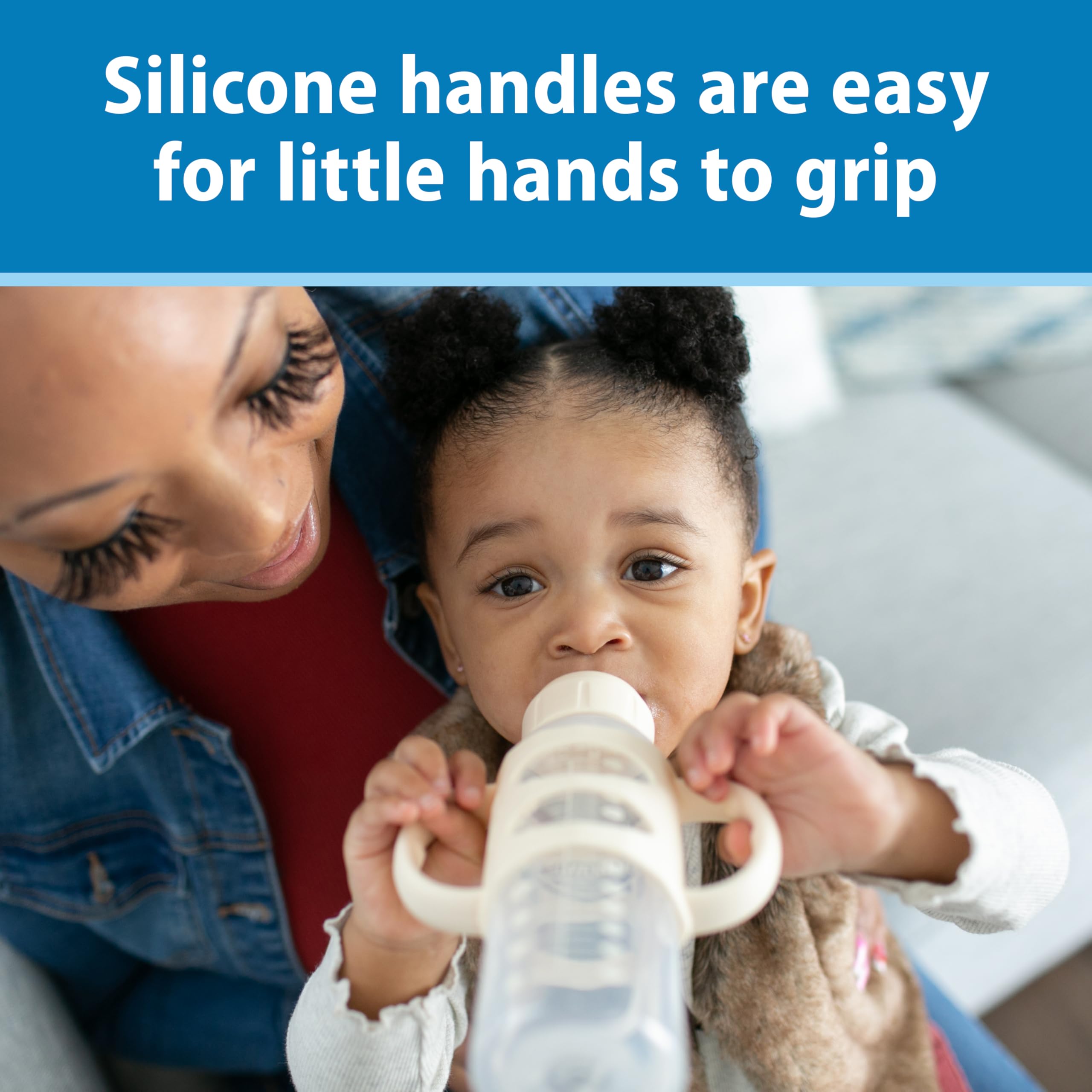 SIPPY WITH HANDLES. Easy grip 100% silicone handles are flexible and easy to hold. Bottle handles are removable and fit most other narrow bottles.