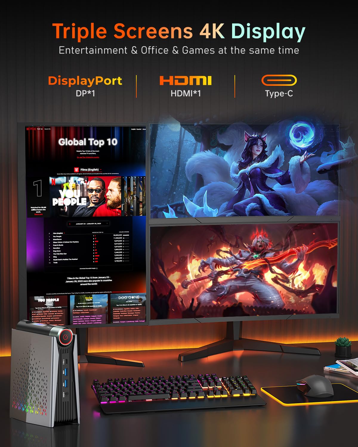 【Multitask with Triple Monitors】Boost your productivity with the mini desktop PC. Connect up to three monitors with the two HDMI 2.0 and one Type-C ports, supporting 4k@60 resolution. Multitask efficiently, save time, and improve your work efficiency with this powerful mini computer. Upgrade your workspace setup with the ACE micro PC