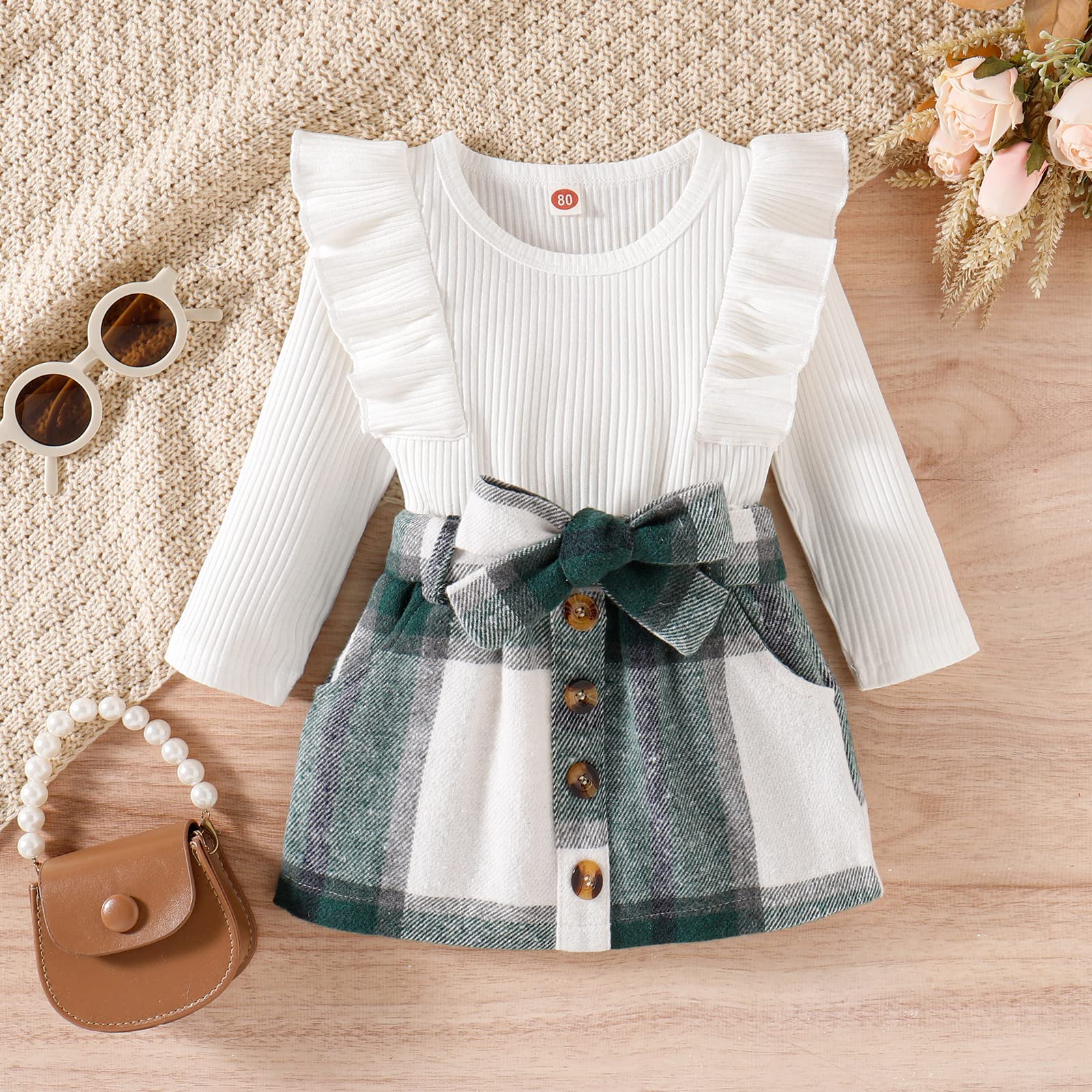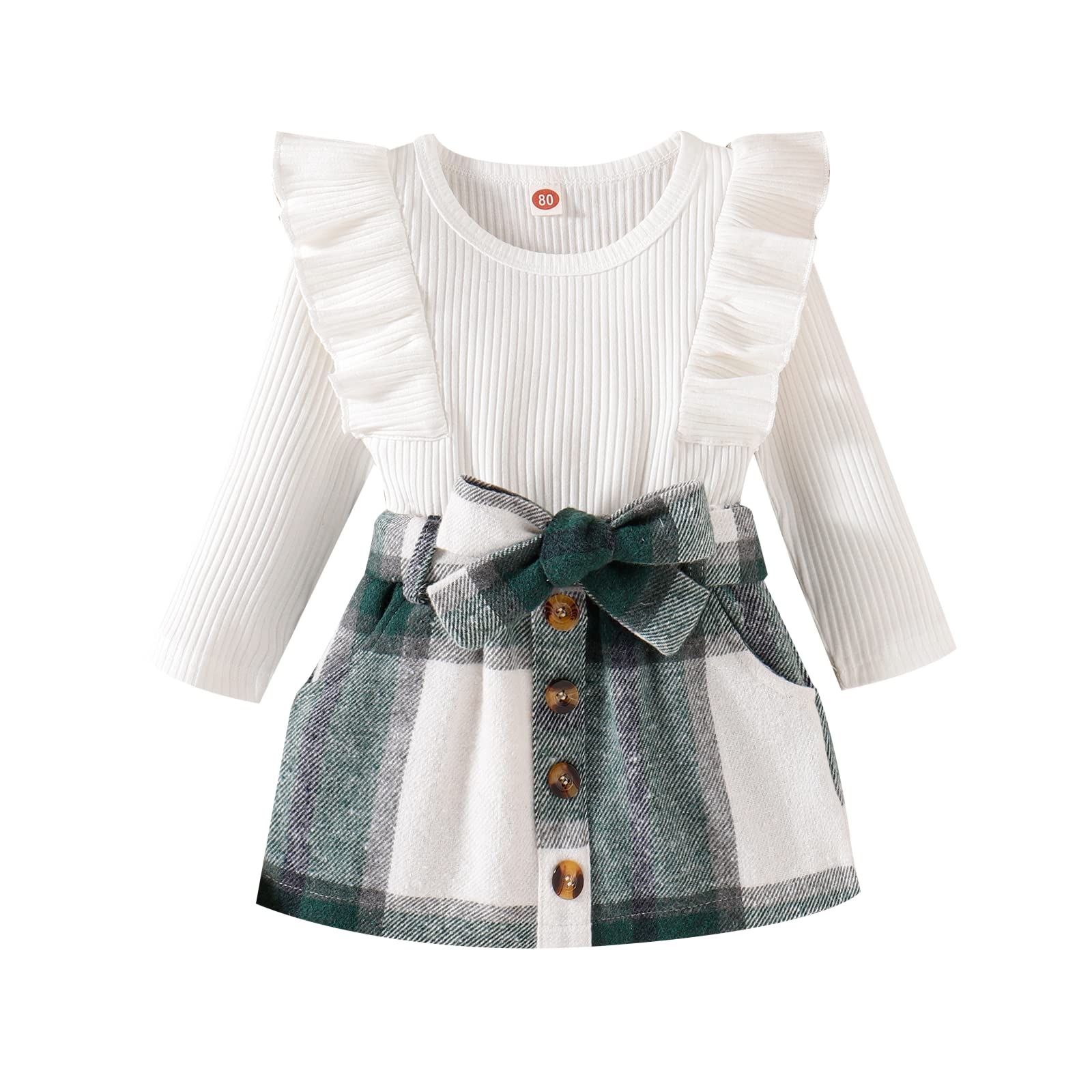 Feature: Baby girl fall outfits, long sleeve knitted sweatshirt top , crewneck, comfy ribbed shirt and tweed red plaid skirt set, adjustable belt skirt, lovely and stylish, Suitable for your little princess in autumn winter and Christmas wear.