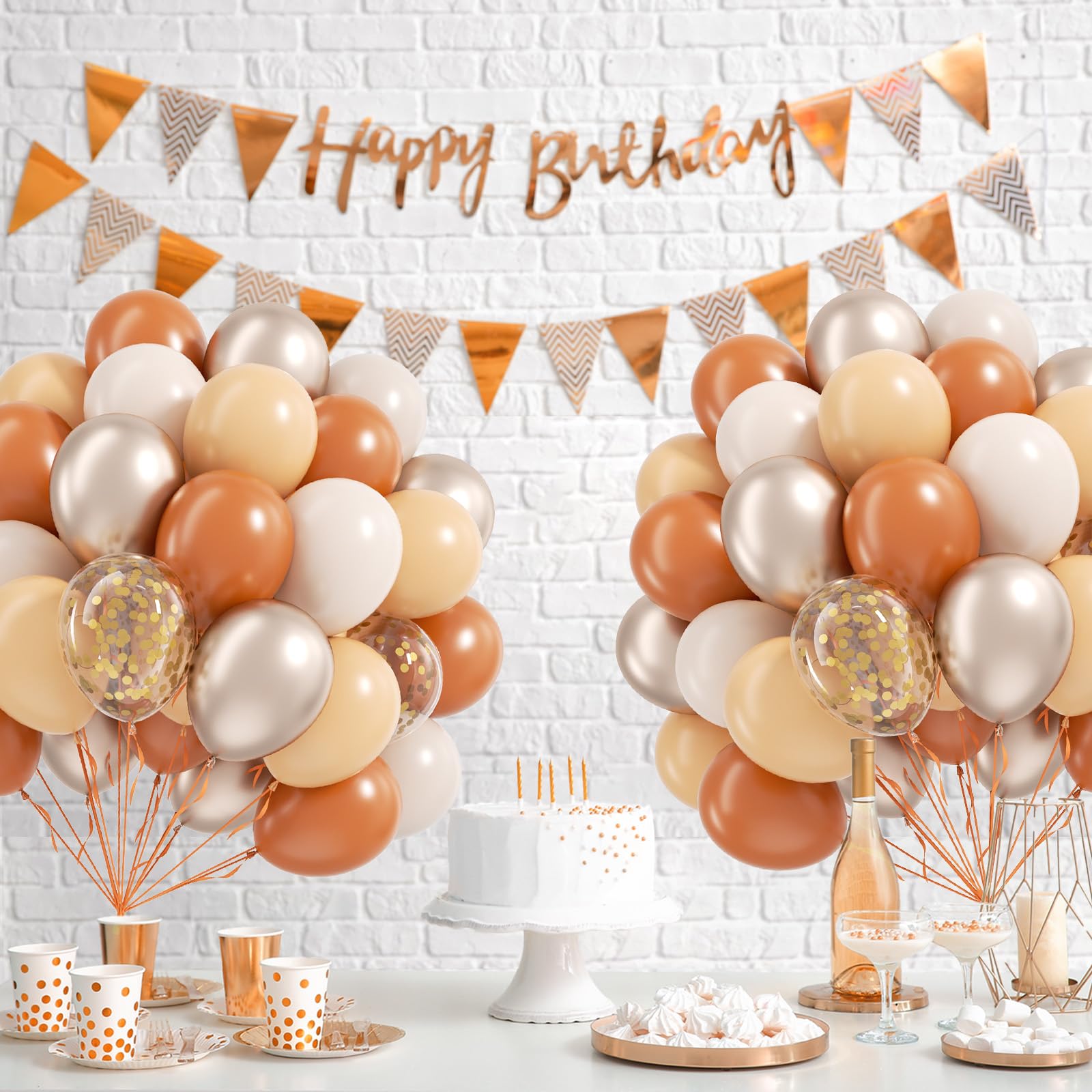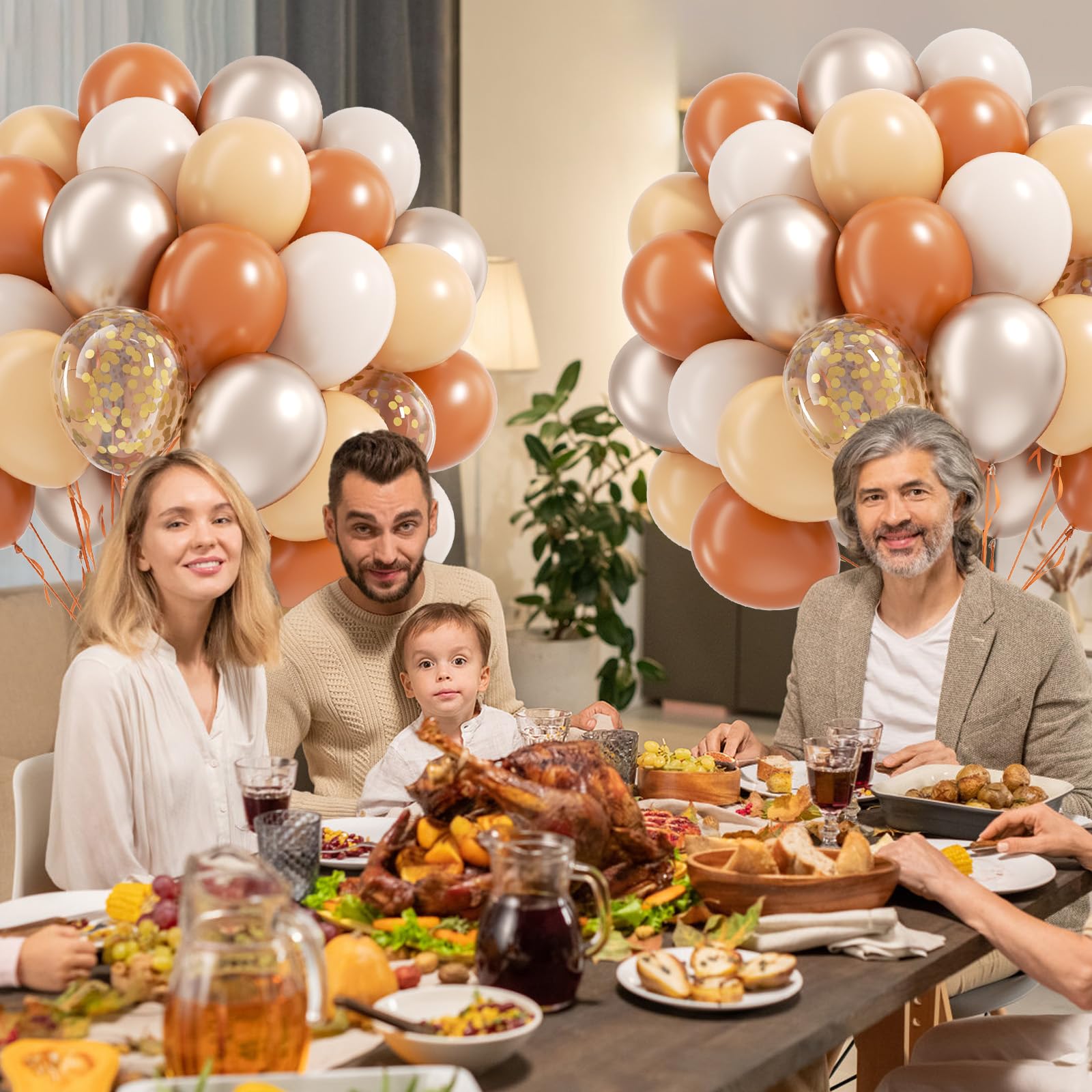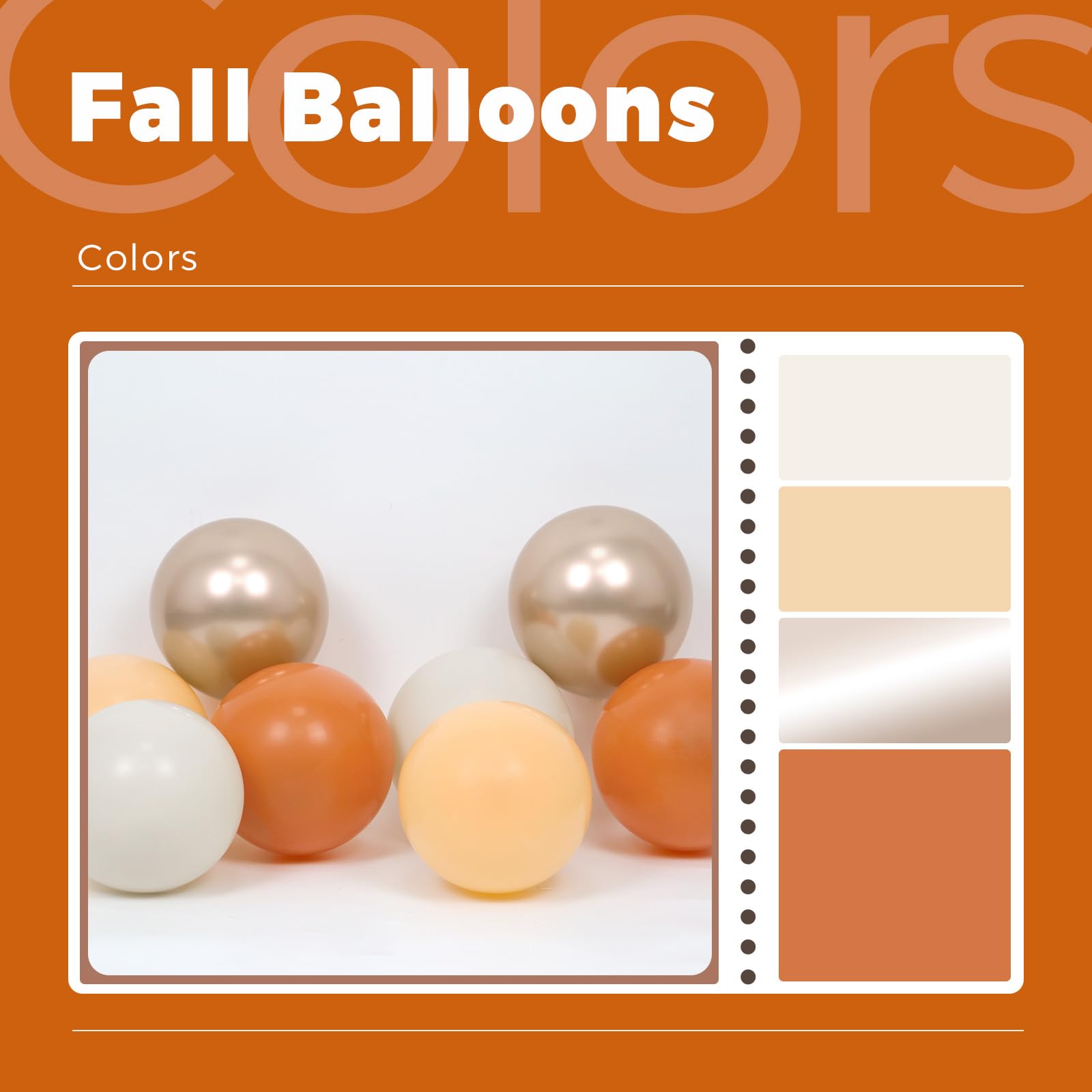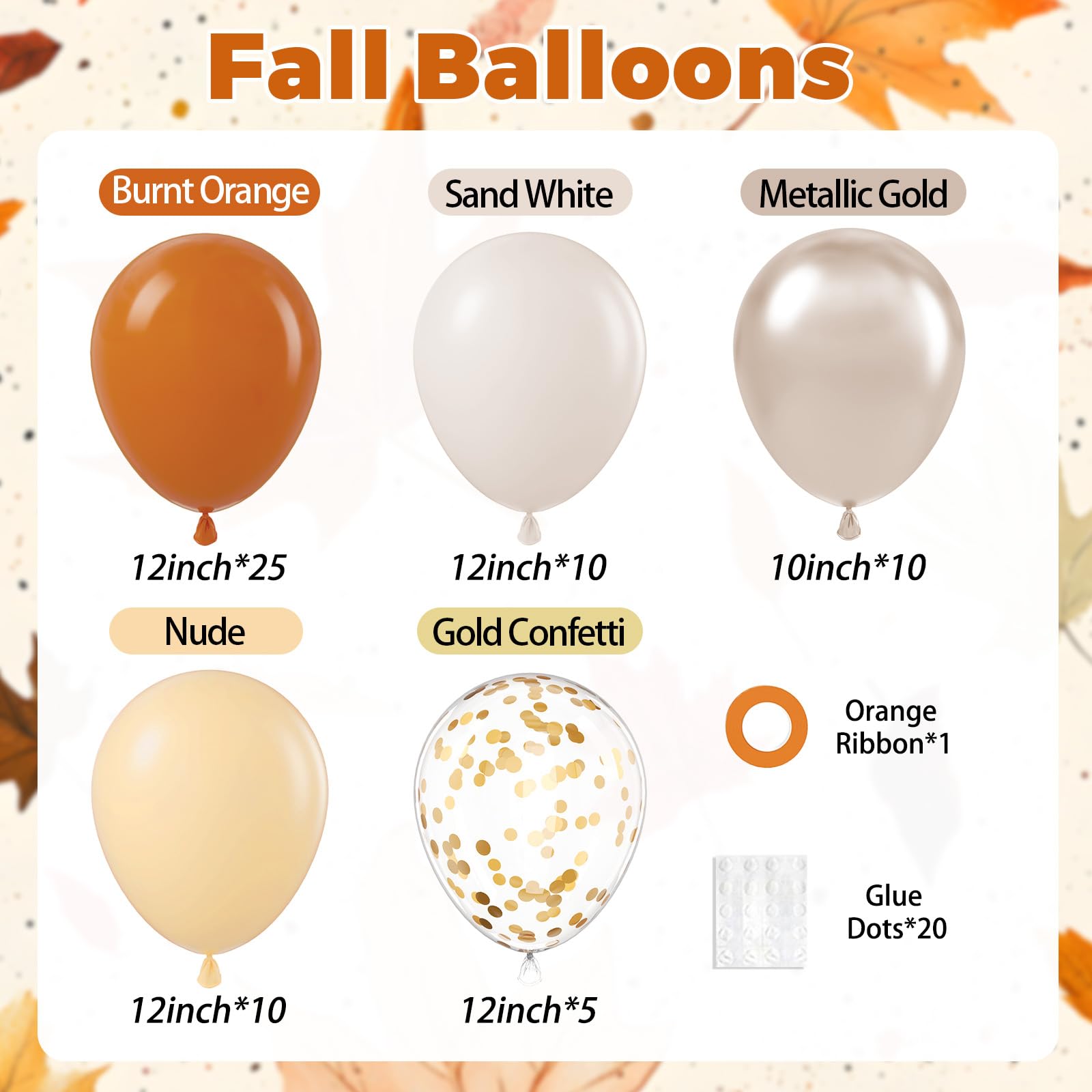 Package Include:The fall balloons include 12inch burnt orange balloonsx25, 12inch nude balloonsx10, 12inch sand white balloonsx10, 10inch metallic gold balloonsx10, 12inch gold confetti balloonsx5, glue dotsx20, orange ribbonx1