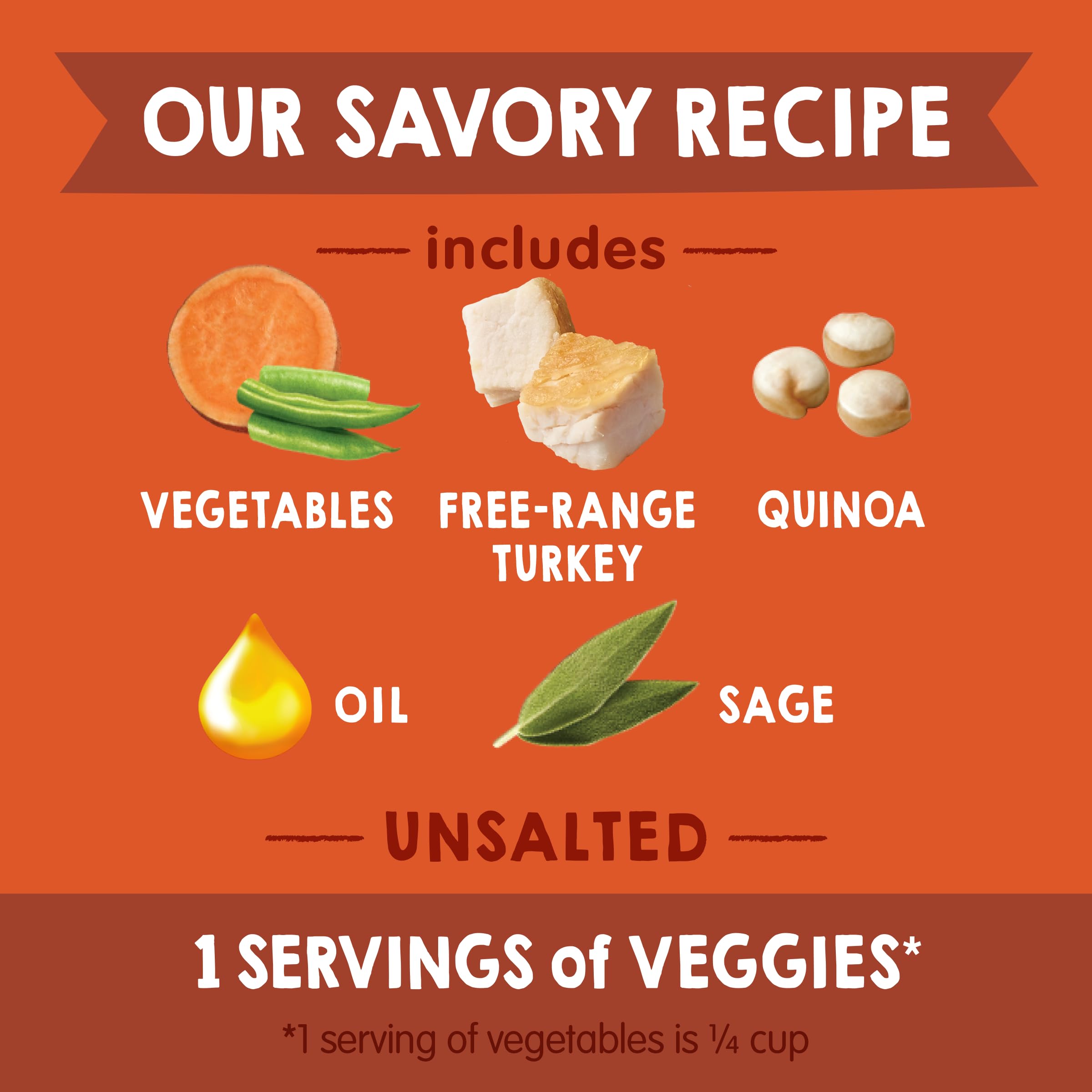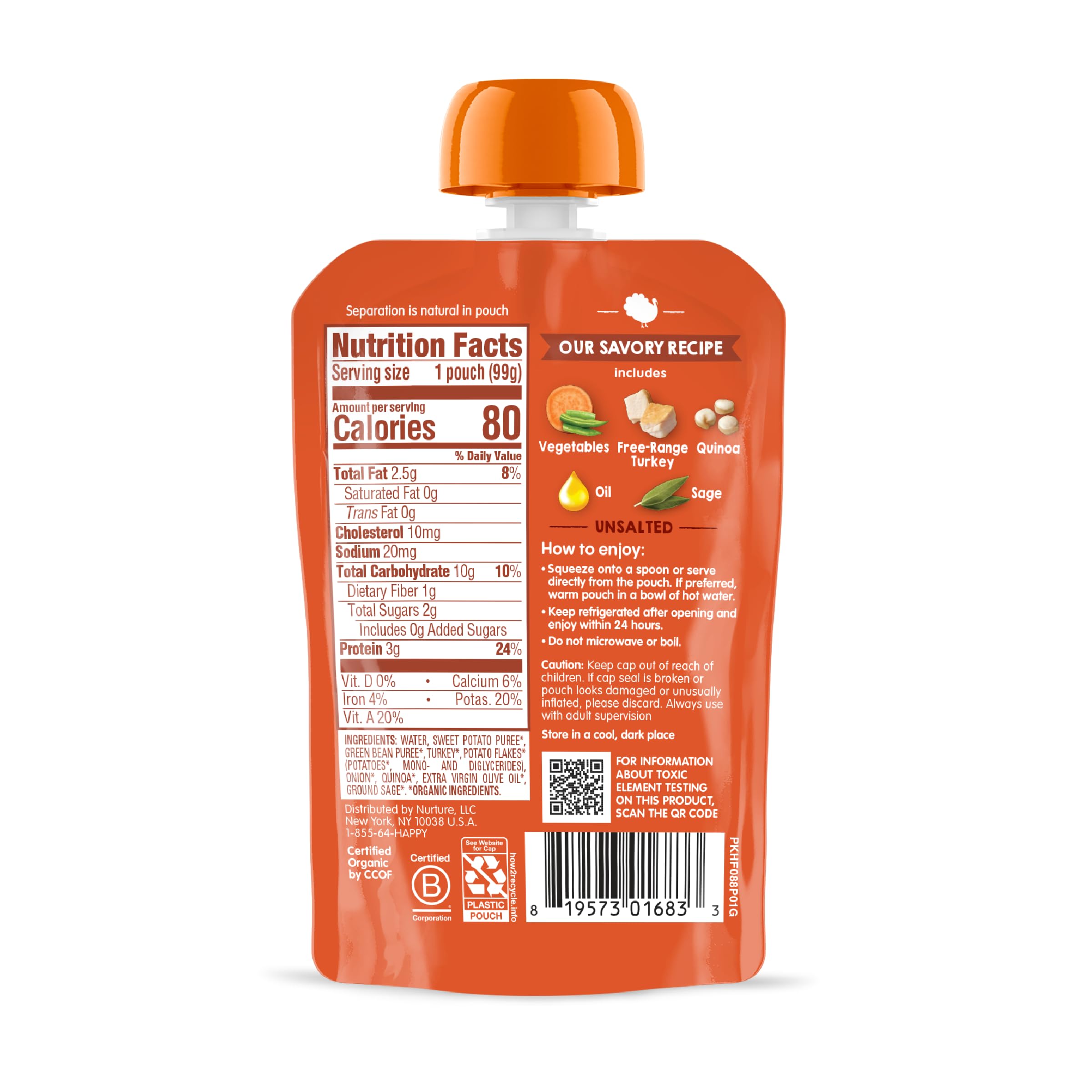 Excite baby’s palate with the home-inspired flavors of Happy Baby Organics Savory Blends Stage 3 pouches. This vibrant (unsalted!) skillet recipe features organic free-range turkey, harvest vegetables, and quinoa with flavorful fats & herbs, delivering protein and one full serving of veggies. Stage 3 purees are made for baby ready for advancing tastes & textures. All Happy Baby products are always certified USDA organic, made with ingredients that are non-GMO and grown without the use of toxic persistent pesticides.