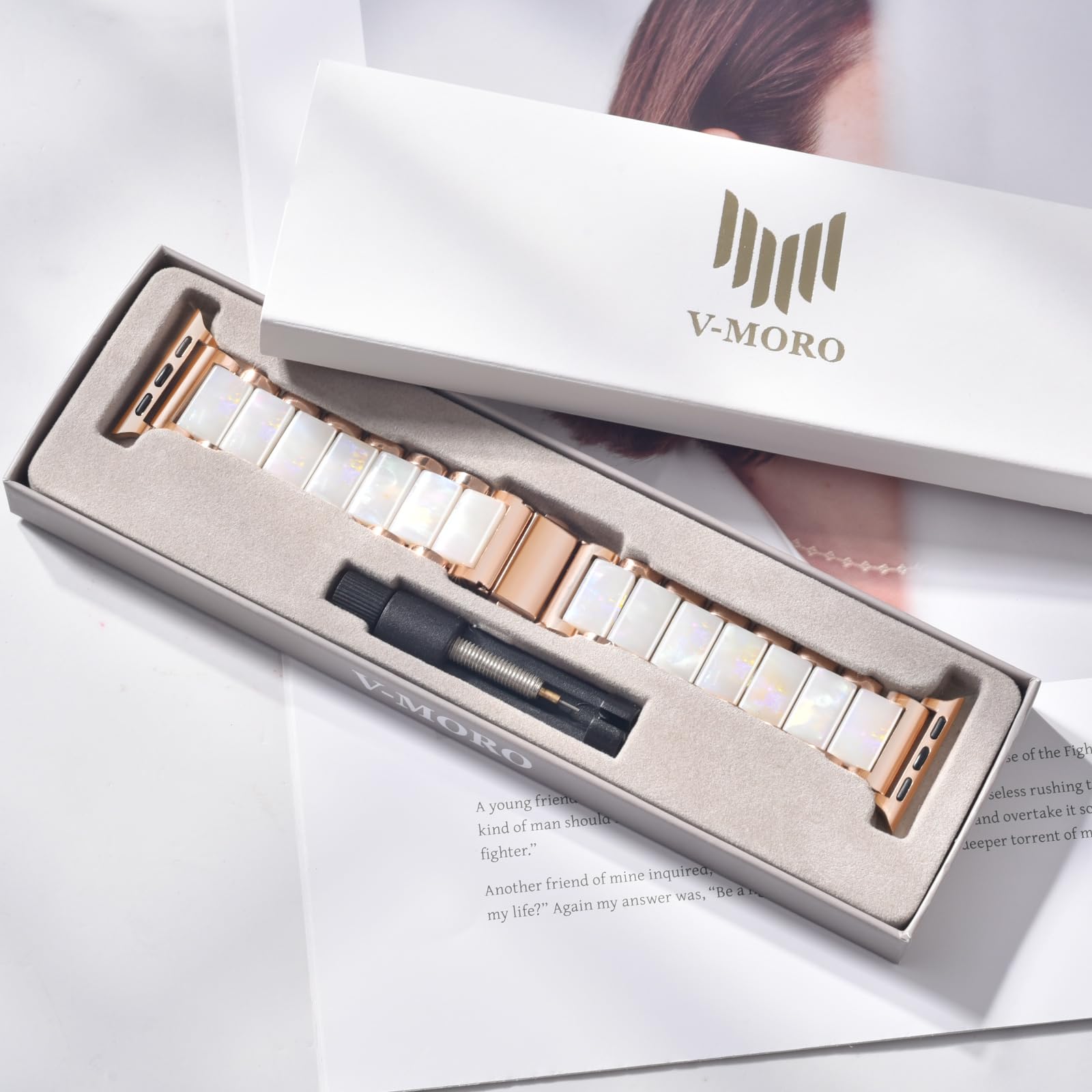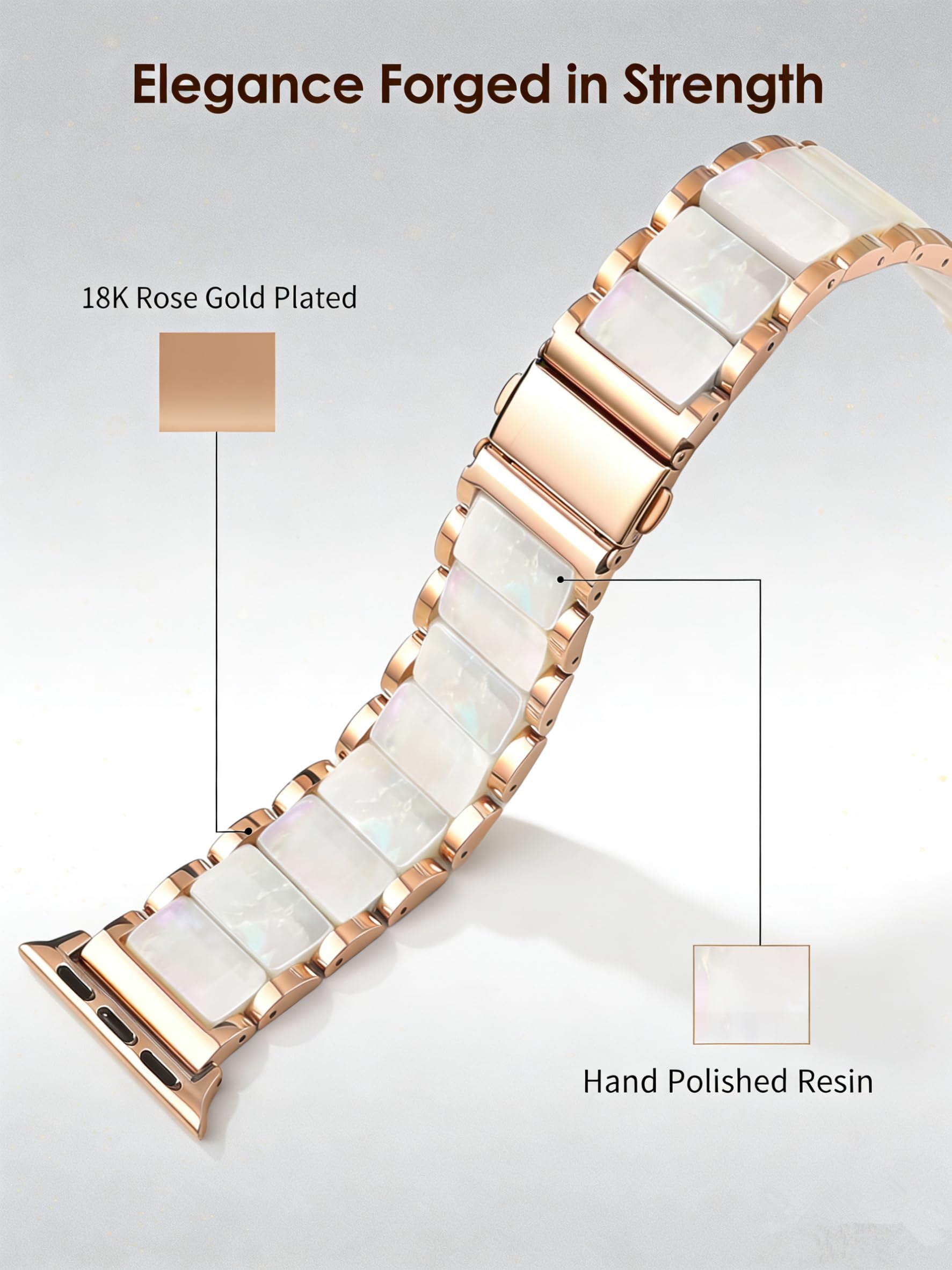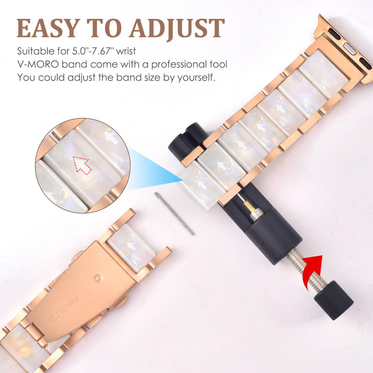 🎅Premium Materials - The V-MORO 45mm/46mm Apple Watch Band elevates luxury with nano vacuum plating stainless steel framework, offering exceptional corrosion resistance and a lasting luster. Each metal link is meticulously finished for a seamless, jewelry-grade feel. At its heart, hand-polished resin inlays showcase a brilliant, depth-rich gloss—carefully positioned to complement your wrist’s natural curve. Precision assembly ensures fluid flexibility, adapting effortlessly to every movement while maintaining a snug, rattle-free fit.
