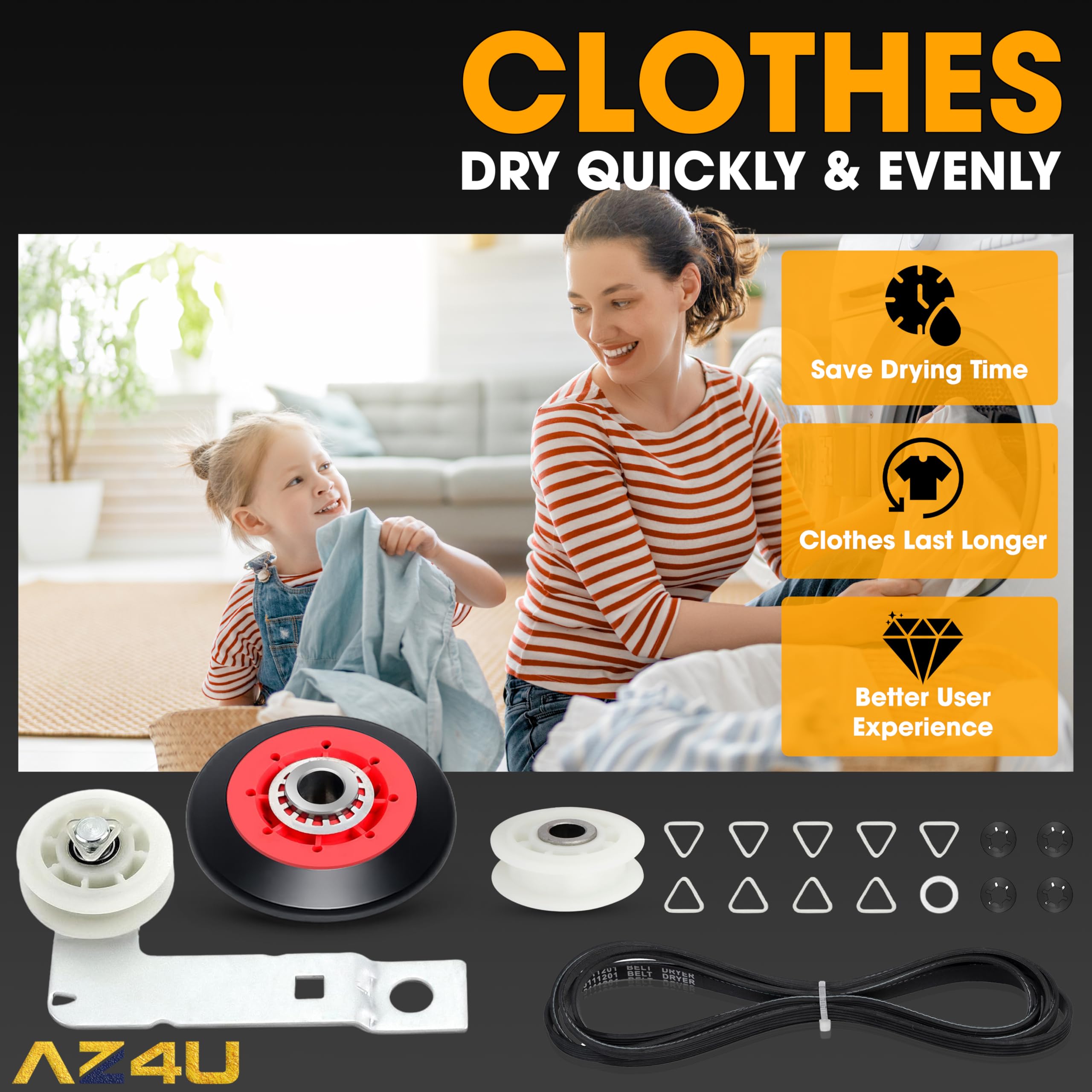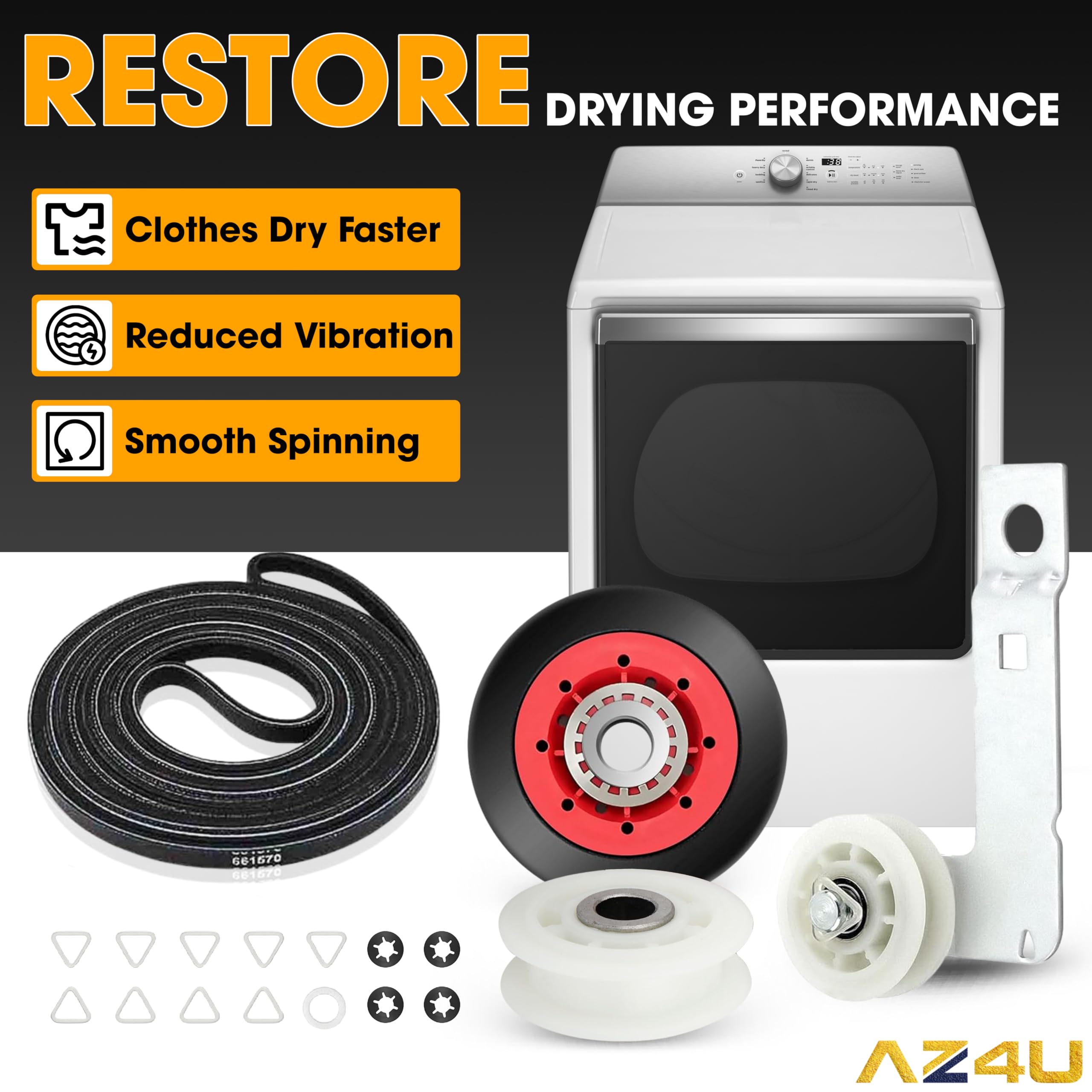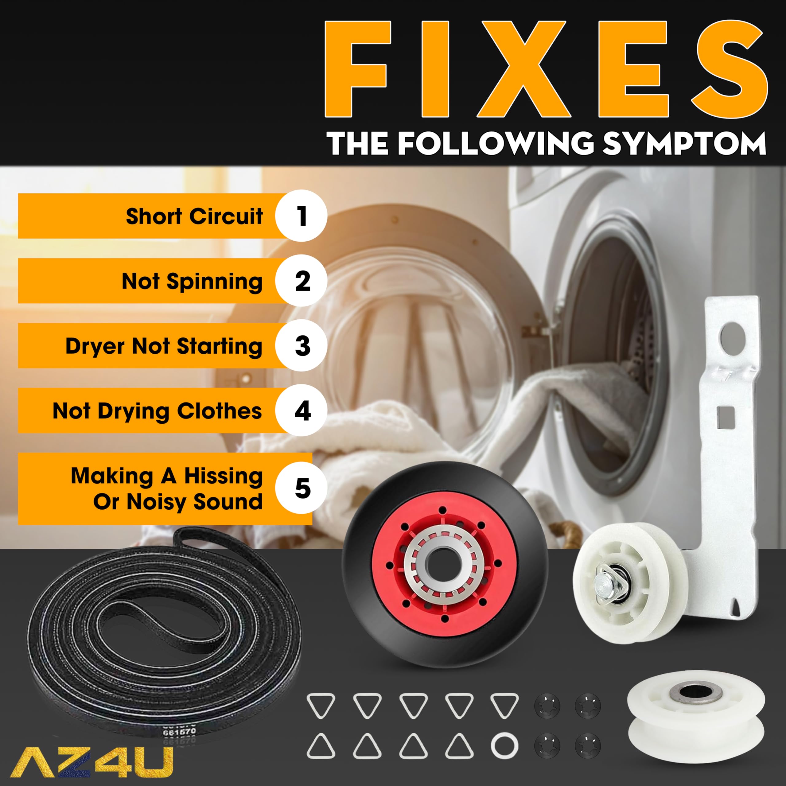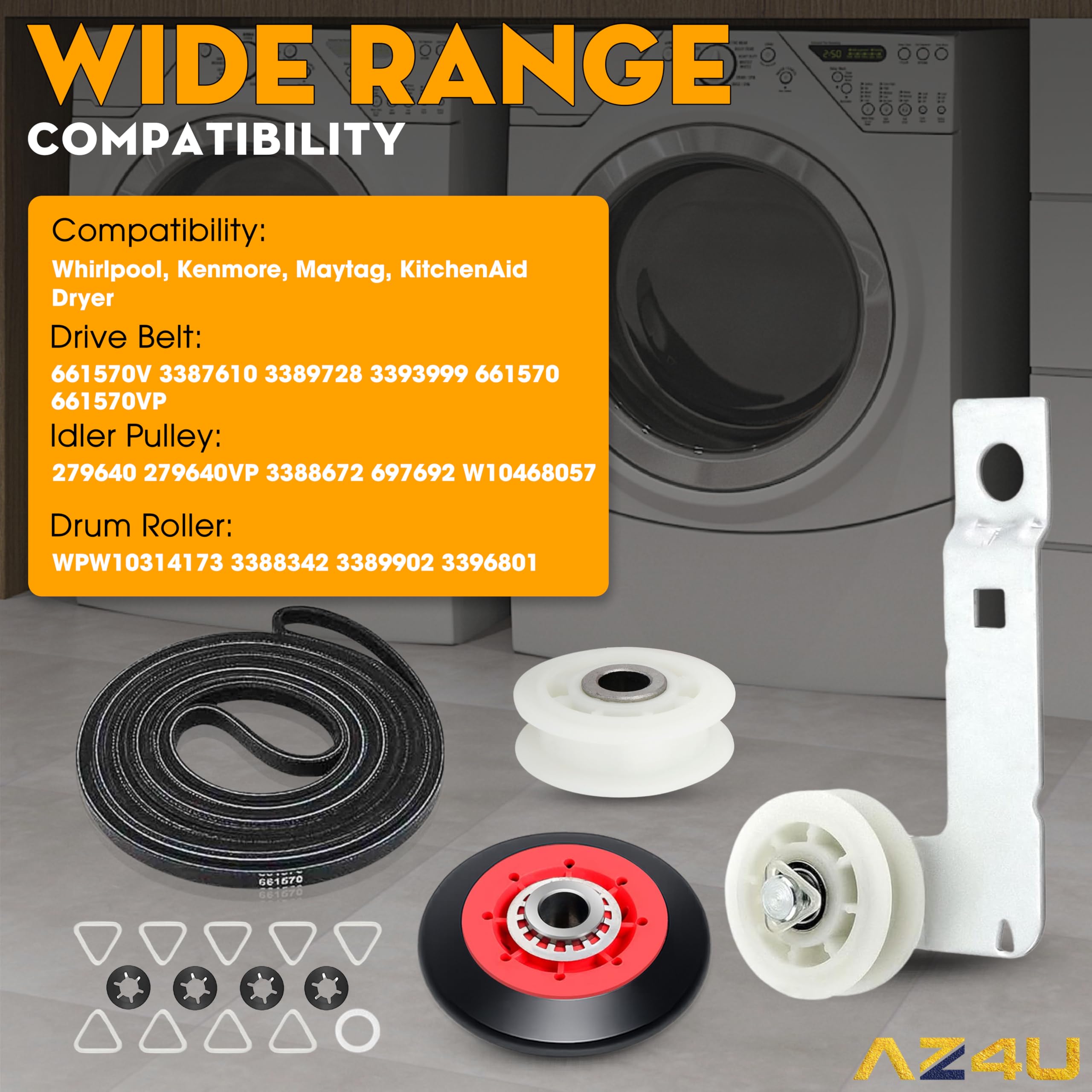 ✅ Package include: 1x Dryer Drive Belt, 1x Dryer Idler Pulley, 4x Dryer Drum Support Roller, 1x Dryer Idler Pulley with Bracket ( all as the picture). Parts Compatibility: Dryer Repair Kit 4392067, 587637, 2015, 4392067VP, 80047; Drive Belt 661570V, 3387610, 3389728, 3393999, 661570, 661570VP; Idler Pulley 279640, 279640VP, 3388672, 697692, W10468057; Dryer Drum Support Roller WPW10314173, 3388342, 3389902, 3396801, 3396802, 3401846, 8536973, 8536974, W10314171, W10314173, W10756057, WPW10314173VP; Idler Pulley with Bracket W10837240, AP5988716, 3387372, 3388674, W10118754, W10118756, W10547287, W10547290, W10837240VP