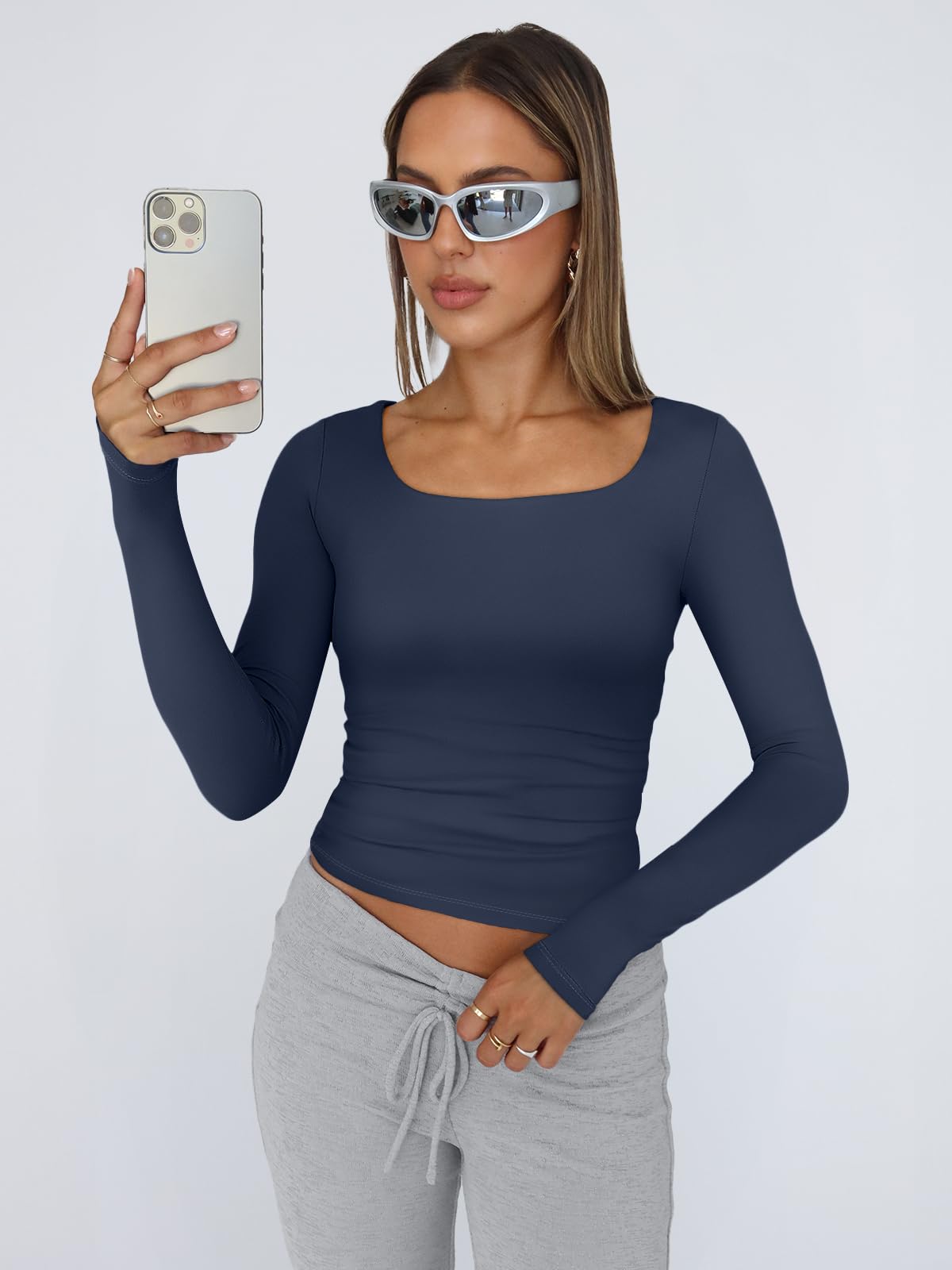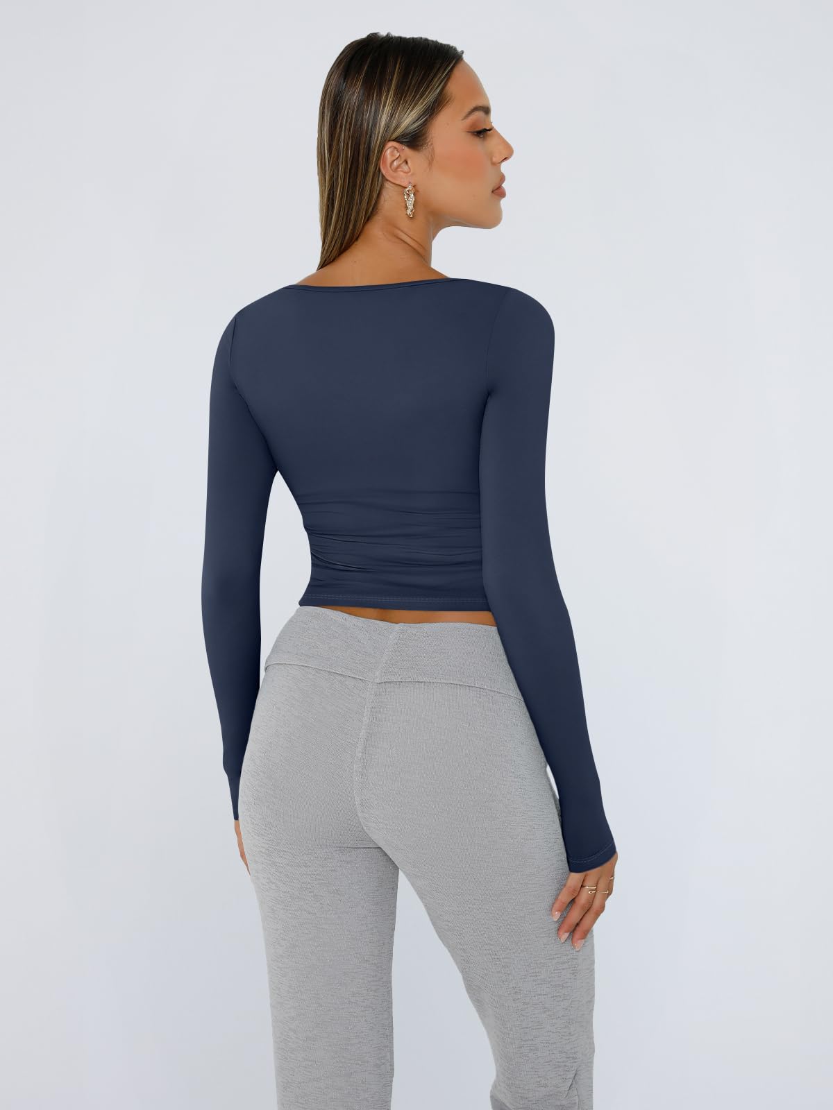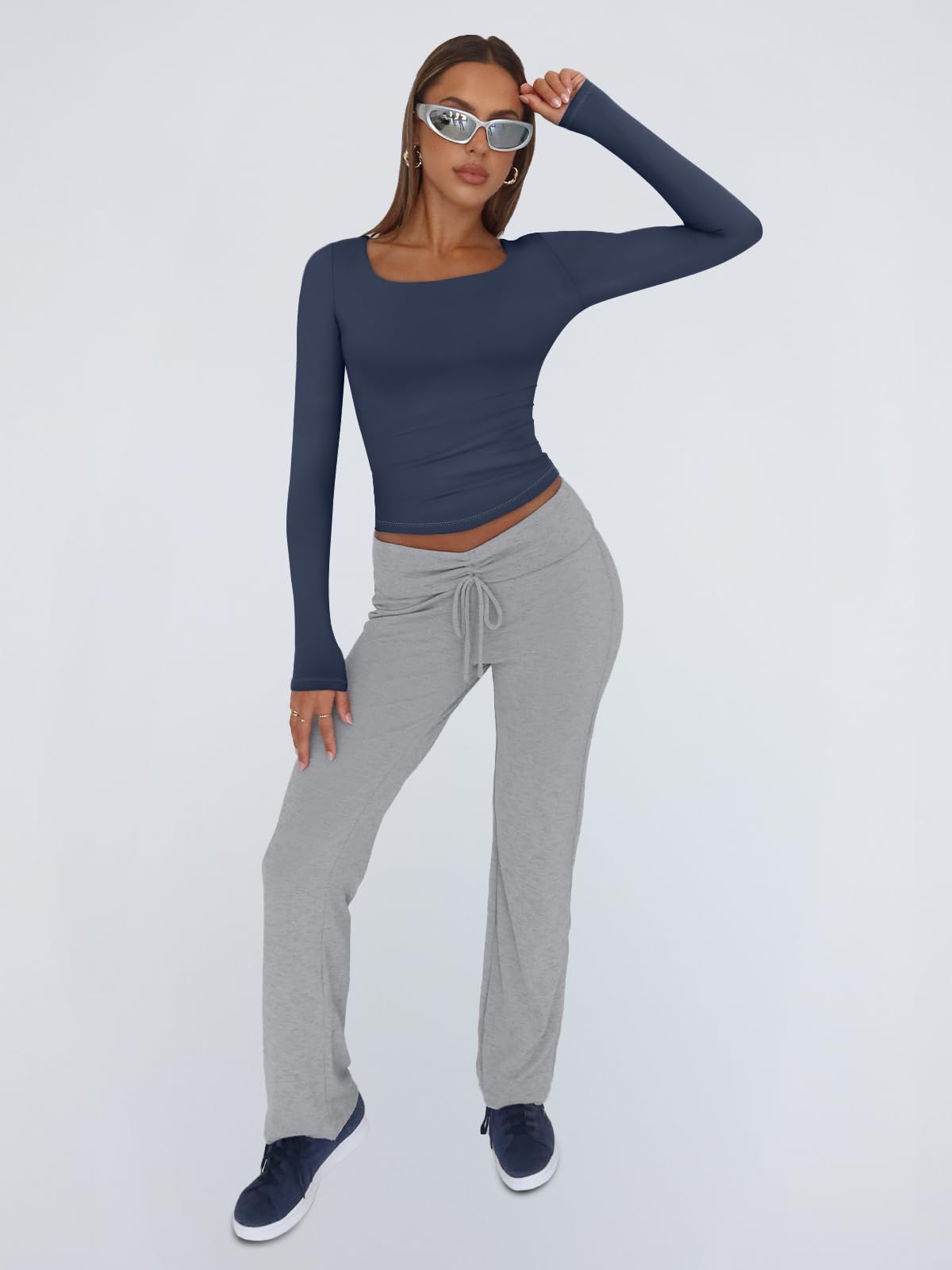 Y2K-Inspired Design: Features a clean tailored cut that can be worn full-length or folded into a cute crop top. With a body-hugging fit, low square neck, and long sleeves, it delivers a sleek yet casual Y2K aesthetic