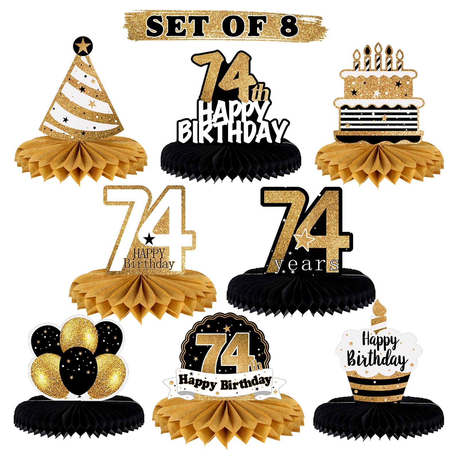Package:5 pieces 12 inch black latex balloon printed with the words "74 Happy Birthday",5 pieces 12 inch gold latex balloon printed with the words"74 Happy Birthday",5 piece 12 inch gold confetti balloons printed with the words"74 Happy Birthday", very suitable for women men 74th birthday party decorations