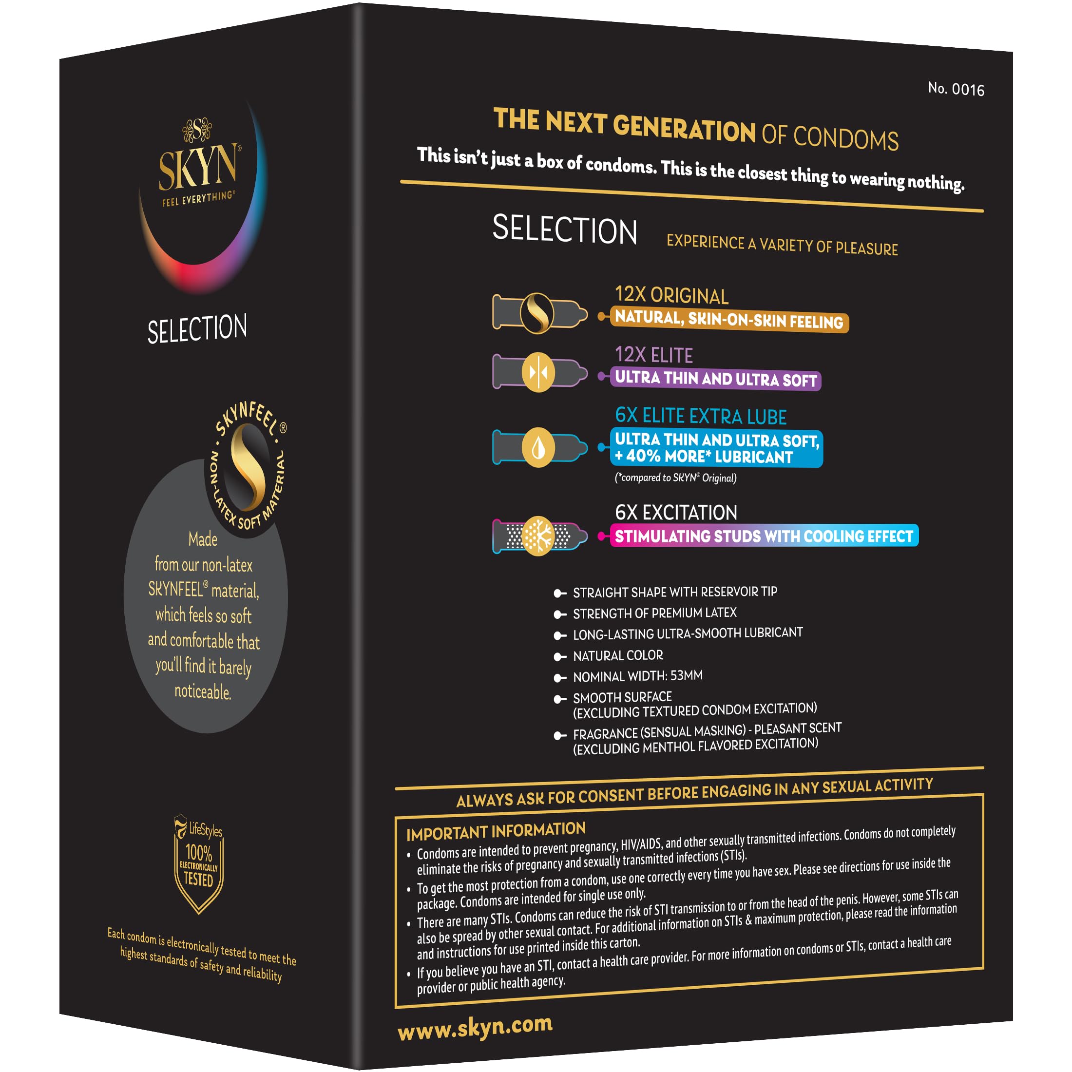 Variety of sensations: SKYN Selection Variety pack features 4 types of assorted lubricated non-latex condoms including 4 Original, 2 Excitation, 4 Elite, and 2 Elite Extra Lube; these condoms have a sensual masking fragrance