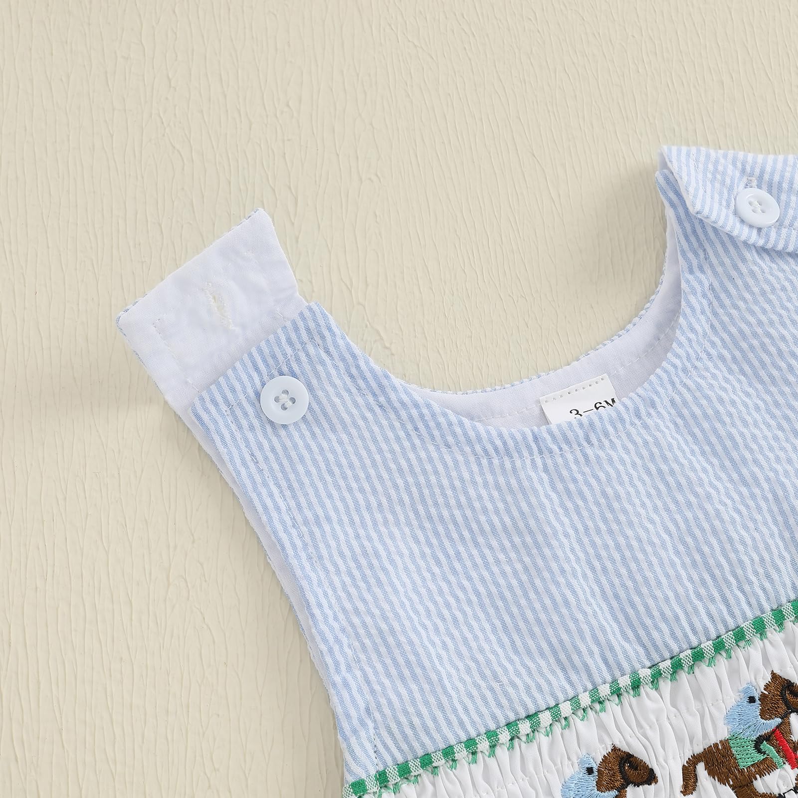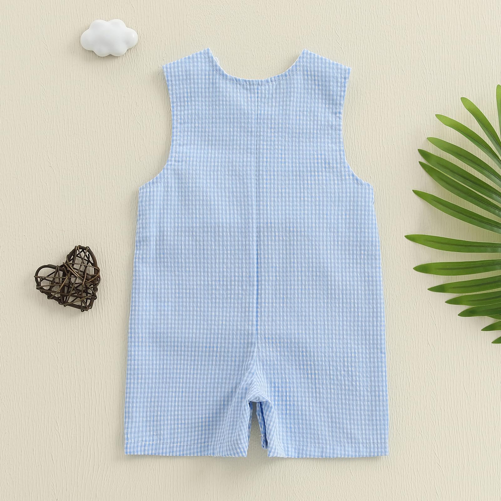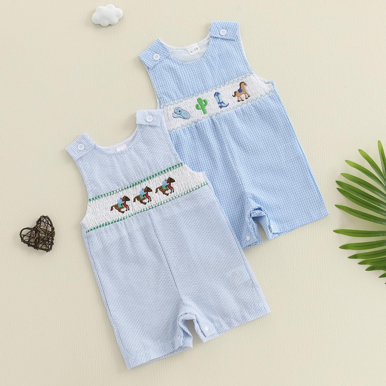 DESIGN: Baby spring clothes, use western elements embroidery, stripe/plaid, crewneck, sleeveless design, the snap closures at the bottom make diaper changes a breeze, making our infant boy summer clothes one piece jumpsuit a convenient choice for busy parents