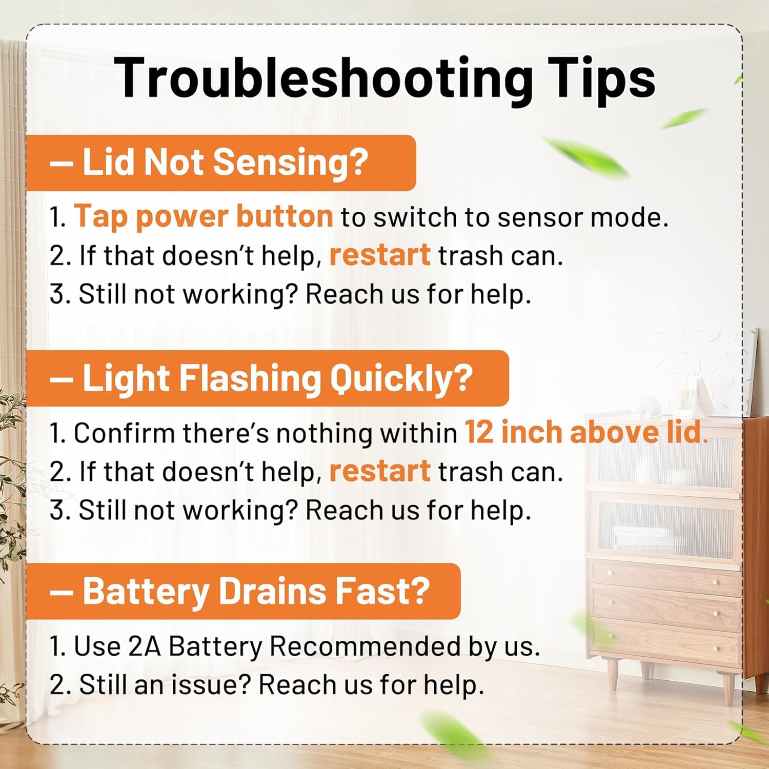 【CUSTOMER NOTICE】 The bathroom wastebasket requires two AA batteries (not included). Press and hold the switch to turn the power on/off. If the light flashes and the sensor does not work, you can try to turn off the power and restart the smart trash can.