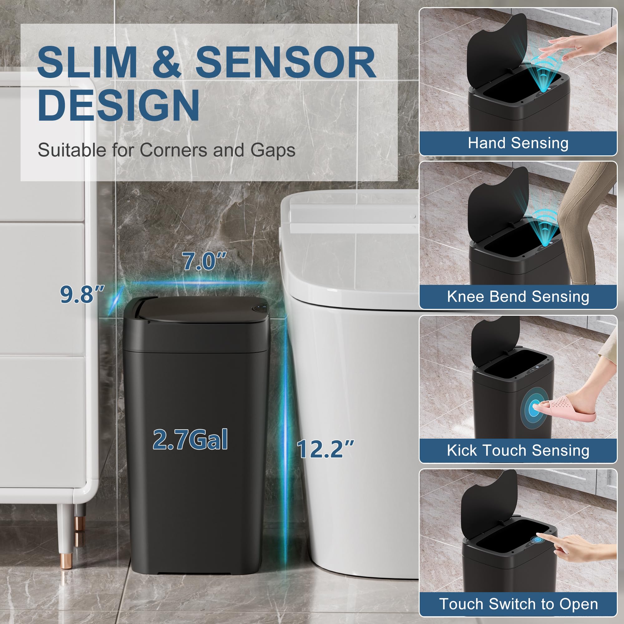 【SPACE SAVING & EASY TO USE】 The 2.7 Gal Slim Bathroom Trash Can fits perfectly in narrow spaces. Measuring 7.0" W, 9.8" W, 12.2" H maximizes indoor space utilization. It's suitable for use in bathrooms, kitchens, bedrooms, living rooms, offices, dorms, and more.