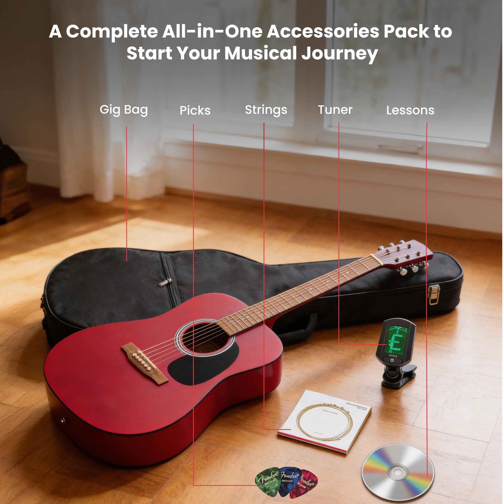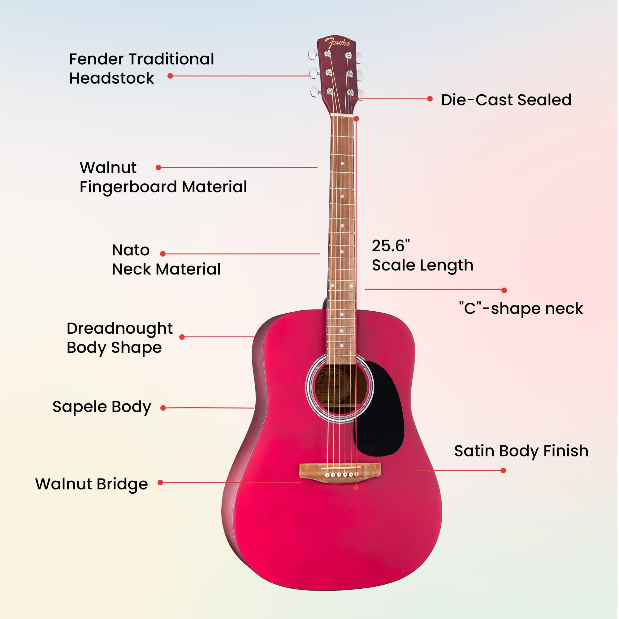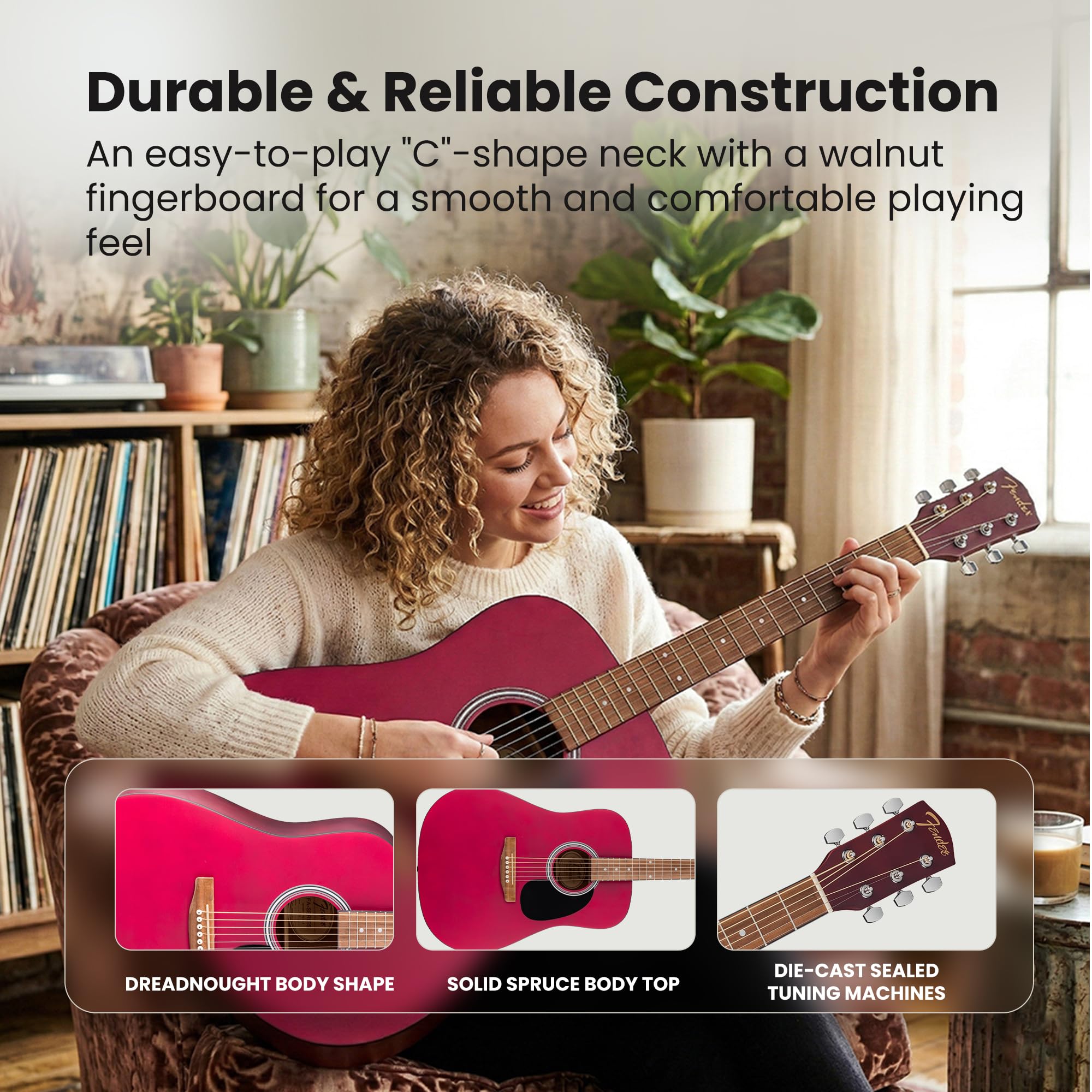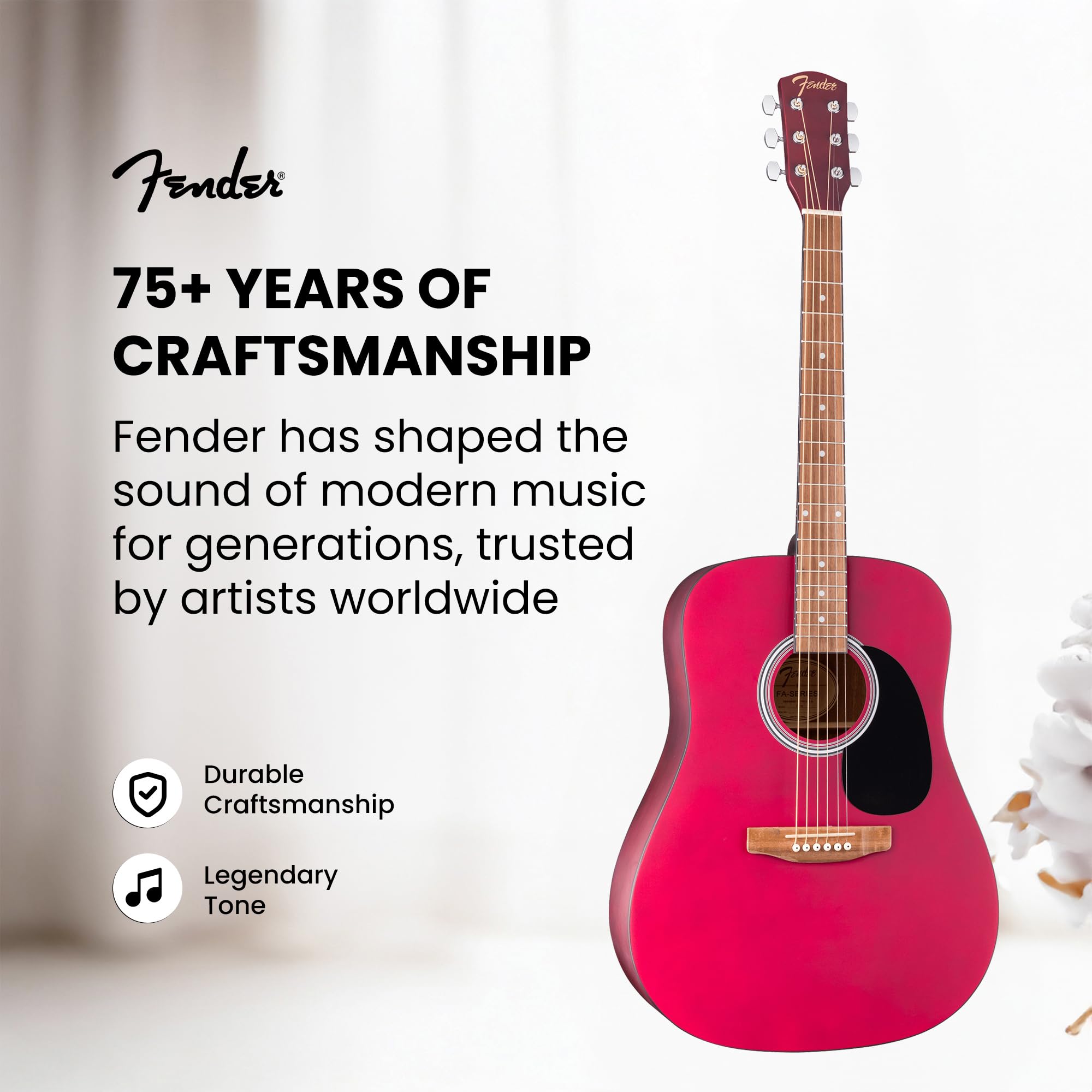 The Fender FA Series Dreadnought in Crimson Red is a well-crafted acoustic guitar that offers a blend of reliable Fender quality, player-friendly features, and an appealing design. As part of the Fender Alternative series, it features an all-laminate body construction made from premium tonewoods, providing durability and a balanced, resonant tone. The dreadnought body shape ensures a full, rich sound, making it a versatile choice for different playing styles. Designed for comfort, the "C"-shaped neck profile allows for an easy playing experience, complemented by a walnut fingerboard and bridge that enhance both feel and tone. The sealed-gear tuning machines help maintain stable and accurate tuning, while the smooth satin finish and body and neck binding add to both its durability and classic appearance. Whether for beginners or more experienced players, the Fender FA Series Dreadnought is a solid choice for those looking for a dependable and great-sounding instrument. Neck Finish: Satin Fingerboard Radius: 12" (305 mm) Fingerboard Material: Walnut Position Inlays: Pearloid Dot Number of Frets: 20 String Nut: Plastic Nut Width: 1.69" (43 mm) Nut Material: Plastic Body Finish: Satin Body Shape: Dreadnought Body Sides: Select Tonewood Bridge: Walnut Hardware Finish: Chrome Tuning Machines: Die-Cast Sealed Strings: .012"-.052" Dimension: 43.30x16.90x6.90 inches Weight: 6.90 pounds Austin Bazaar bundles your purchase with essential accessories. This bundle includes a gig bag to protect your guitar during travel, a tuner to keep your instrument in tune, extra strings and picks for later use, and an Austin Bazaar instructional DVD to provide tips and guidance as you learn your instrument.
