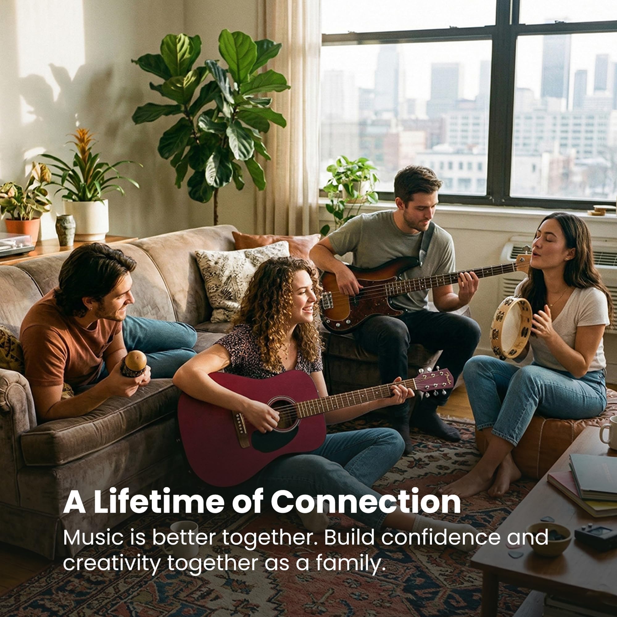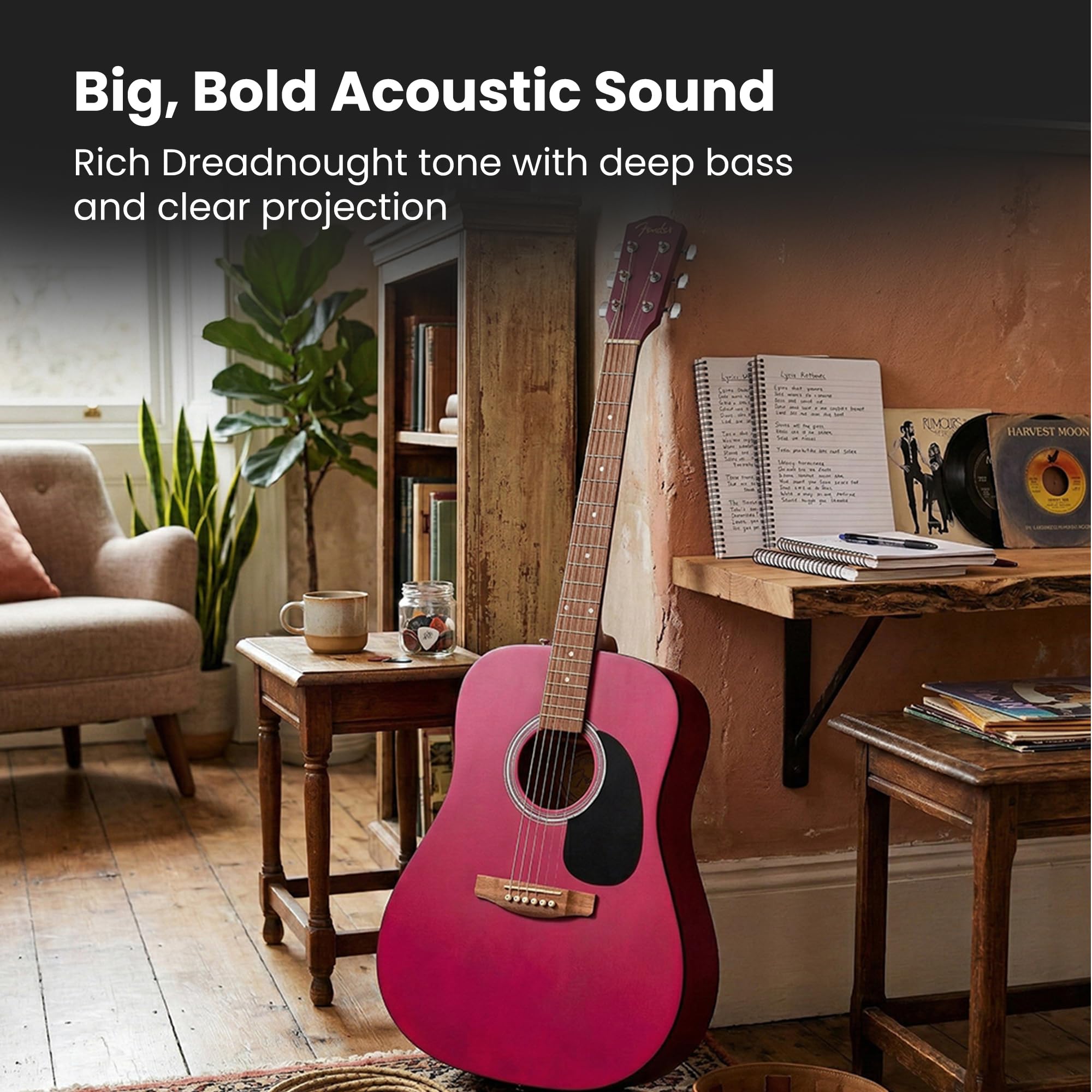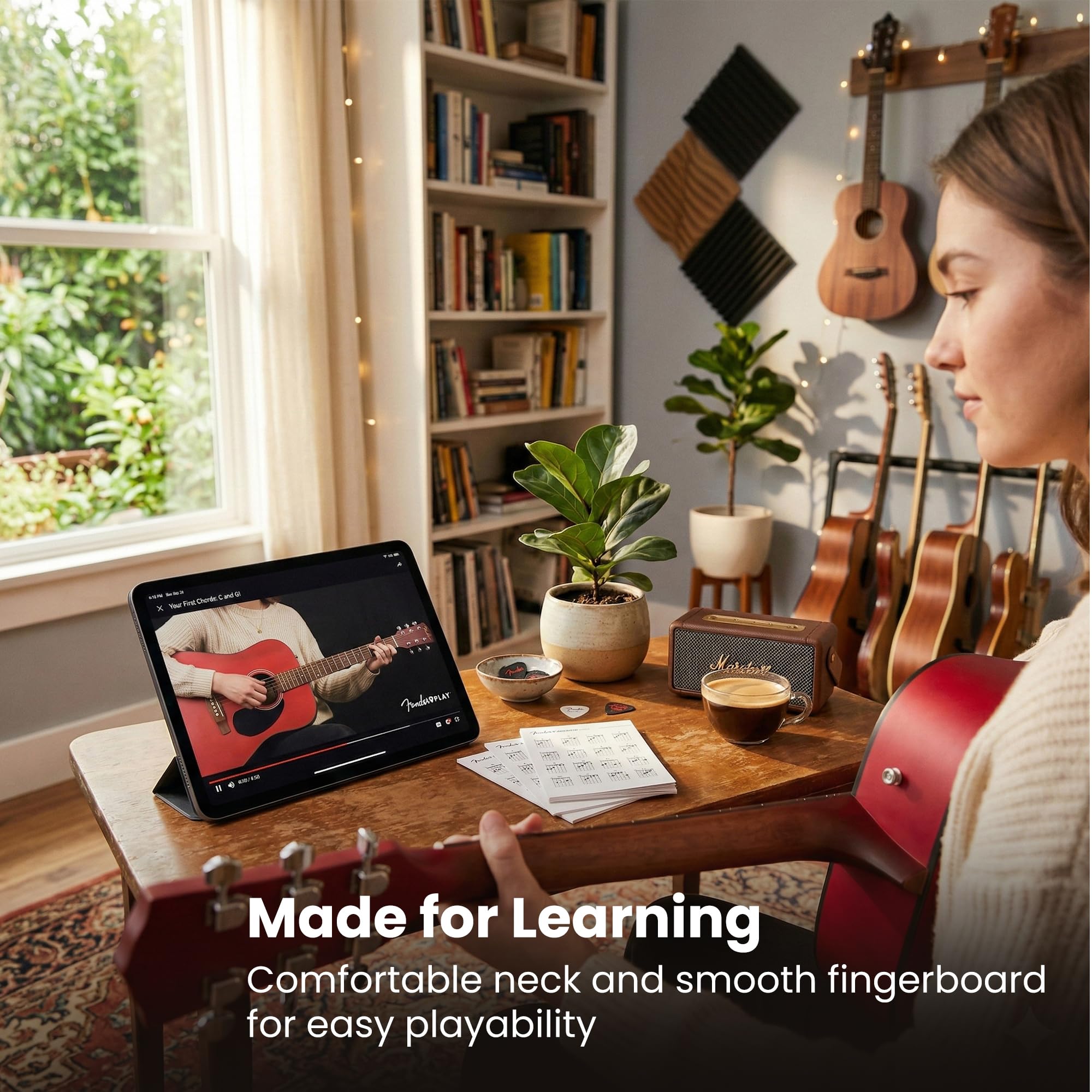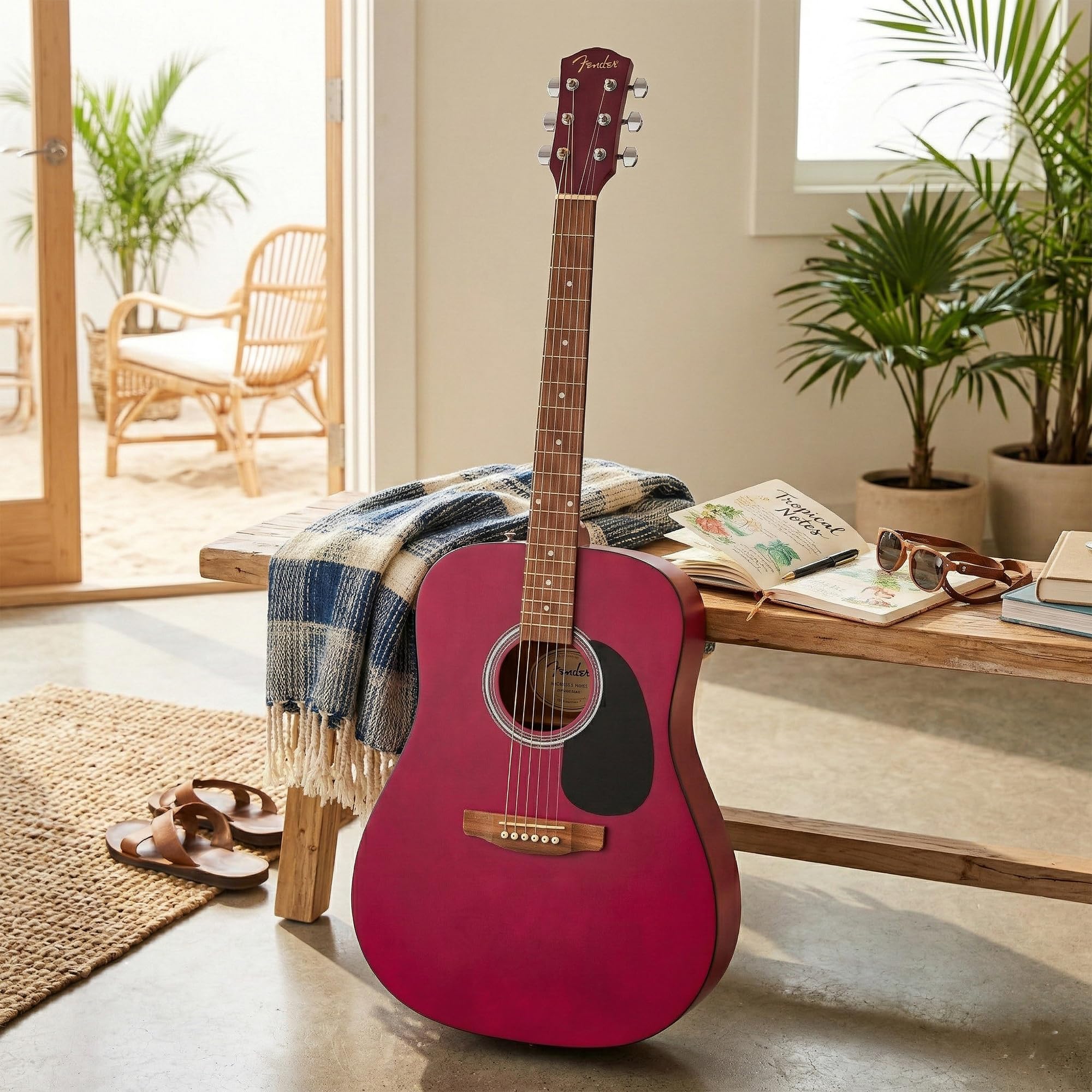 The Fender FA Series Dreadnought in Crimson Red is a well-crafted acoustic guitar that offers a blend of reliable Fender quality, player-friendly features, and an appealing design. As part of the Fender Alternative series, it features an all-laminate body construction made from premium tonewoods, providing durability and a balanced, resonant tone. The dreadnought body shape ensures a full, rich sound, making it a versatile choice for different playing styles. Designed for comfort, the "C"-shaped neck profile allows for an easy playing experience, complemented by a walnut fingerboard and bridge that enhance both feel and tone. The sealed-gear tuning machines help maintain stable and accurate tuning, while the smooth satin finish and body and neck binding add to both its durability and classic appearance. Whether for beginners or more experienced players, the Fender FA Series Dreadnought is a solid choice for those looking for a dependable and great-sounding instrument. Neck Finish: Satin Fingerboard Radius: 12" (305 mm) Fingerboard Material: Walnut Position Inlays: Pearloid Dot Number of Frets: 20 String Nut: Plastic Nut Width: 1.69" (43 mm) Nut Material: Plastic Body Finish: Satin Body Shape: Dreadnought Body Sides: Select Tonewood Bridge: Walnut Hardware Finish: Chrome Tuning Machines: Die-Cast Sealed Strings: .012"-.052" Dimension: 43.30x16.90x6.90 inches Weight: 6.90 pounds Austin Bazaar bundles your purchase with essential accessories. This bundle includes a gig bag to protect your guitar during travel, a tuner to keep your instrument in tune, extra strings and picks for later use, and an Austin Bazaar instructional DVD to provide tips and guidance as you learn your instrument.