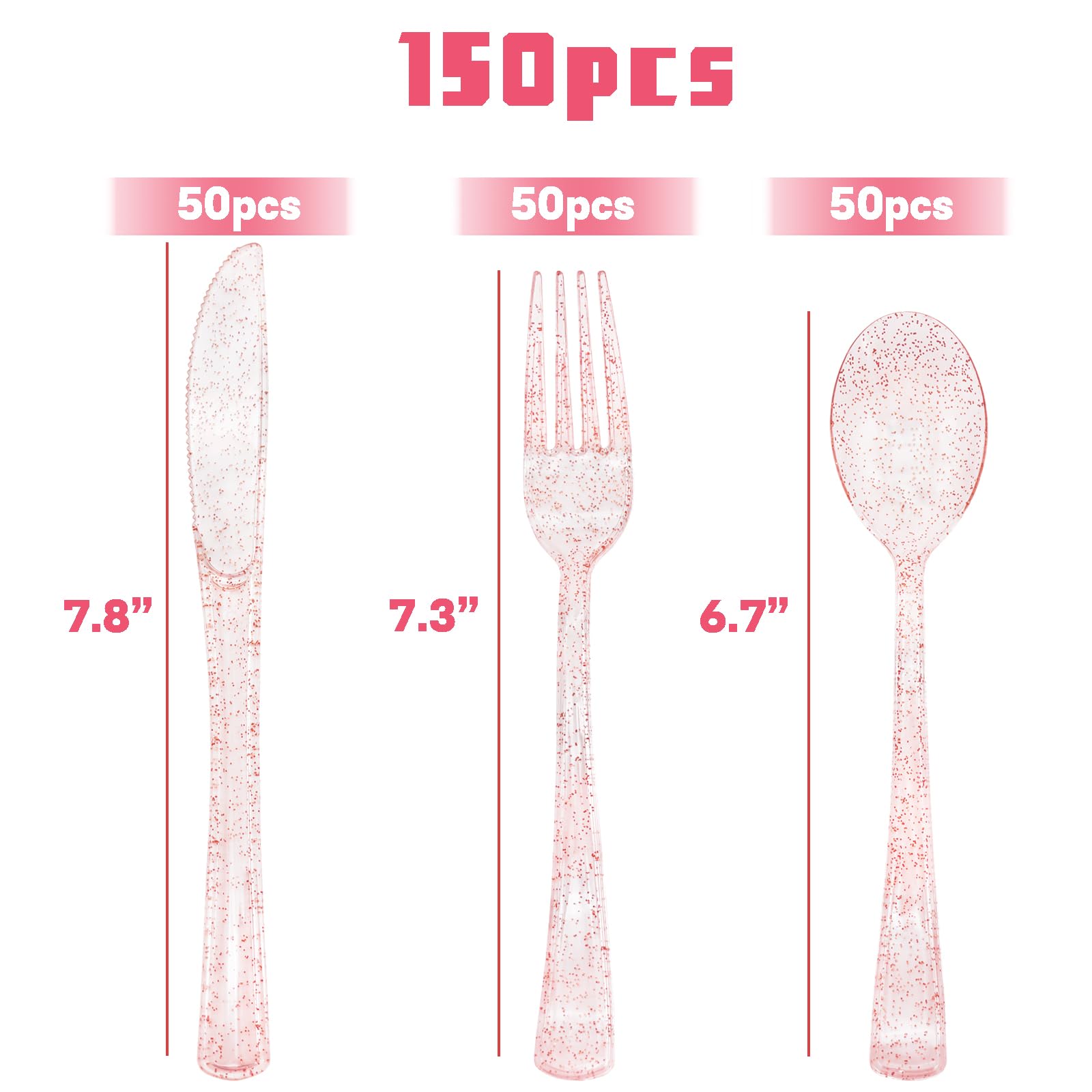【Cost-Effective Plastic Silverware】: This pink utensils set includes 50 rose gold forks, 50 rose gold spoons and rose gold knives, total 150 plastic cutlery. The pink utensil set is versatile and affordable for everyday use, family gatherings or business purposes.