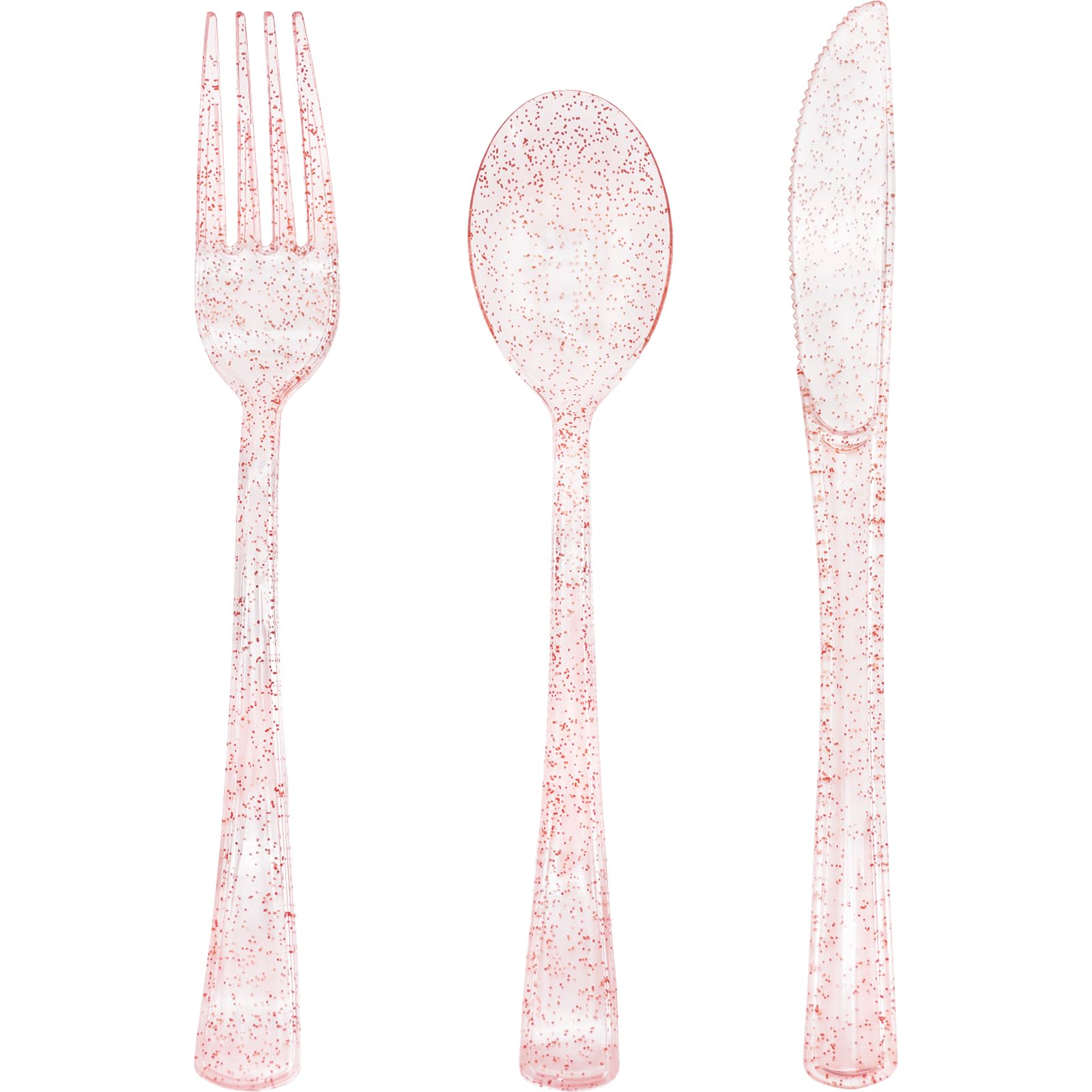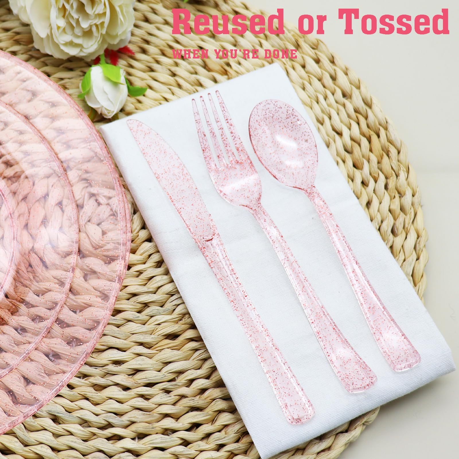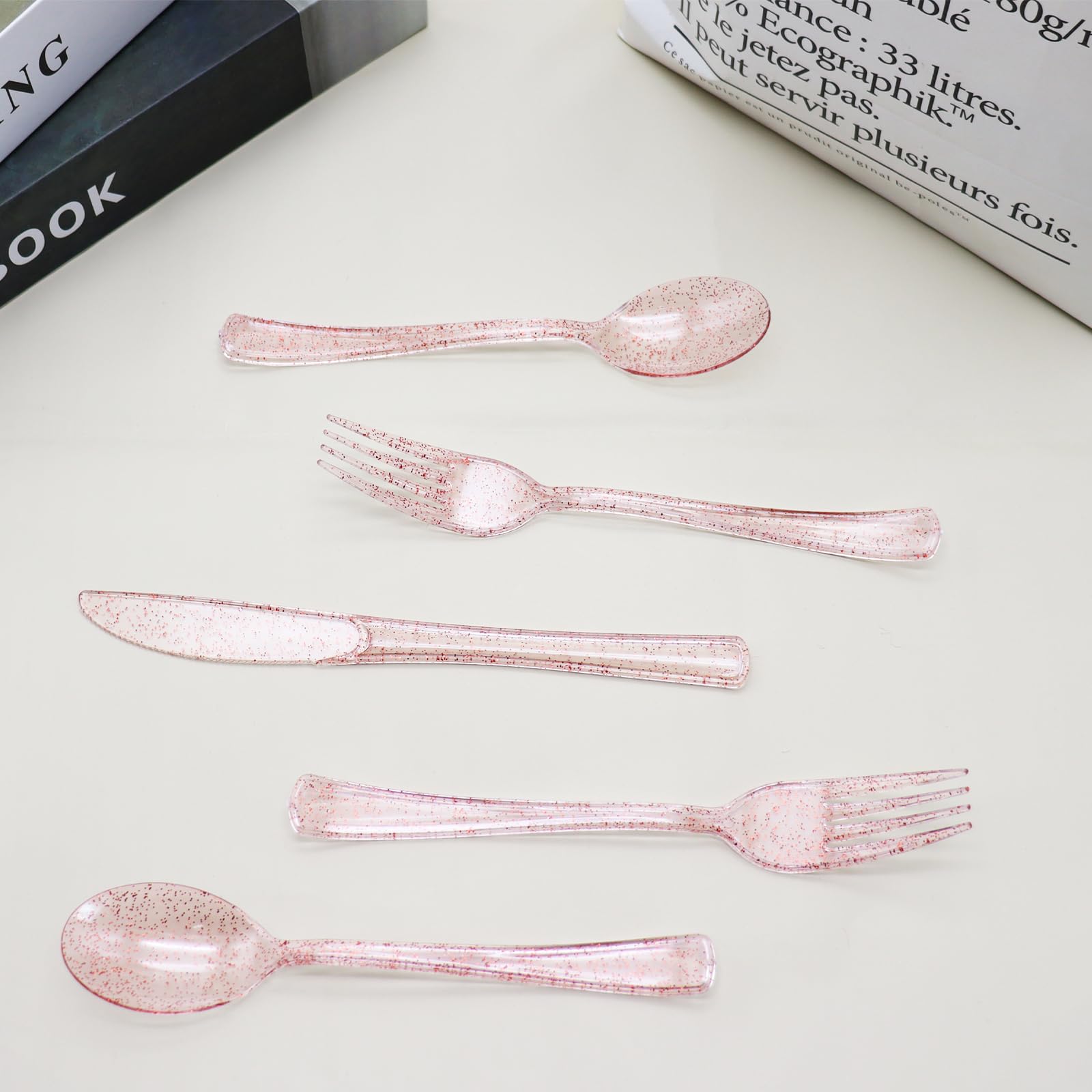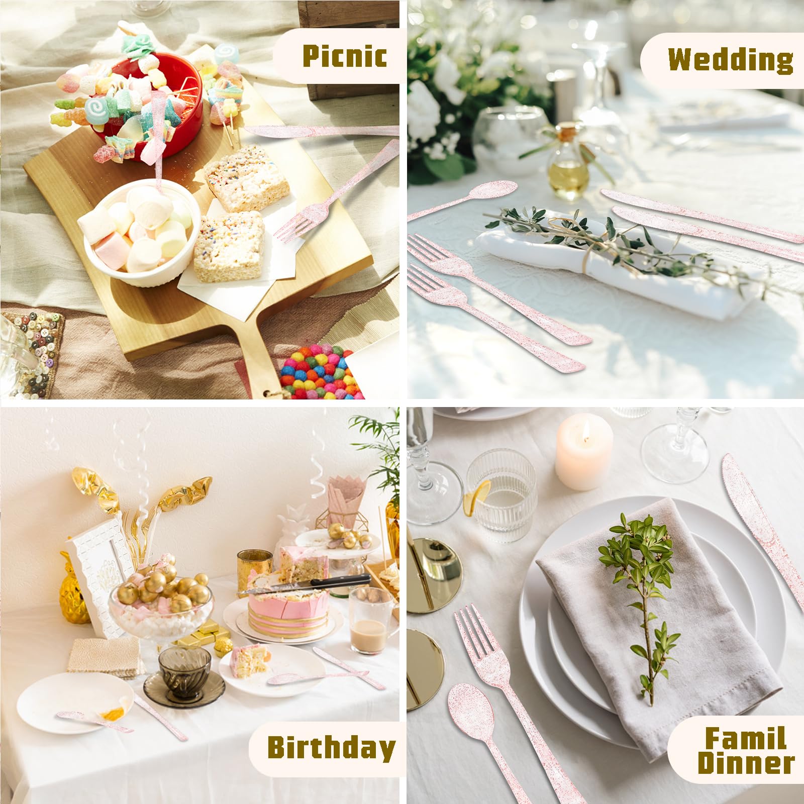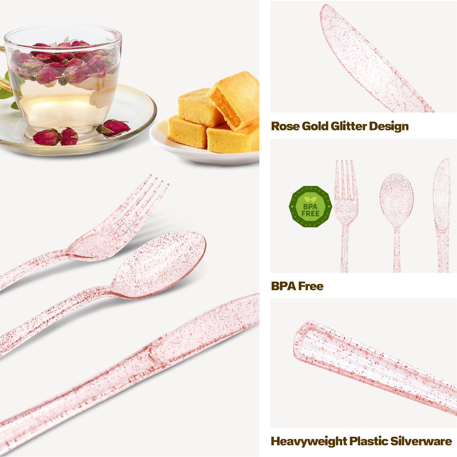 【Unique Rose Gold Glitter Design 】: Rose Gold is a warm and romantic color that can give a pleasant and comfortable feeling. The unique glitter appearance brings a sense of modernity and fashion. Plastic silverware is not only practical tableware, but also decorative on the table, adding bright and lively colors to the table.