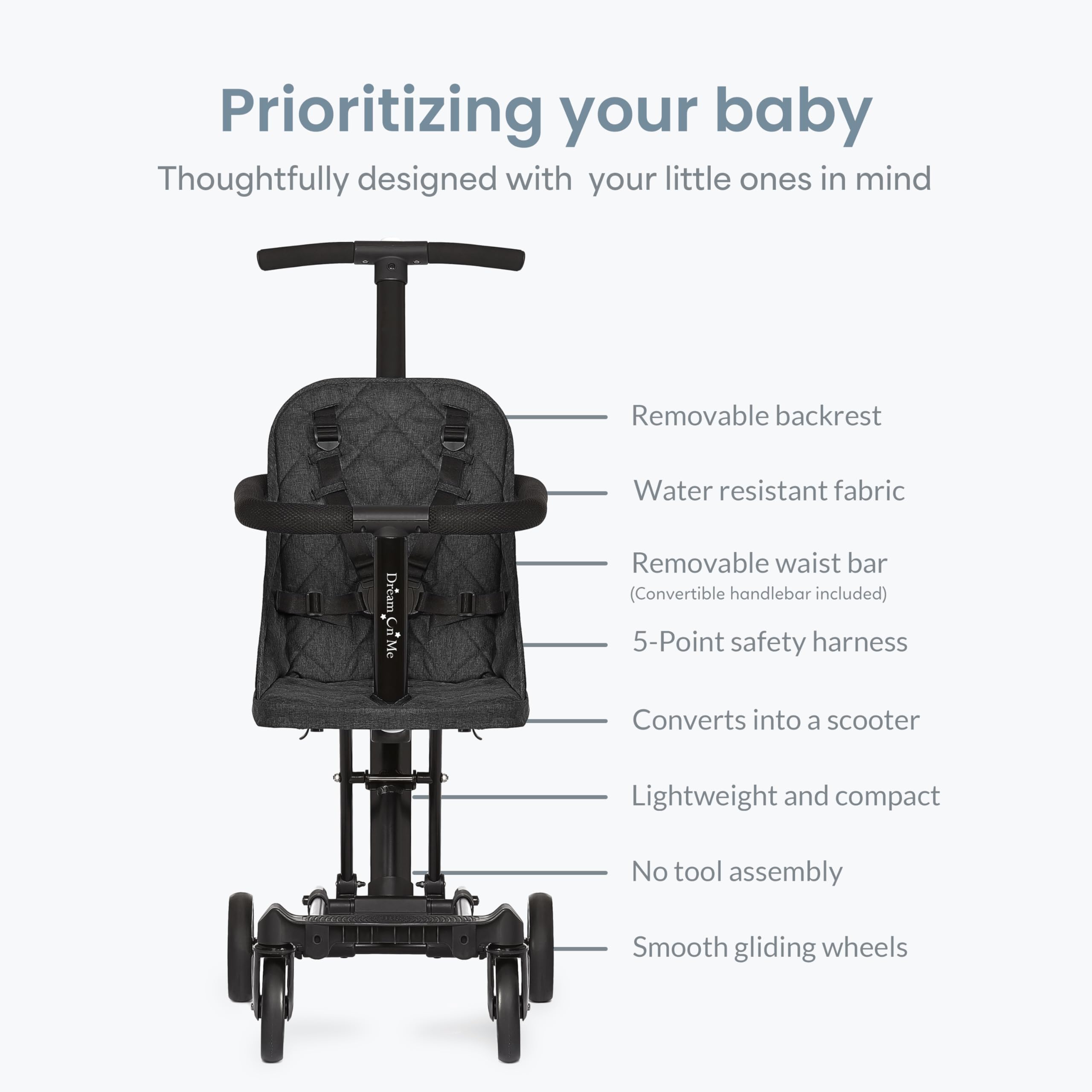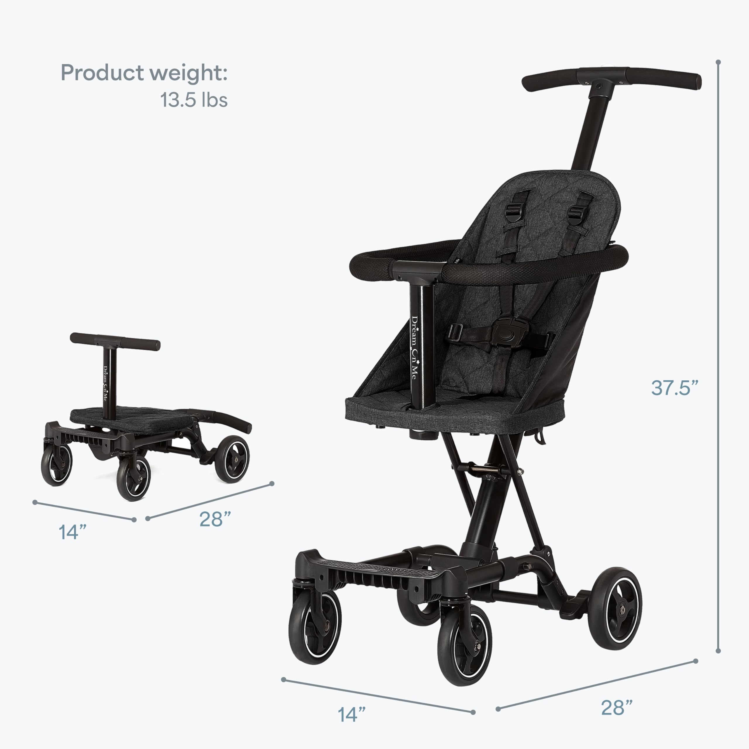 Every great adventure begins with a smooth ride — and for families on the move, the Dream On Me Coast Rider Travel Stroller is the perfect companion. Thoughtfully designed for modern parents, this stroller blends functionality, comfort, and safety in a lightweight, compact frame that’s built to go wherever life takes you. Weighing just 13.5 lbs, the Coast Rider is crafted from durable aluminum, offering long-lasting performance without added bulk. Whether it’s navigating crowded city streets, boarding a flight, or fitting into a compact car trunk, this stroller’s sleek, easy-to-maneuver design makes every outing feel effortless. Parents love its innovative book-fold mechanism, which folds flat in seconds — ideal for air travel, road trips, or apartment living. Compact yet sturdy, it’s perfectly sized for families who value convenience without compromise. And for those special days out, the Coast Rider is theme park approved, ensuring hassle-free entry and smooth cruising through your favorite destinations. The adjustable handlebar ensures comfort for parents of all heights, while soft-ride wheels glide effortlessly across sidewalks, malls, and park paths. Add in the secure 5-point harness, and you’ve got a stroller that guarantees a safe and cozy journey for your little one. But the Coast Rider isn’t just a stroller — it’s a versatile mobility system that grows with your child. As your little explorer gets older, it converts into a rider or scooter, offering a fun, flexible, and long-term solution for every stage of their development. To enhance your experience even further, optional accessories like the Coast Rider Canopy (for sun protection) and Coast Rider Connector (to link with another stroller or shopping cart) are available separately — transforming this stroller into a customized tandem travel system for busy families. Recognized for excellence, the Coast Rider has earned multiple prestigious awards, including the JPMA Innovation Award, Baby Maternity Product of the Year, and National Parenting Product Award. It meets and exceeds ASTM and CPSC safety standards, ensuring every ride is as safe as it is enjoyable. Compact yet spacious, it measures 28” L × 14” W × 37.5” H and supports up to 45 lbs. Whether you’re strolling through the park, traveling across the country, or heading out for a weekend getaway, the Dream On Me Coast Rider Travel Stroller is your trusted, travel-ready partner. ⚠️ Safety Note Never leave your child unattended in the Stroller/Rider. The five-point safety harness must be secured at all times when your baby or child is in the stroller/rider. Do not hang shopping bags, purses, diaper bags, or any other items from the handle — additional weight could tip the stroller or cause entanglement, leading to injury. Always follow the manufacturer’s safety protocols for secure and responsible use.