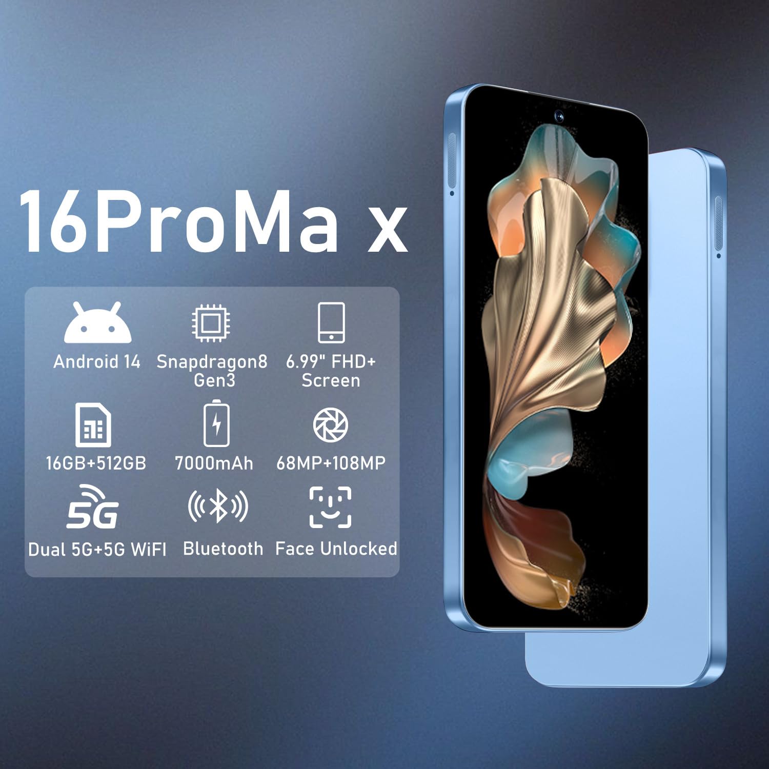 📱【Global Band Dual SIM Phone】16PROMA X dual sim unlocked phone is GSM phone and using 5G, which have faster transmission speed, lower latency, high positioning accuracy, and wide link for customers to feel a more. The 5g phone support 2 Nano SIM, With WIFI+BT+FM+GPS function to meet the needs of daily life.