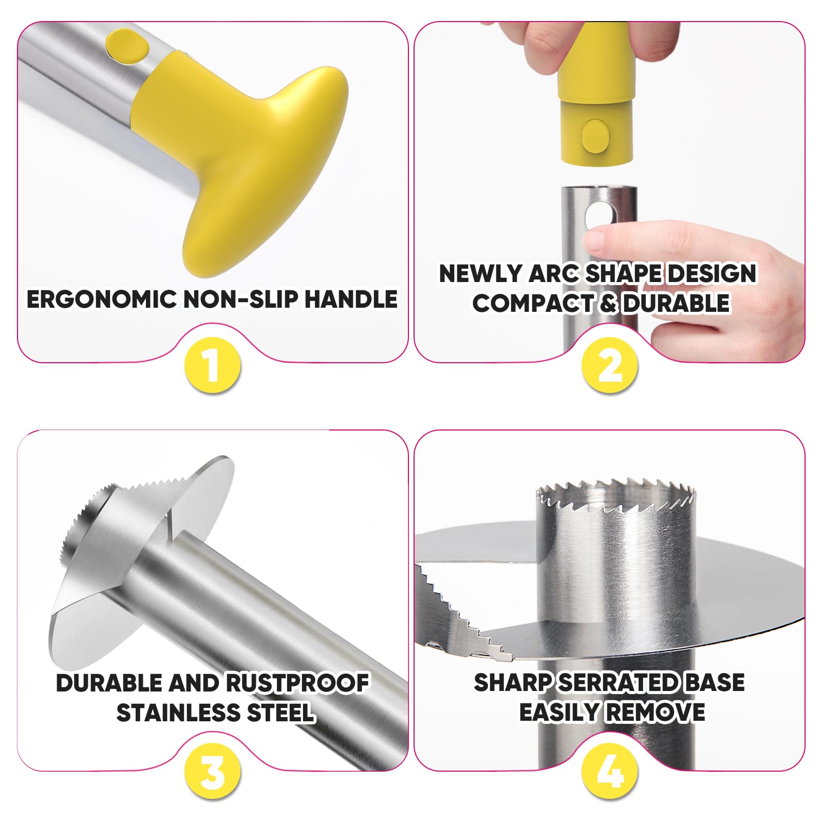 Ergonomic handle to effortlessly twists or push corer through the pineapple, etc.
