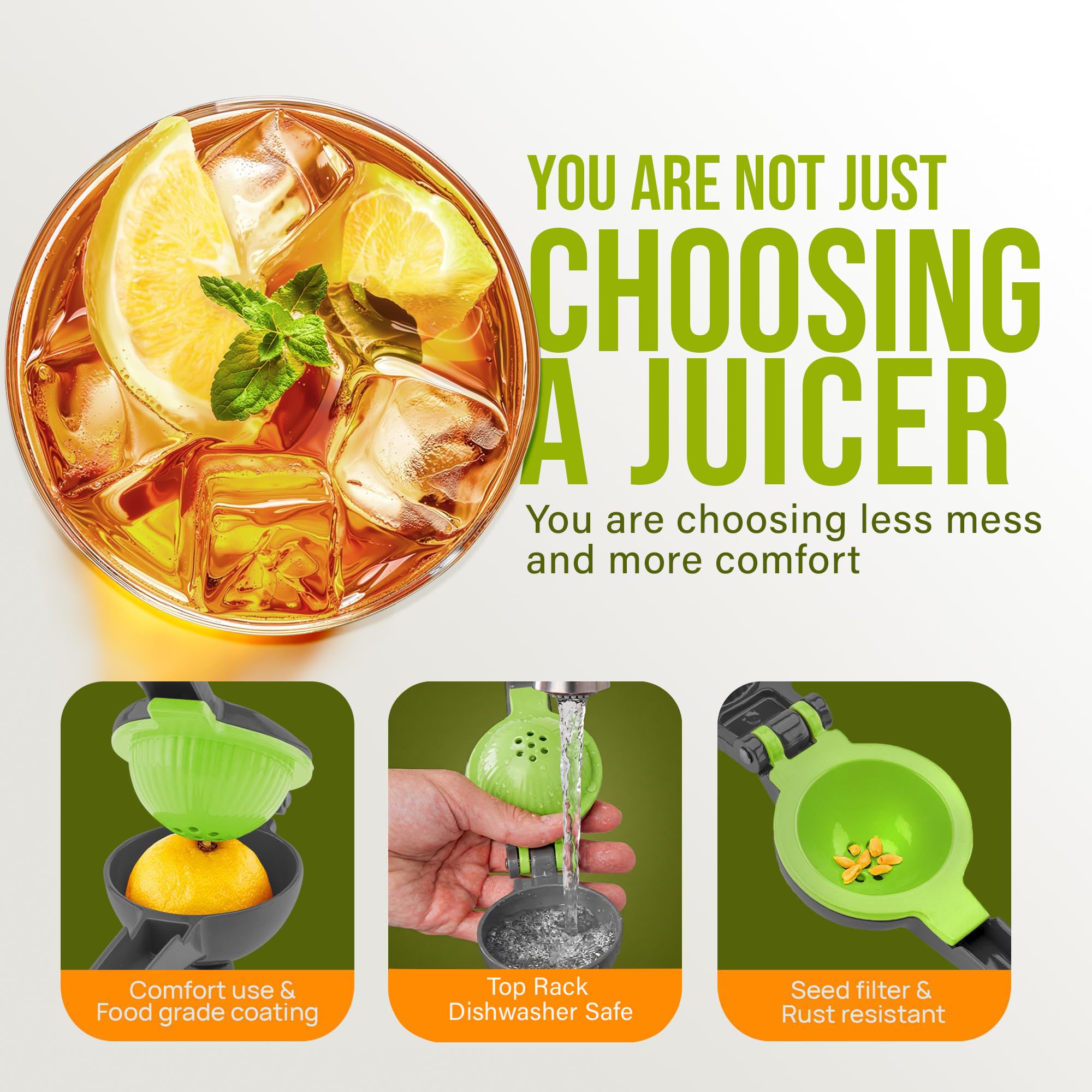 SQUEEZE OUT EVERY DROP OF JUICE: Our 2-in-1 lemon squeezer won’t waste a single drop from your favorite fruit! We have designed this lime juicer to be easy on hands. Watch limes, lemons, and small oranges beg for mercy, even with a soft squeeze. The holes at the bottom of the citrus juicer serve as a seed filter to prevent the pulp and seeds from getting in your way.
