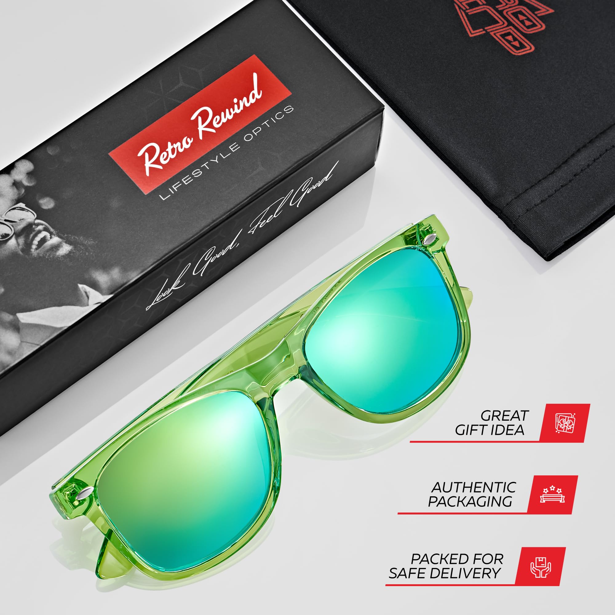 🕶️ SURPRISE YOUR LOVED ONES WITH A PAIR OF RETRO GLASSES: Every pair of Retro Rewind classic polarized sunglasses comes with an authentic Retro Rewind microfiber pouch and a Classy Gift Box. Spoil yourself, your wife or girlfriend, husband or boyfriend, family or friends with a pair of high-quality vintage sunglasses, which will not cost a small fortune.