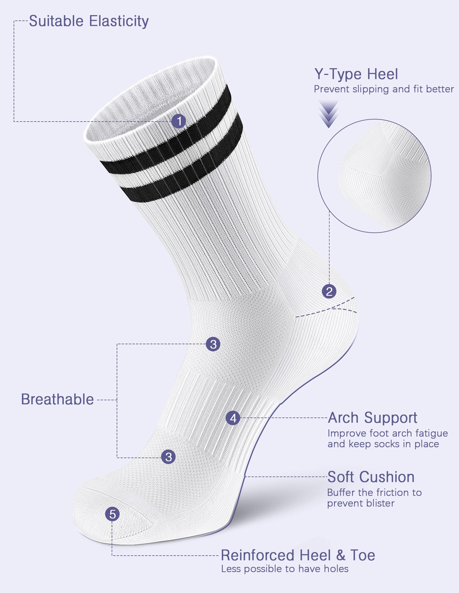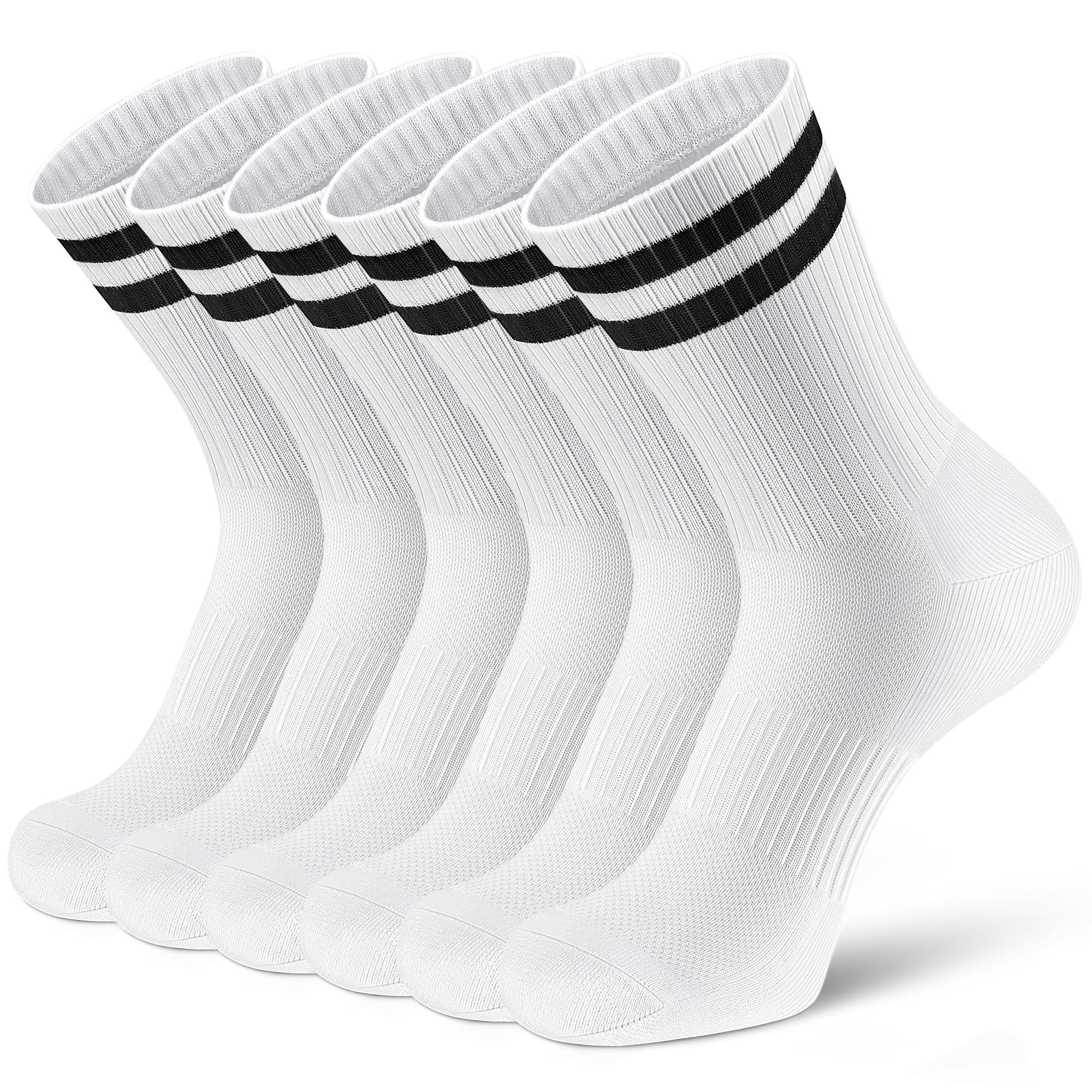 [FULL CUSHIONED SPORT SOCKS]: Crew socks provide better support, constructed with soft plush sole cushioning for extra durability and softness in high-wear areas, reduce the impact on the knee. Elastic arch support and mesh top design are provided with proper compression force, meanwhile, can also keep in good air permeability. Comfortable seamless toe ensures protection against yarn chafing and irritation caused by traditional toe seams.