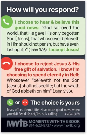 SUMMARY: This Mini Tract is clear & concise. You can either accept Jesus or reject His free gift of salvation. FEATURES: This 2-sided card measures 2.25 x 3.5 inches. Shrink-wrapped in packets of 100. Verse quotations from the KJV. Colorful images and high-quality, glossy paper increase appeal. Written, designed, and printed in the USA. Use these evangelistic handouts to share the good news of Jesus everywhere you go! FULL TEXT OF MESSAGE: How will you respond? I choose to hear & believe this good news: βGod so loved the world, that He gave His only begotten Son [Jesus], that whosoever believeth in Him should not perish, but have everlasting lifeβ (John 3:16). I accept Jesus! I choose to reject Jesus & His free gift of salvation. I know Iβm choosing to spend eternity in Hell:Whosoever βbelieveth not the Son [Jesus] shall not see life; but the wrath of God abideth on himβ (John 3:36). The choice is yours