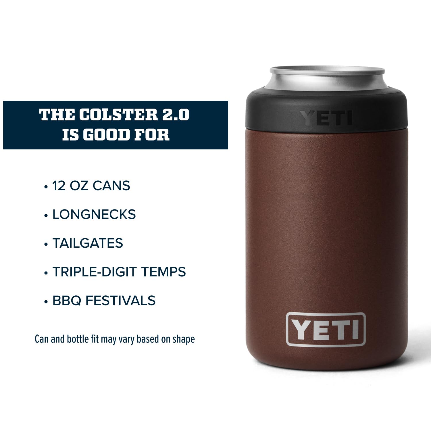The YETI Standard Colster 2.0 is good for: Standard 12 oz. Cans, Longnecks, Tailgates, Triple-digit temps and BBQ festivals. Can and bottle fit may vary based on shape