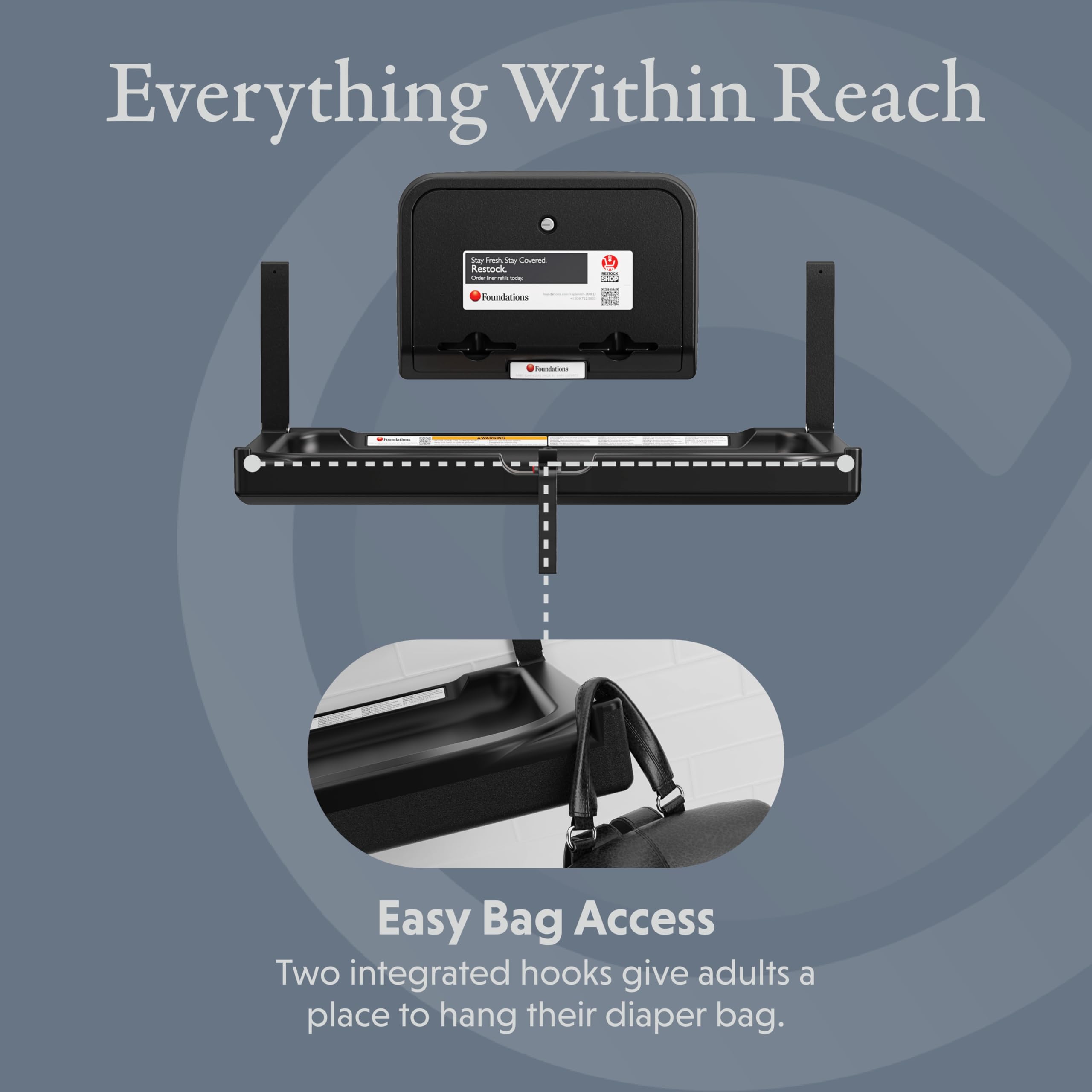Space Saving Design: Closed dimensions of 33.8”W x 3.95”D x 21”H fit tight restrooms. Opens to include two integrated hooks, keeping diaper bags or purses conveniently within reach during use.