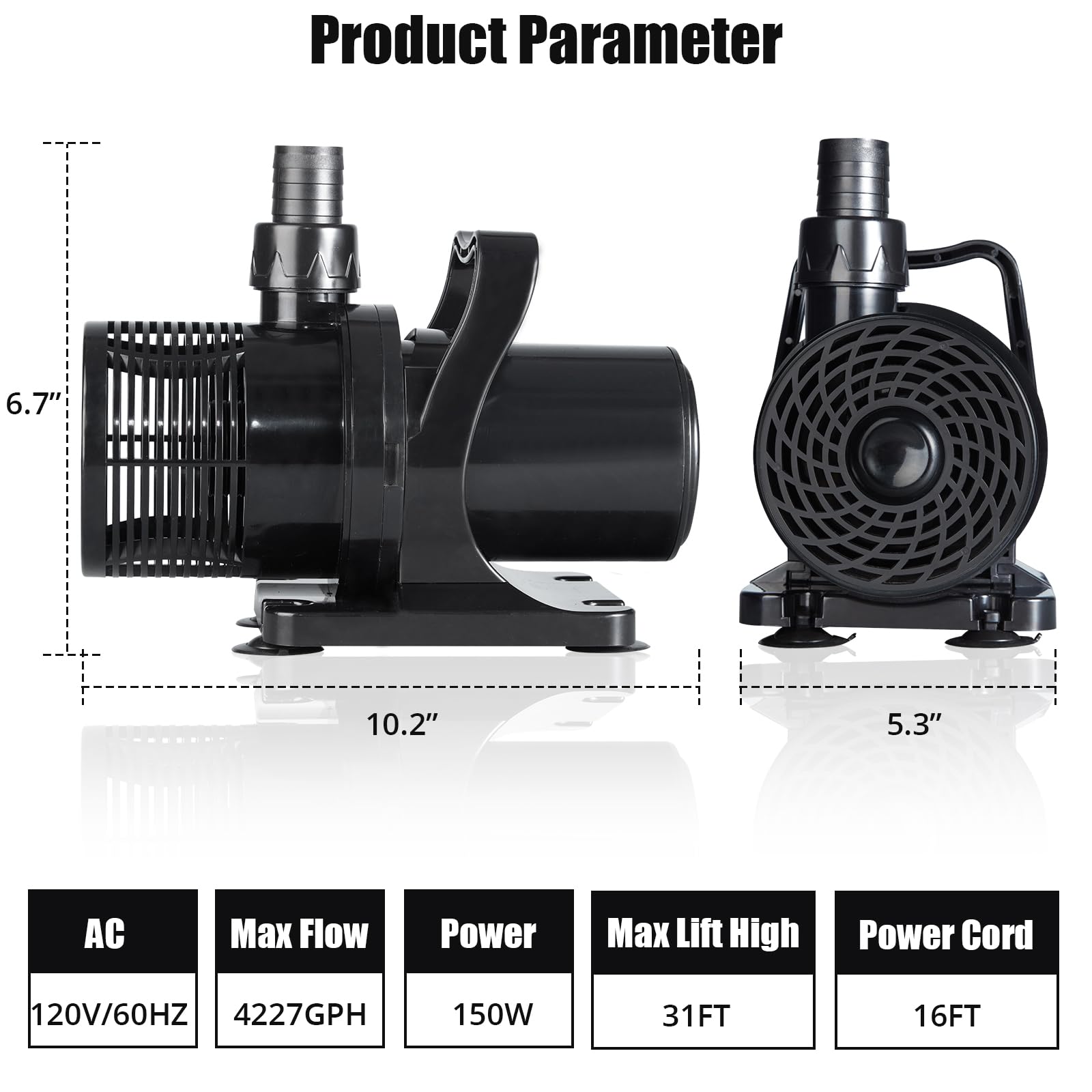 4227 GPH High Flow Submersible Water Pump, 150W Pond Pump, Submersible Pump with 31 FT. Lift Height Ultra Quiet for Pond, Waterfall, Fish Tank, Statuary, Hydroponic