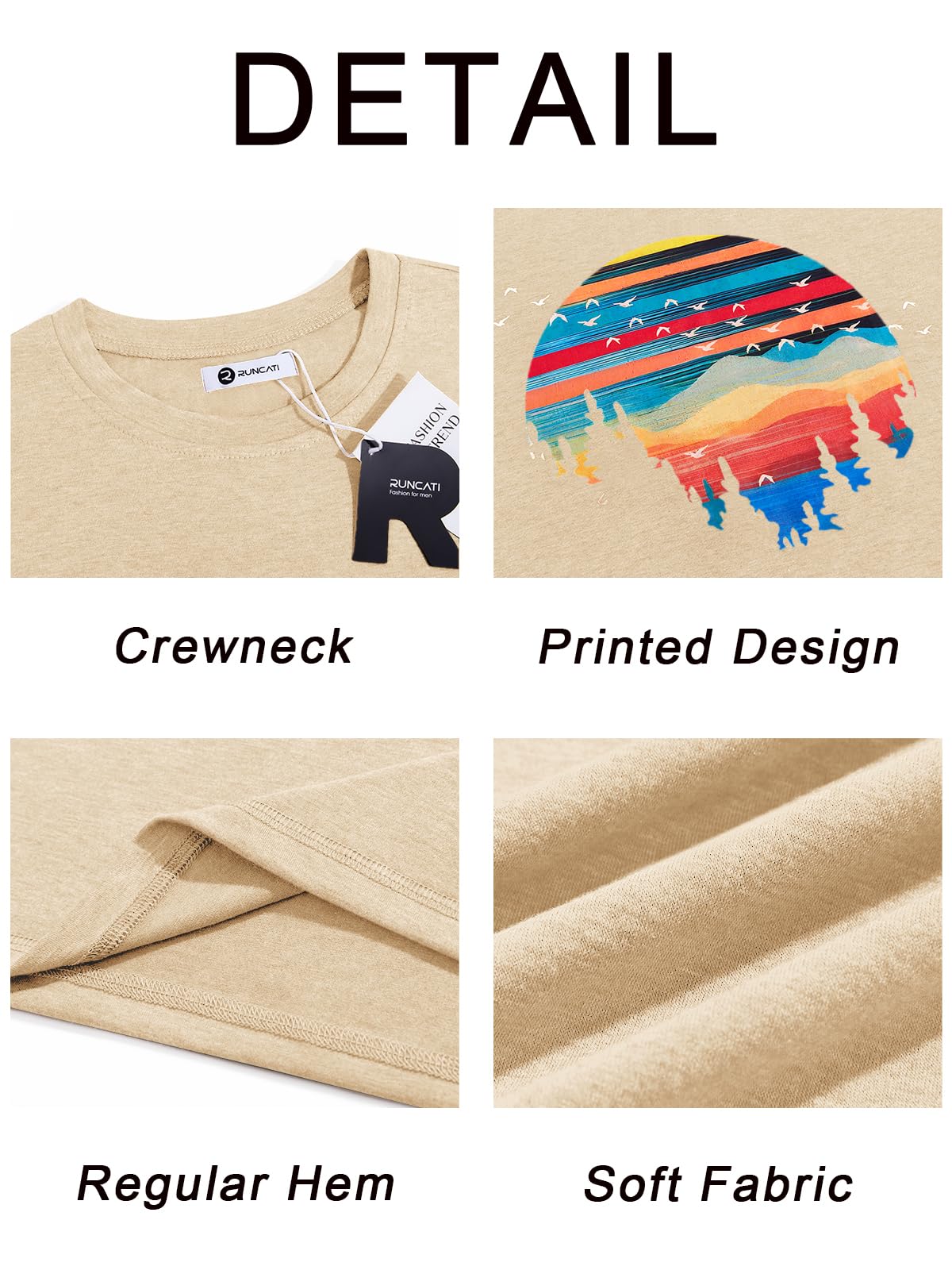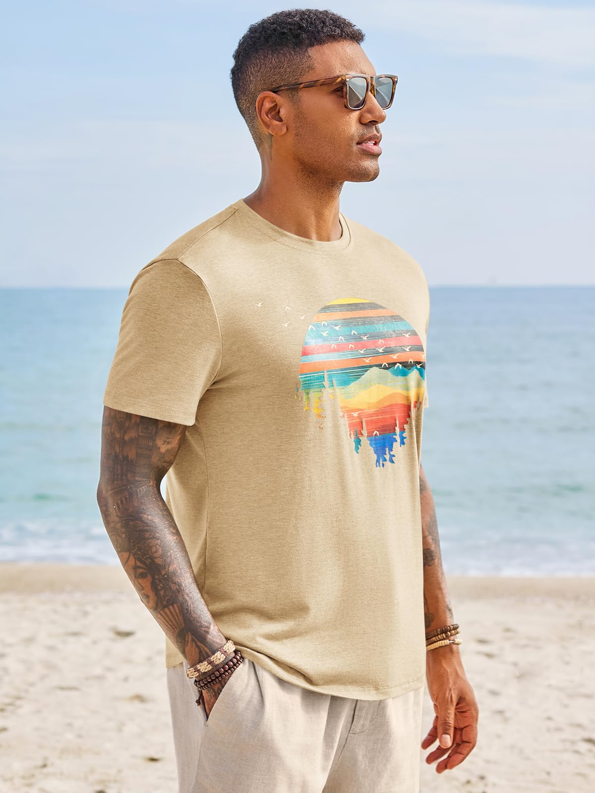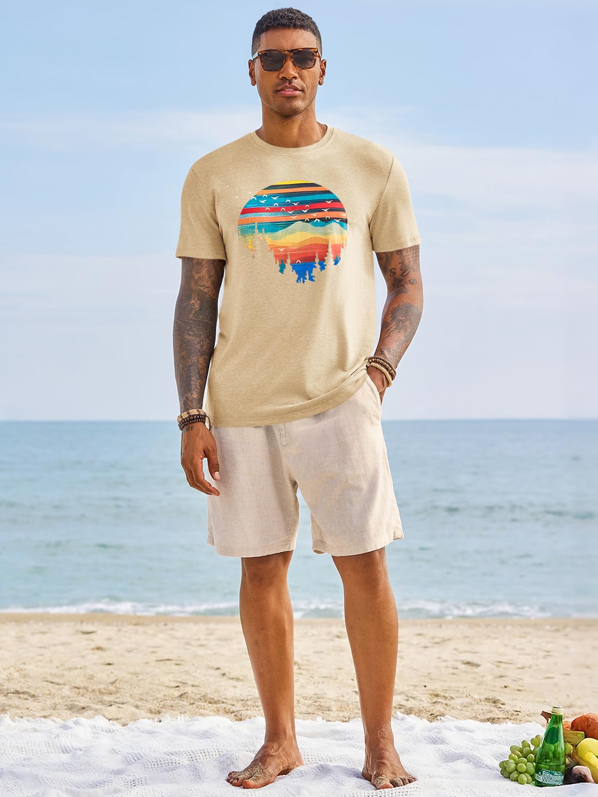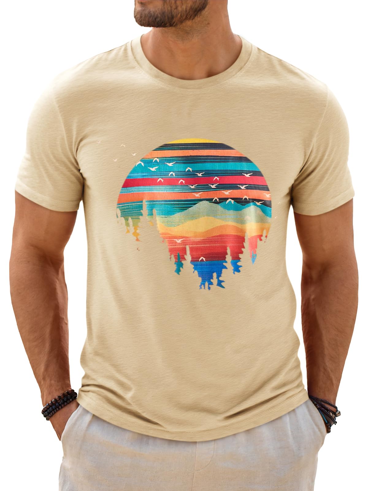 【Features】: Mens summer tshirts are feature with short sleeve, round neck, solid color with geometric nature sunset printed, that add a timeless and versatile style to these t-shirts, and loose fit style give you more relaxed and freedom
