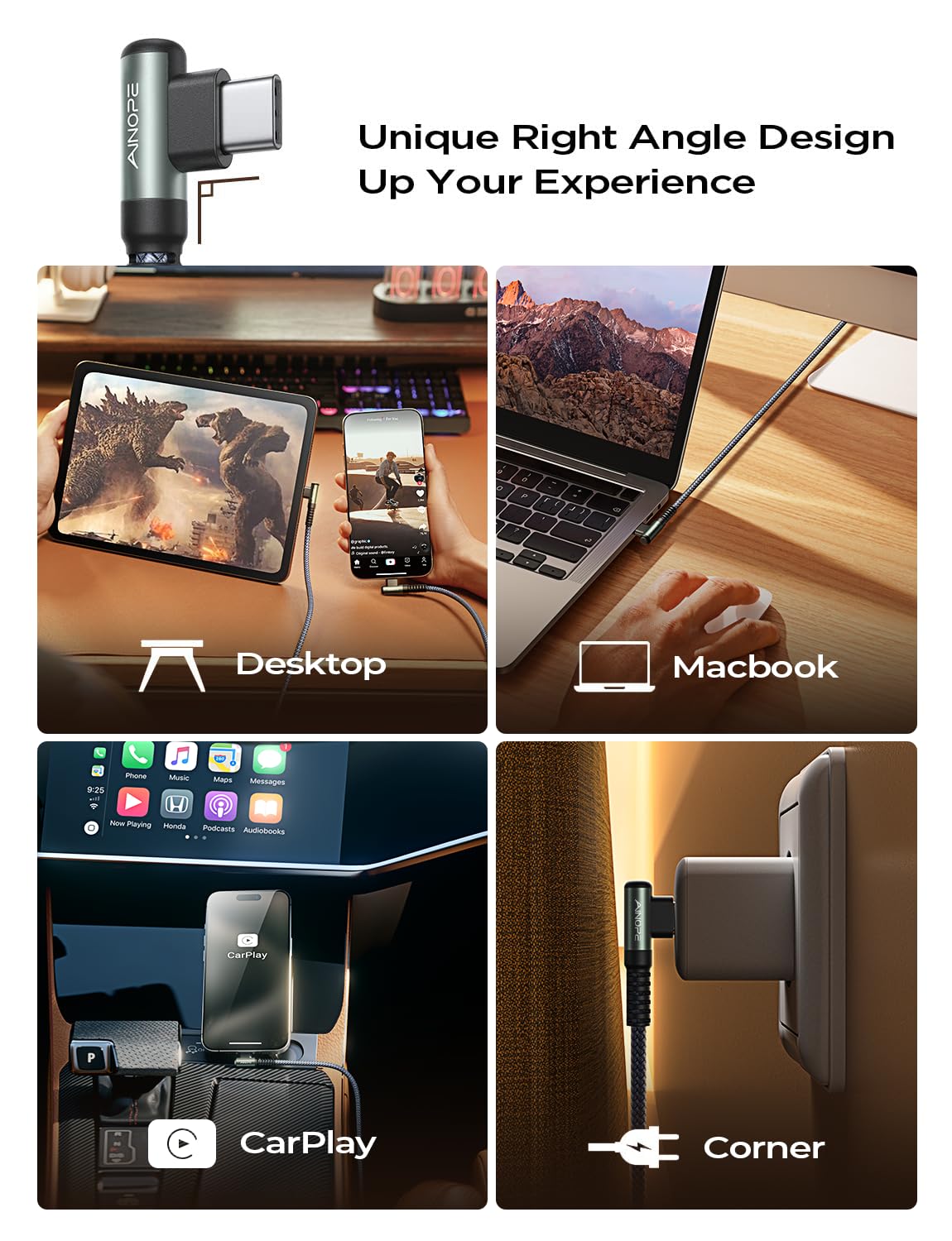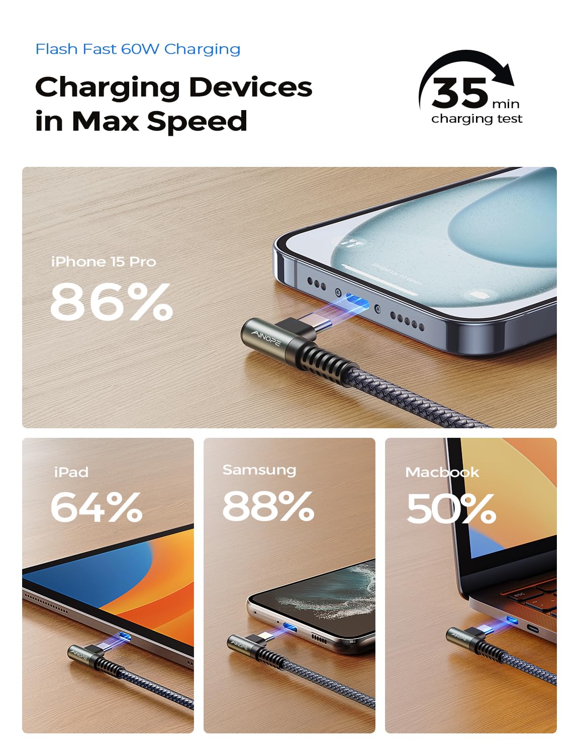 [Upgraded Exclusive Right Angle Design] This USB C to USB C cable with an innovative 90 degrees " L " design. It can effectively avoid the bending of the cord end and extend the life of the charging cable. Its user-friendly design more convenient and comfortable for playing games, watching videos, reading e-books when you charging.